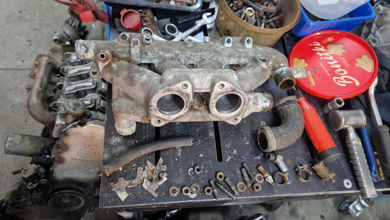 Dostałem też luzem inne części, jak tu ten kolektor dolotowy. Fabrycznie był tu podwójny poziomy gaźnik.