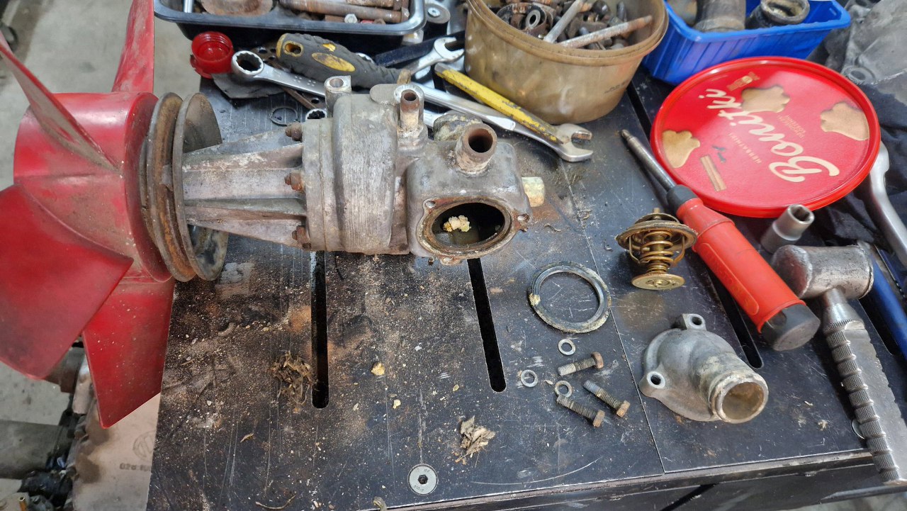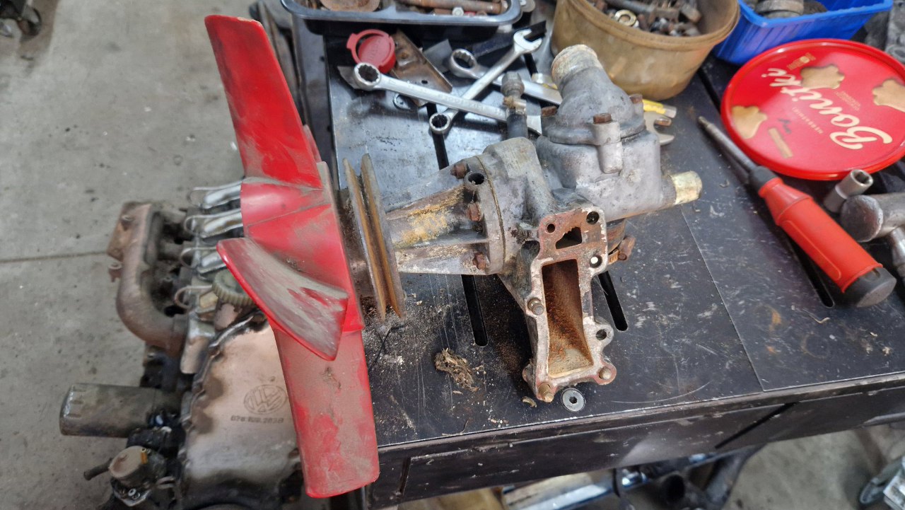 Pompa wody, razem z kawałkiem magistrali wodnej i obudową termostatu, są przykręcane do bloku z boku, jako jeden zestaw. Pompa wody ma wiatrak jako integralną część koła pasowego, wciskanego na prasie na oś pompy. Ciekawe rozwiązanie. Do tego oczywiście należy dodać, że pompa wody (jak i większość części do tego silnika) jest totalnie niedostępna i trzeba będzie wymyślić jej regenerację.