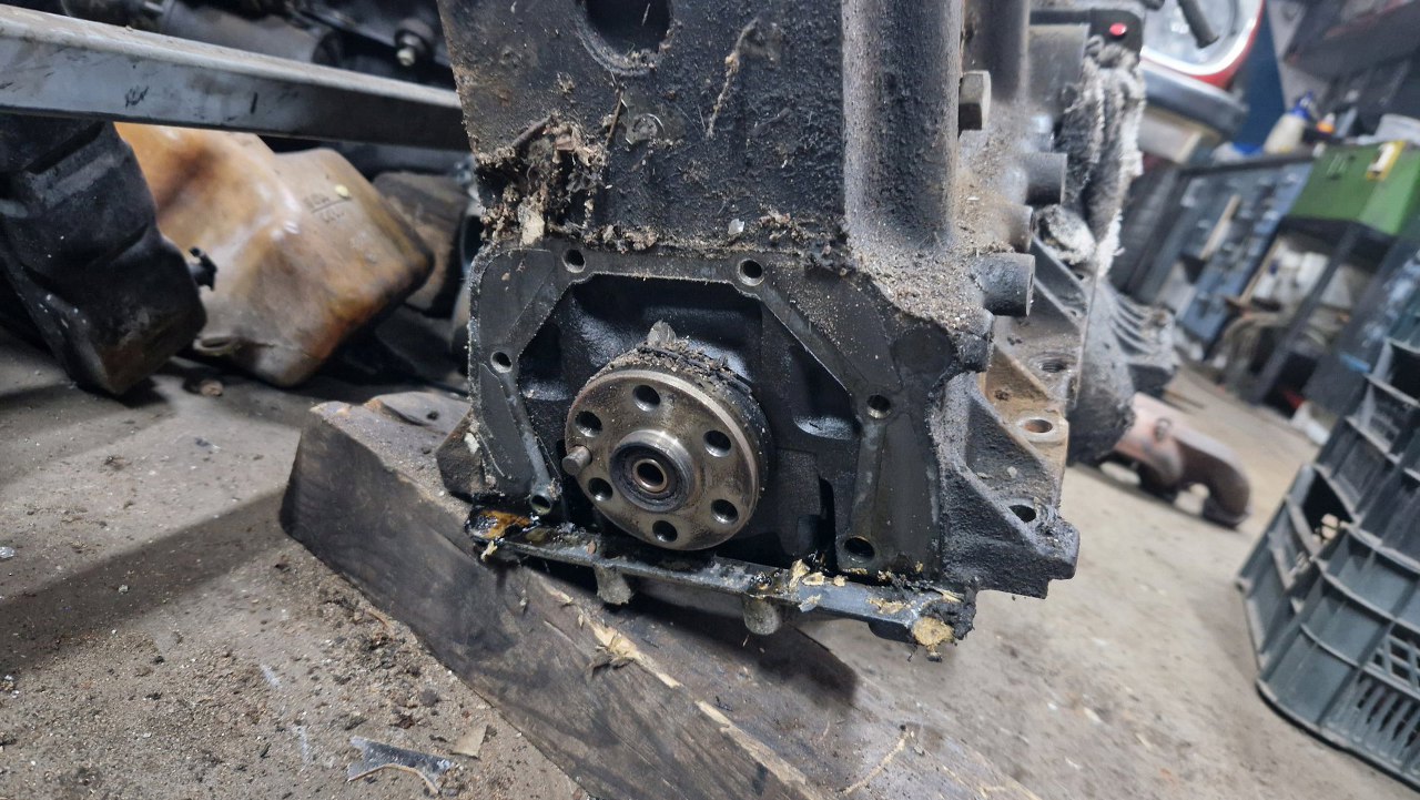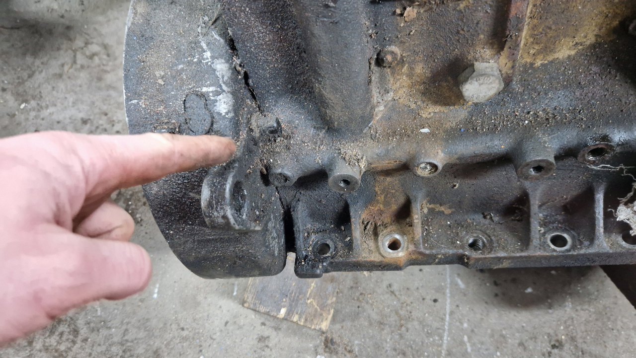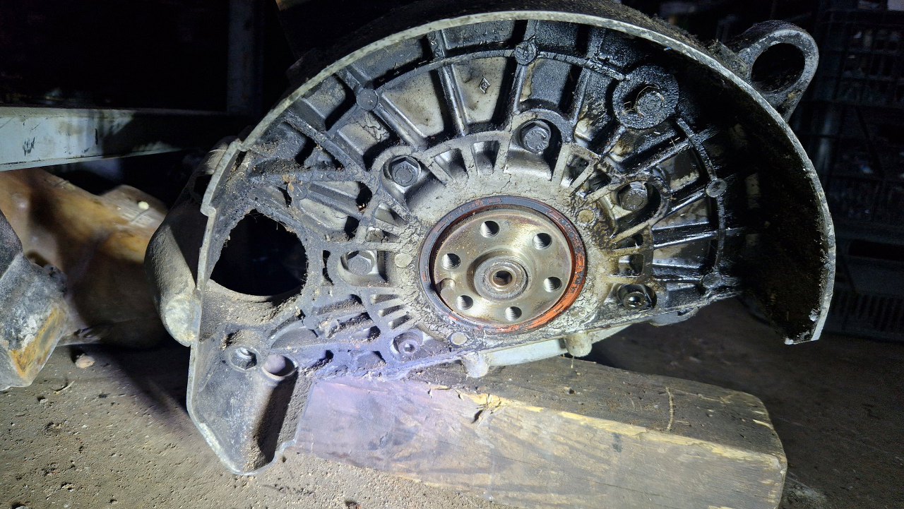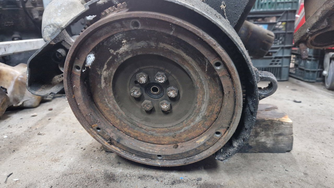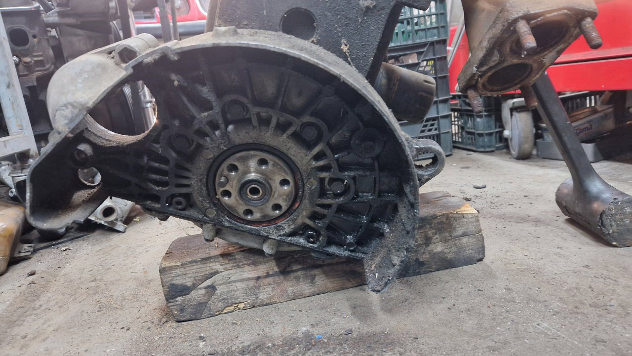 Z tyłu nie mamy klasycznego dzwona skrzyni, bo silnik do skrzyni mocowany jest w okolicach płaszczyzny miski oleju. Tu jest tylko osłona koła zamachowego, bez żadnych solidnych mocowań. Dlatego też ten silnik rozkładam na podłodze, bo nie mam go jak powiesić na stojaku.