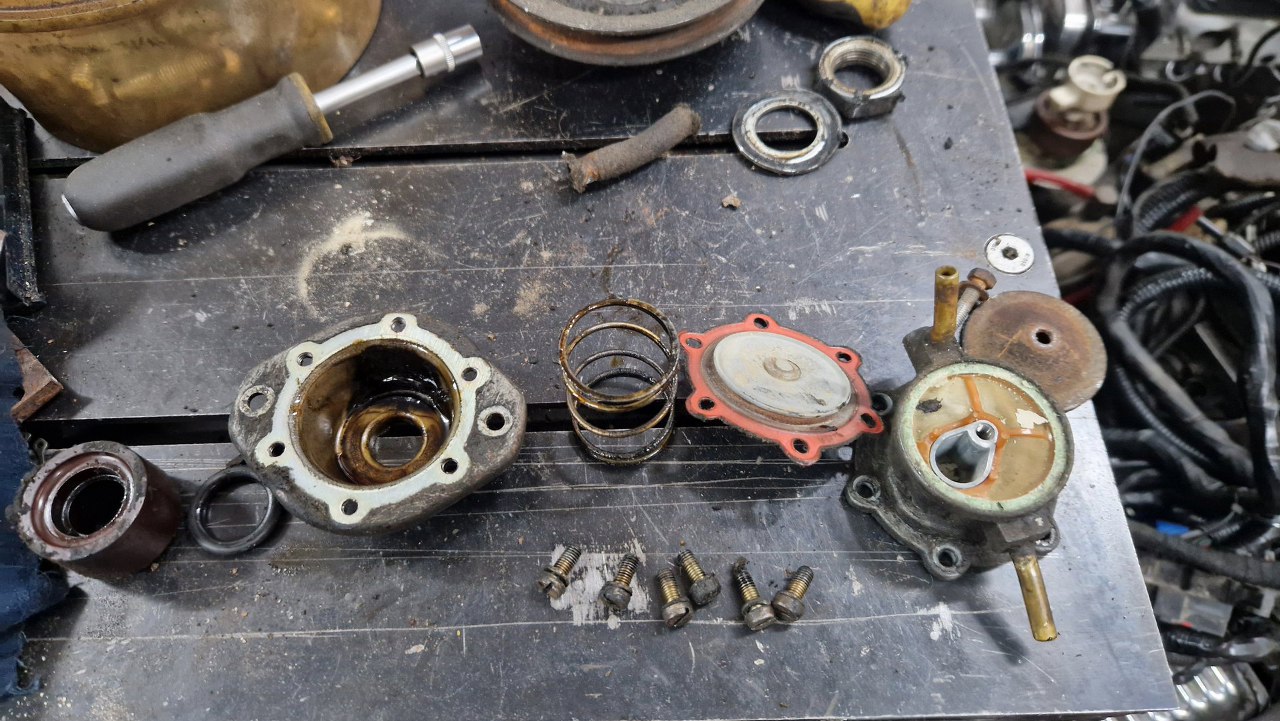 Potem nie mogłem zdjąć pompy, coś ją w środku trzymało. Postanowiłem ją rozkręcić, co w sumie mogło nie być potrzebne, bo w końcu udało mi się ją zdjąć. Pompę jednak i tak trzeba odnowić, więc już jest rozkręcona.