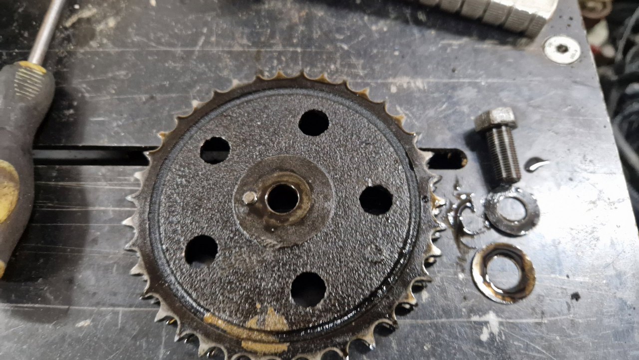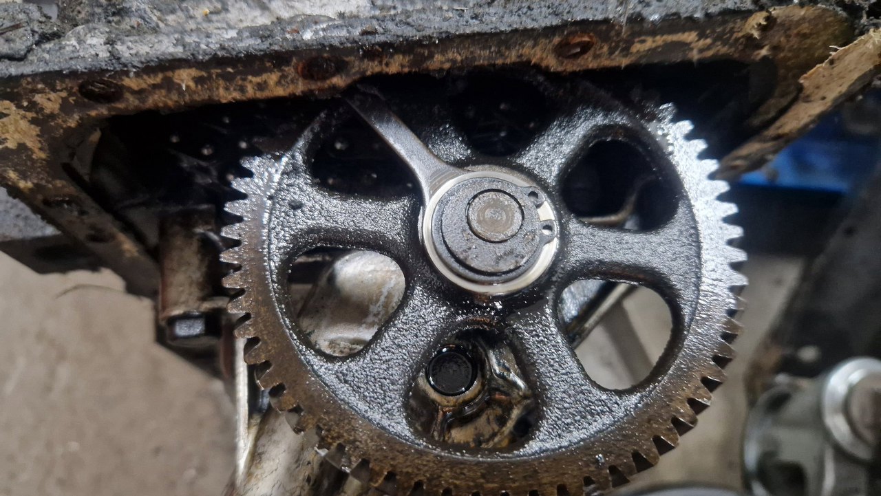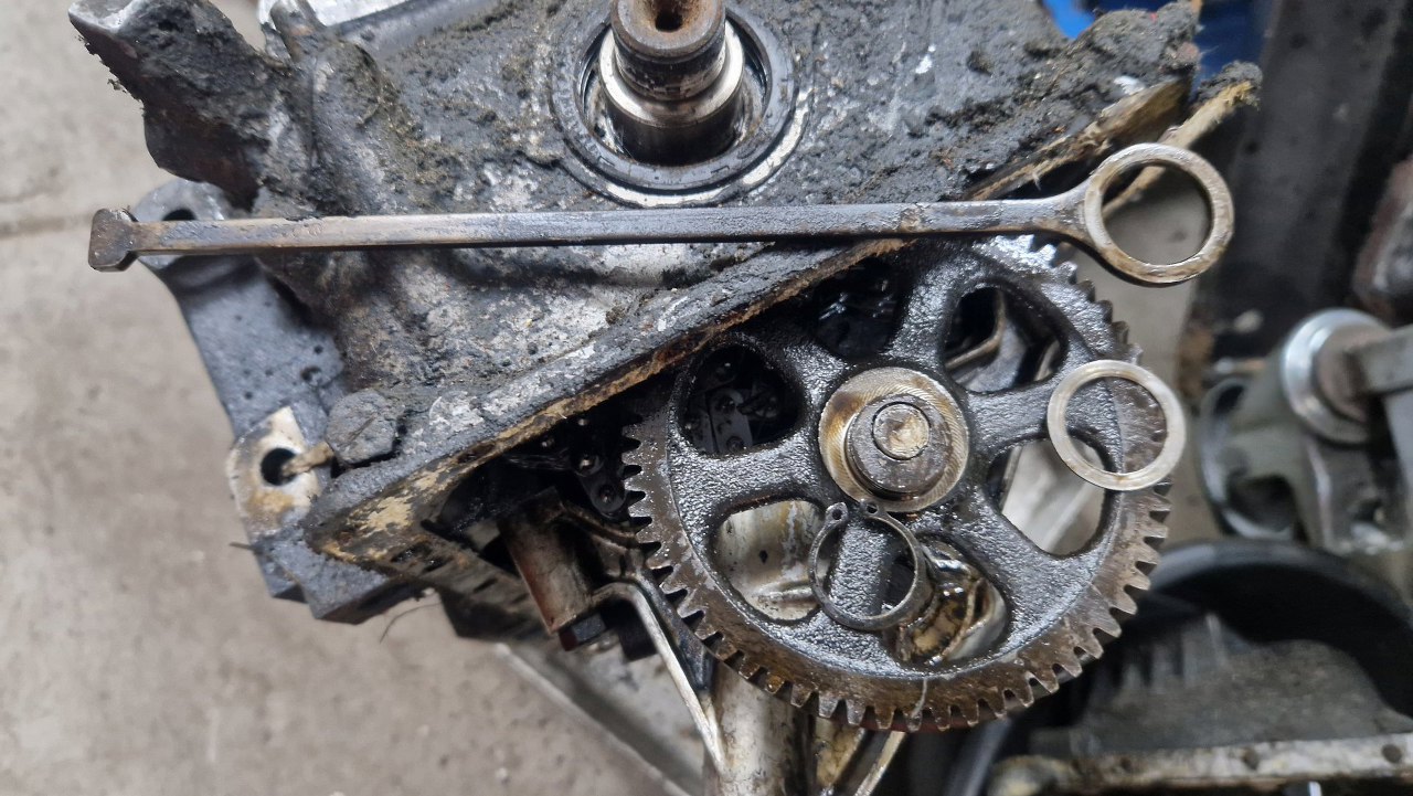 Z wału zsunąłem kółko napędzające pompę oleju. Koło łańcucha nie chce tak łatwo zejść.