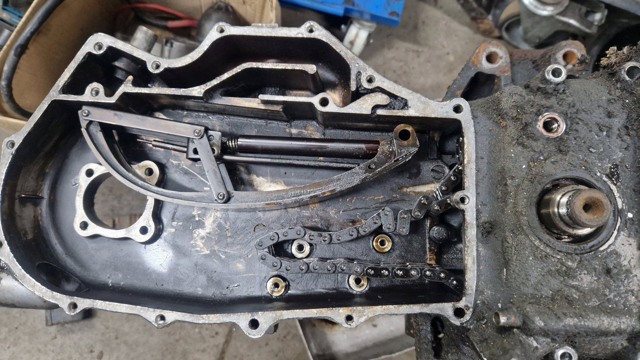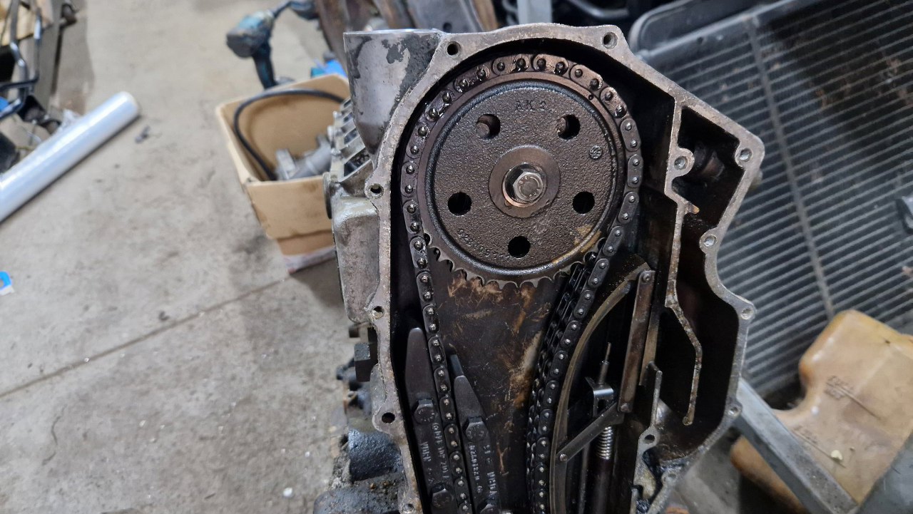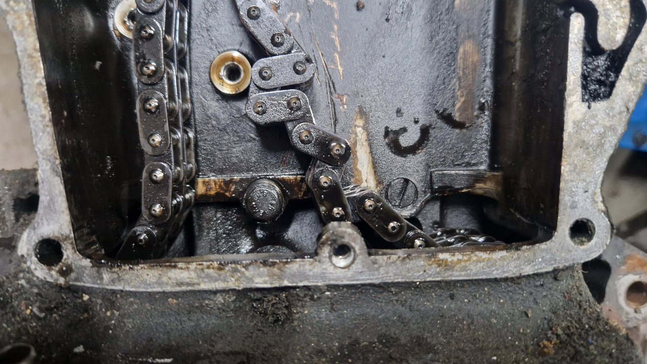 A pod nią mamy widok na łańcuch rozrządu, dwa ślizgi po lewej i napinacz po prawej.