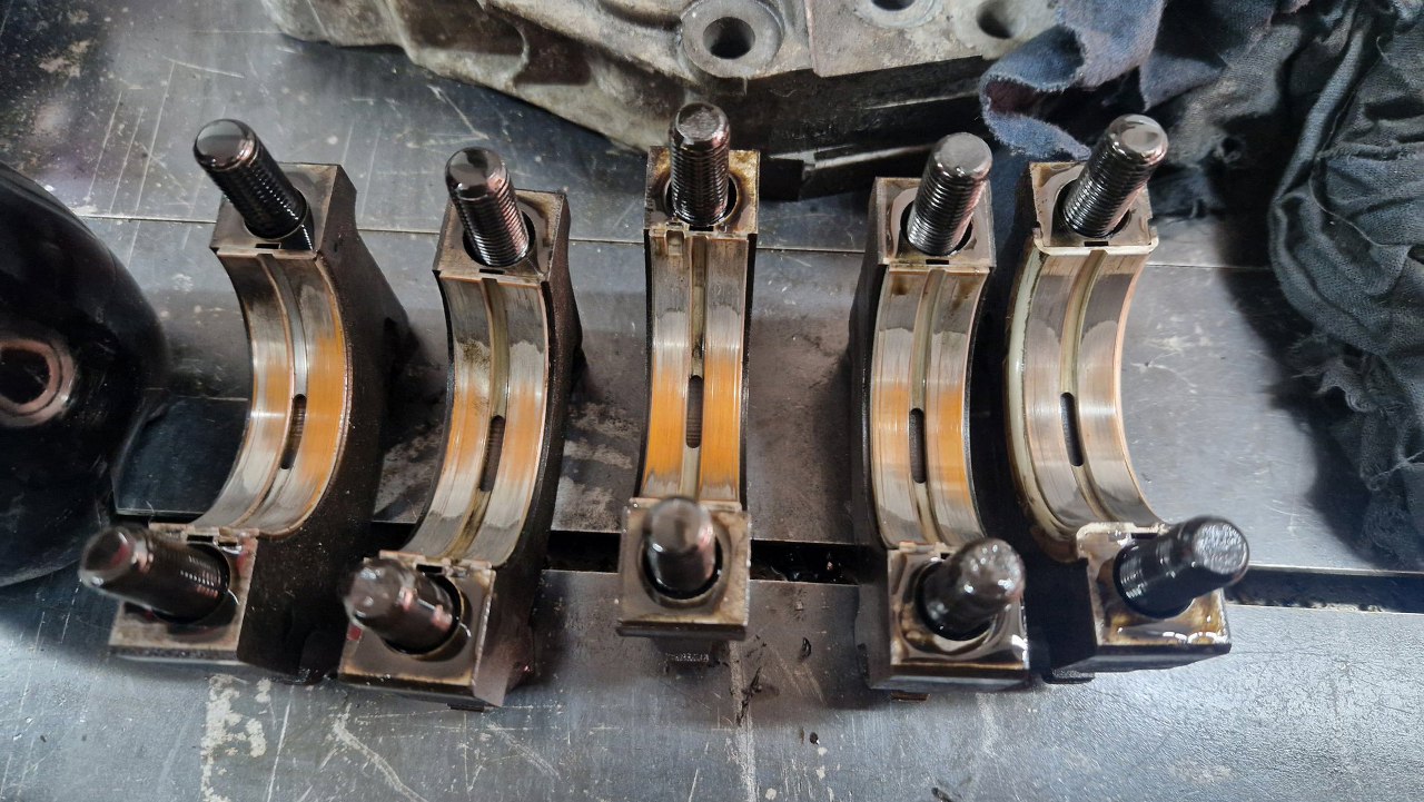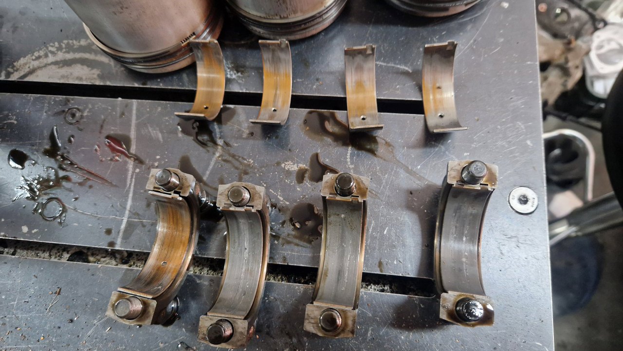 Panewki korbowe sporo zużyte. Coś na pierwszym cylindrze (po lewej) musiało się dziać niedobrego, bo panewka jest mocno zgrzana i nie trzyma się w korbowodzie, tylko wypada.