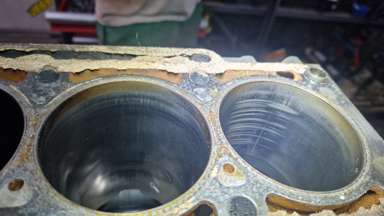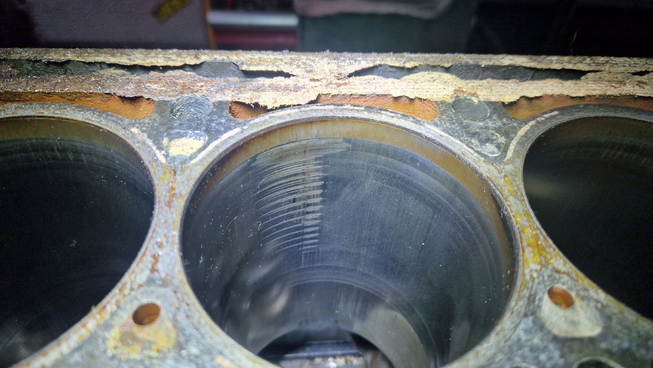 A w bloku odkryłem ciekawe uszkodzenia gładzi cylindrów. Mają postać równoległych kresek. Pomysl mam taki, że silnik jest pochylony na tą stronę. Silnik długo stał, dostała się wilgoć i lekko zardzewiał. Tylko, że musiało to się zdarzyć kilka razy, bo śladów jest sporo więcej, niż pierścieni na tłoku.