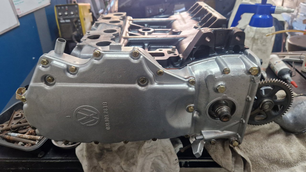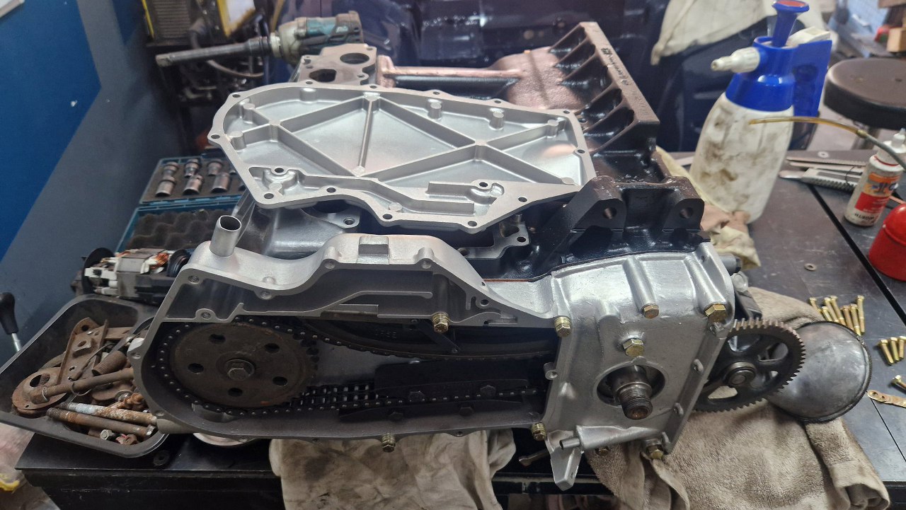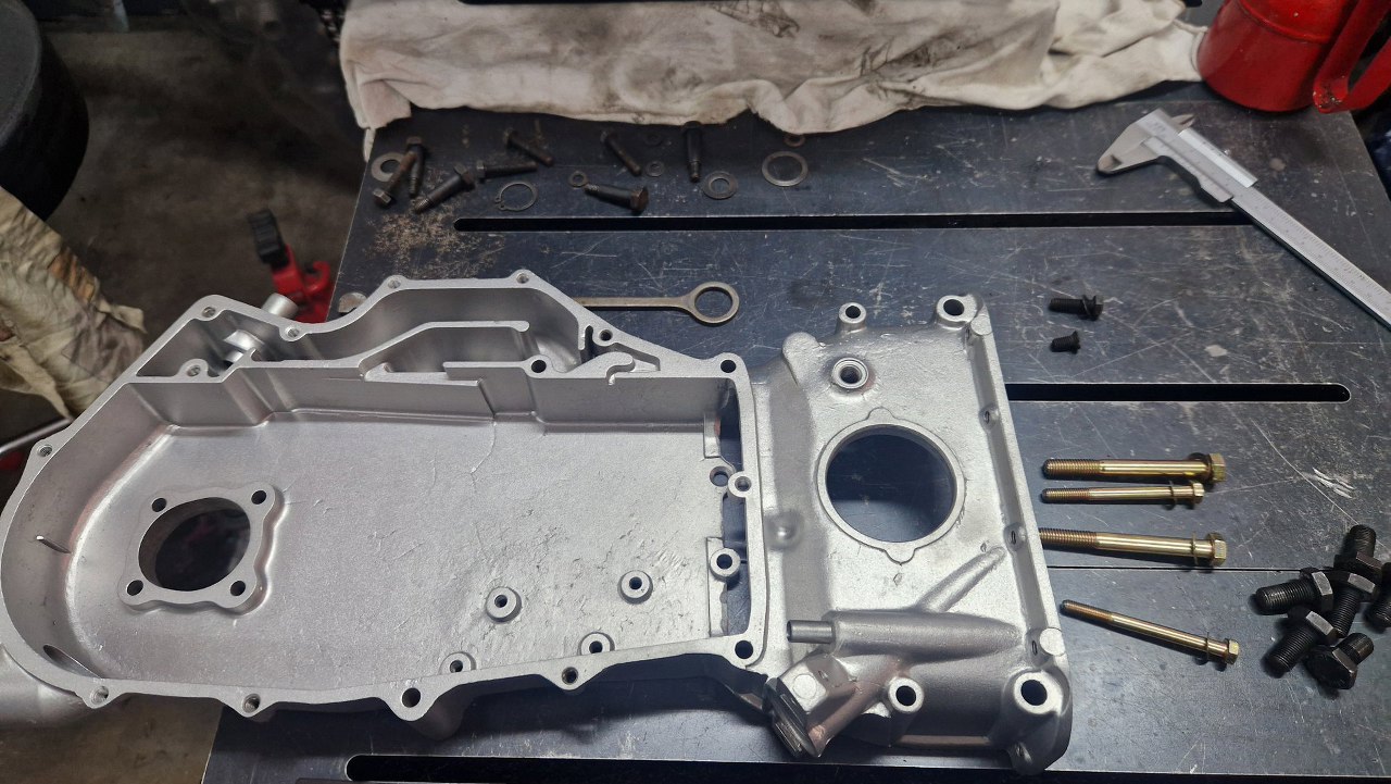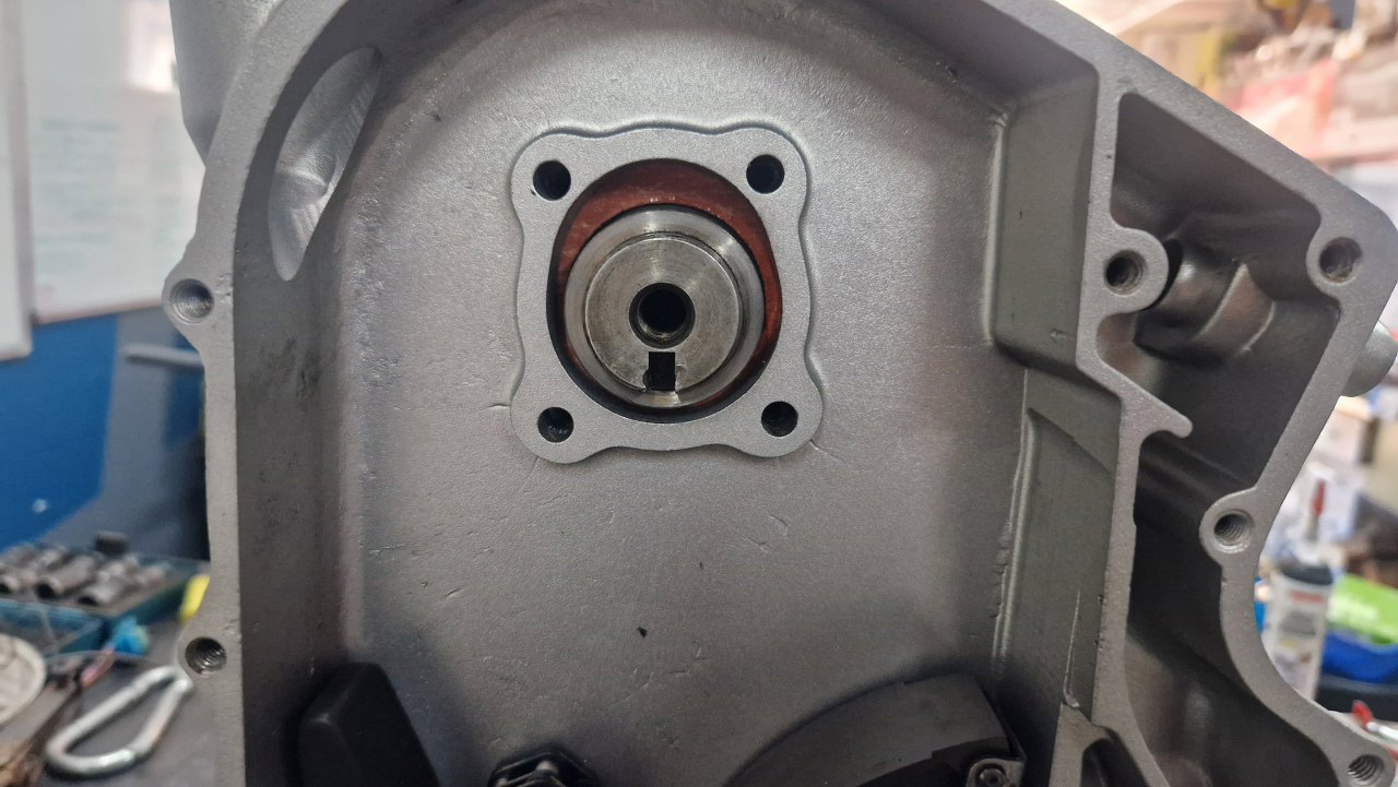 Przykręciłem pokrywę łańcucha. Niestety okazało się, że zestaw uszczelek, mimo, że naprawdę kompletny, nie zawiera uszczelniaczy przedniego i tylnego wału. Musiałem je dopiero zamówić. Tu uszczelniacz jeszcze dość łatwo włożę, ale z tyłu nie będę montował pokrywy wału, żeby móc go wcisnąć poza silnikiem. A jak pokrywy nie założę, to i miski oleju...