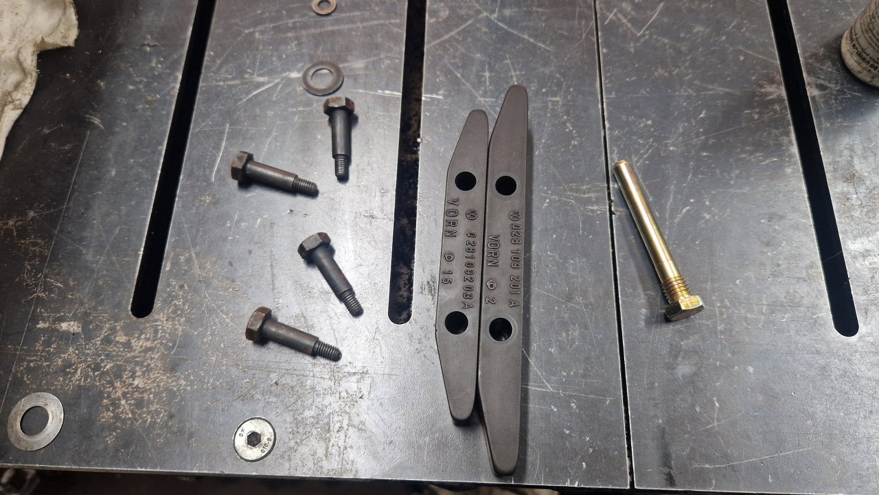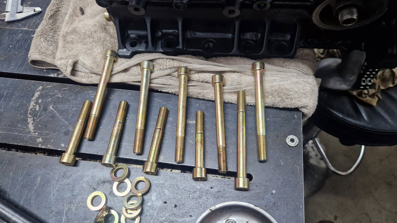 Śruby głowicy mają dwie długości. Dobrałem je i ułożyłem w kolejności, żeby łatwo je włożyć na miejsce. Podkładki pod nie są dość grube.