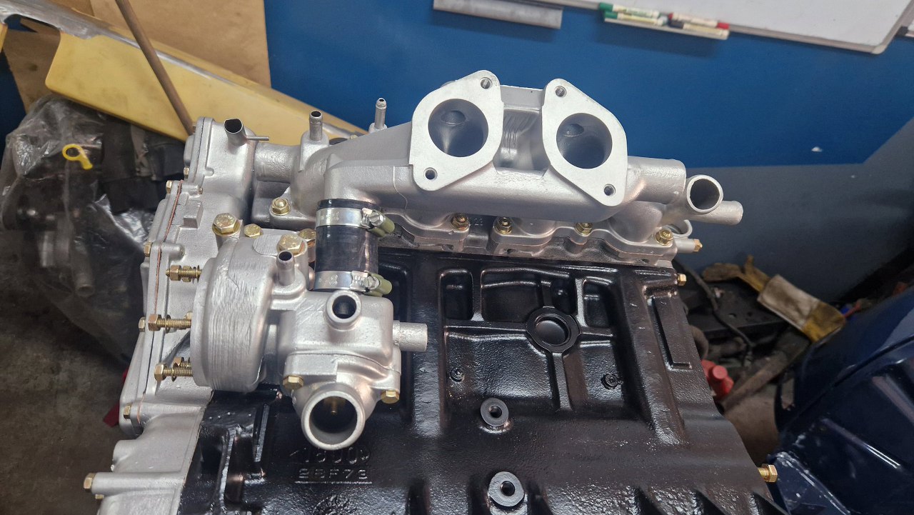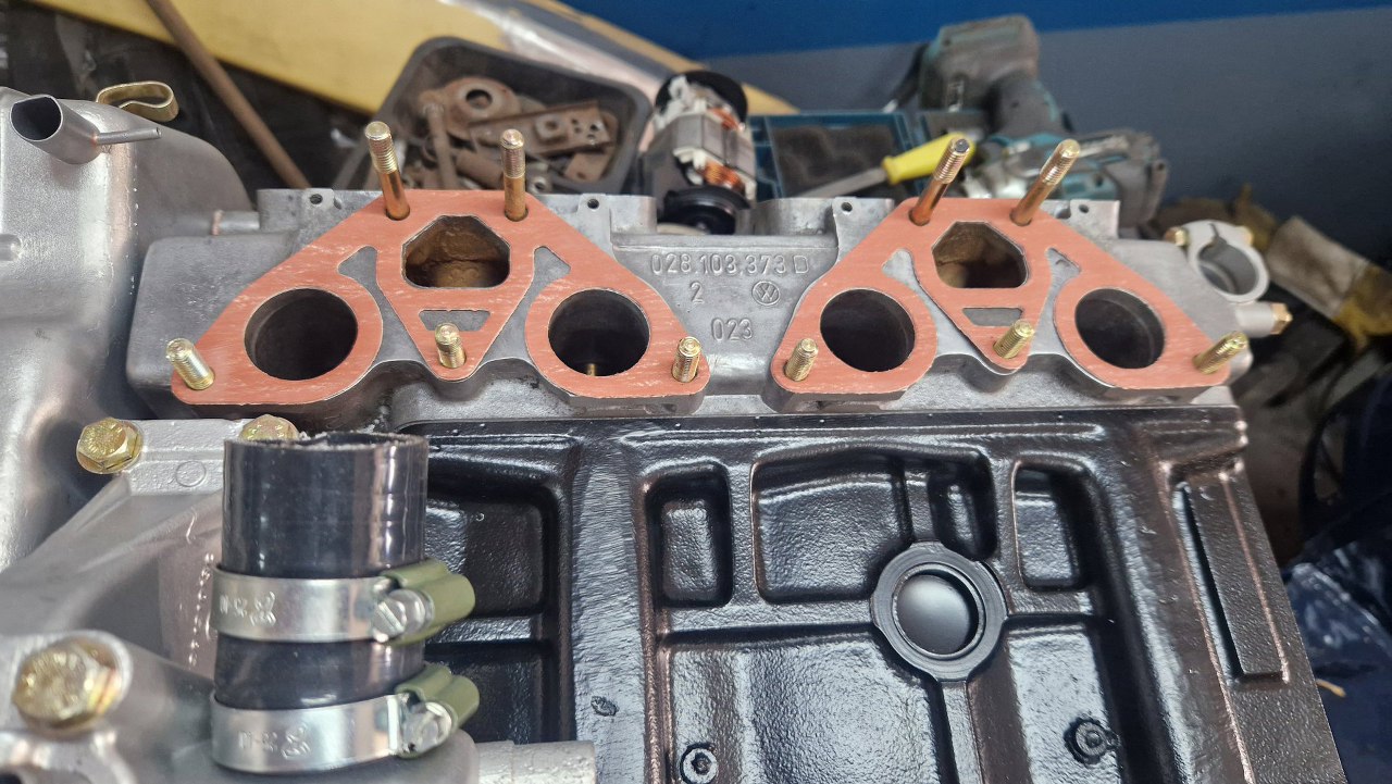 Wkręciłem szpilki mocujące kolektor dolotowy i założyłem jego uszczelki. Górne otwory to kanały wodne. Z kolektora wodnego wystaje króciec, który ma się łączyć z kanałem w kolektorze dolotowym Rurka gumowa była oczywiście mocno sparciała, więc dałem nowy wąż, akurat miałem pod ręką silikonowy.