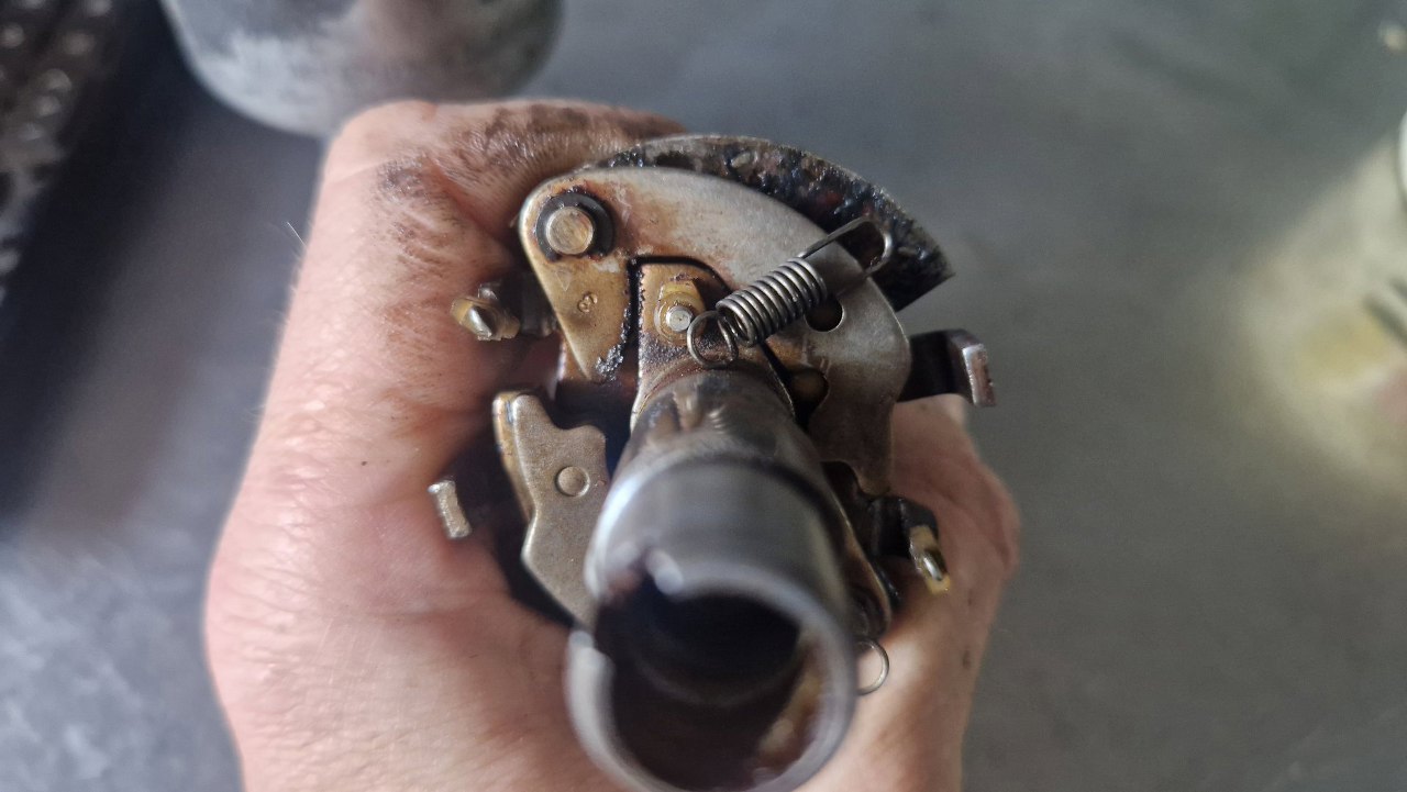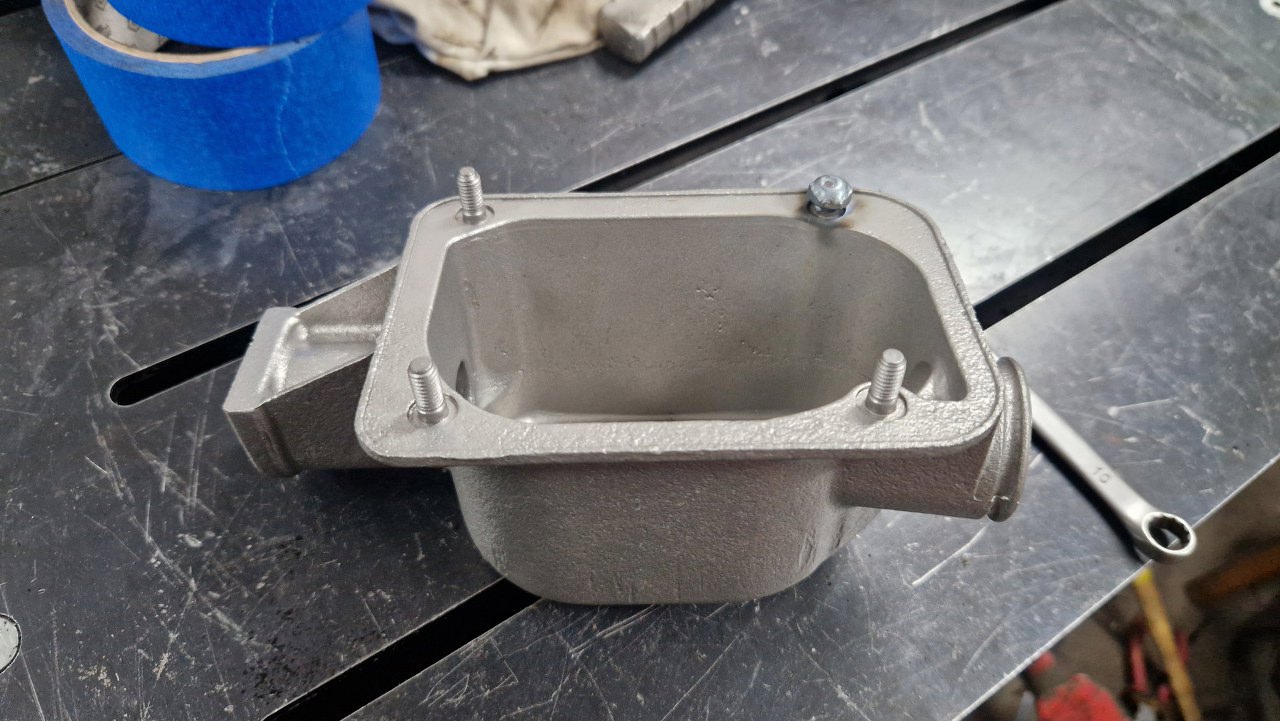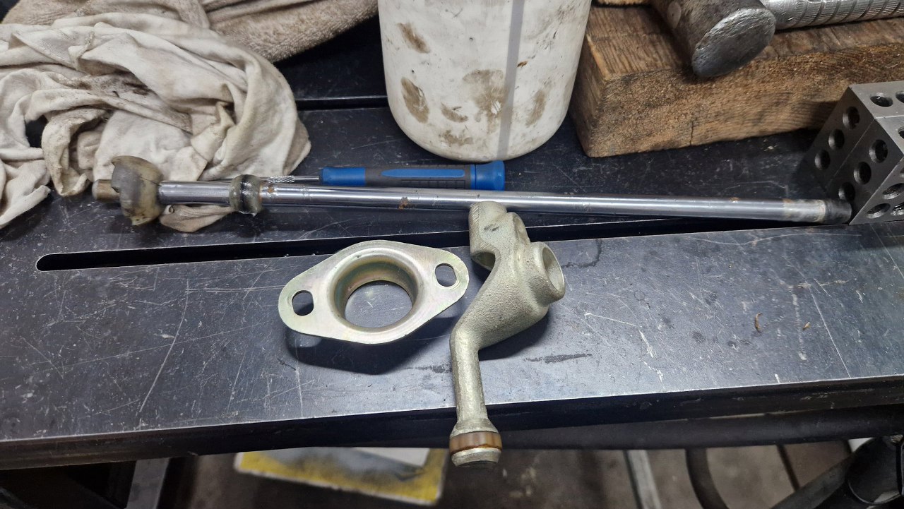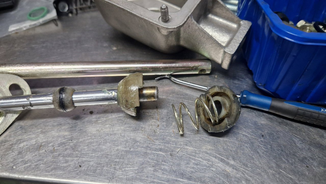 Zabieram się teraz za osprzęt silnika. Z zaległych rzeczy mam jednak jeszcze dźwignię zmiany biegów, którą też teraz ogarnę. Obudowa dźwigni miała jedną urwaną szpilkę, która stawiała zaskakujący opór przy wykręcaniu. Skończyło się na kilkunastu przyspawanych i urwanych nakrętkach i wizycie u frezera, który pozbył się jej skuteczniej niż ja.
