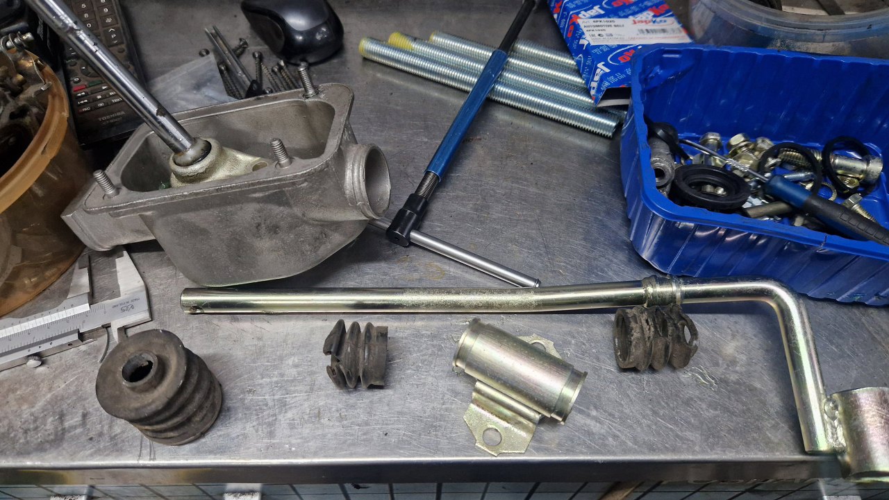 A to pozostałe elementy, czyli pręt przenoszący ruch dźwigni do skrzyni. Gumki osłaniające są w przeciętnym stanie, ale nie dałem rady dobrać nic sensownego. Póki co muszą wystarczyć. Docelowo trzeba będzie poszukać gumek może od osłon prowadnic zacisków hamulców tarczowych?