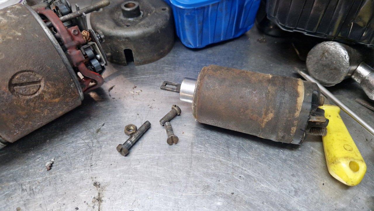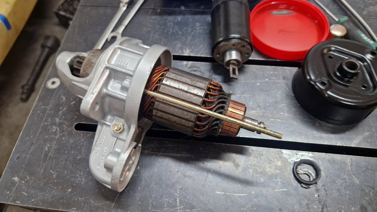 Niedługo potem miałem wszystko odnowione. Części eksploatacyjne, czyli tulejki, bendiks, szczotki i komutator są w bardzo dobrym stanie i nie wymagają serwisu. Przykręciłem szpilki do przedniej części obudowy, montując tu wirnik.