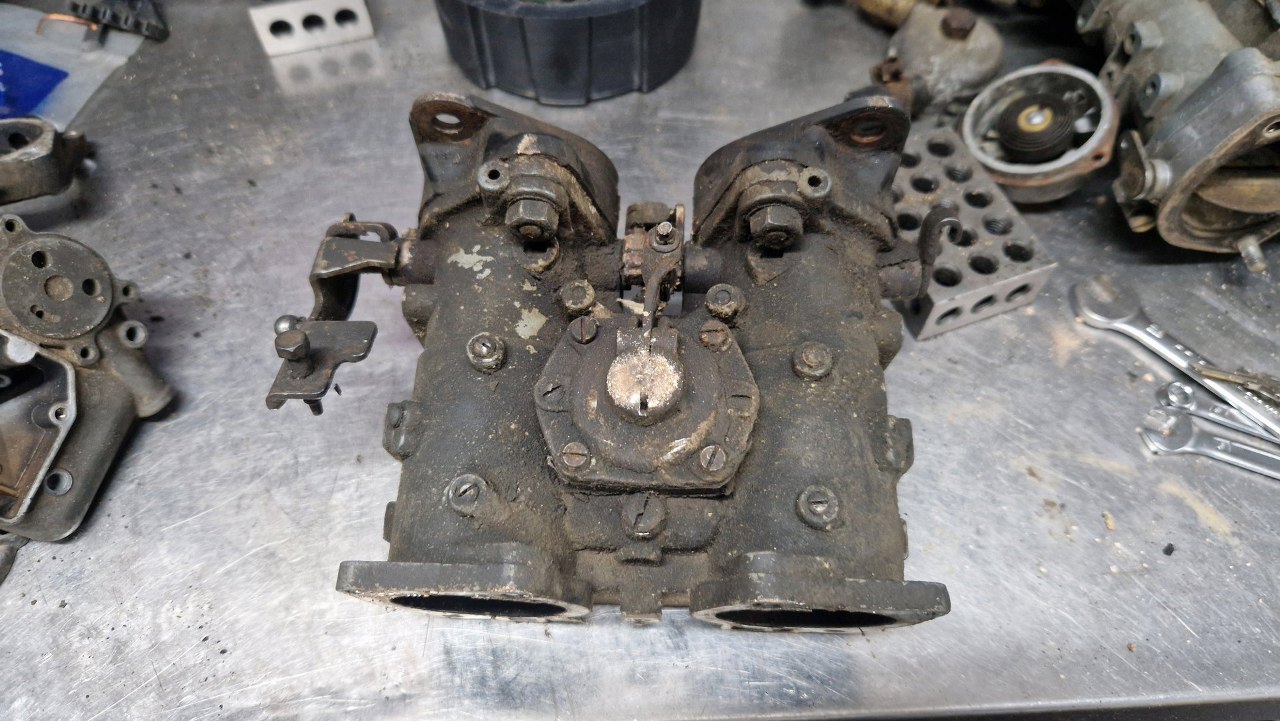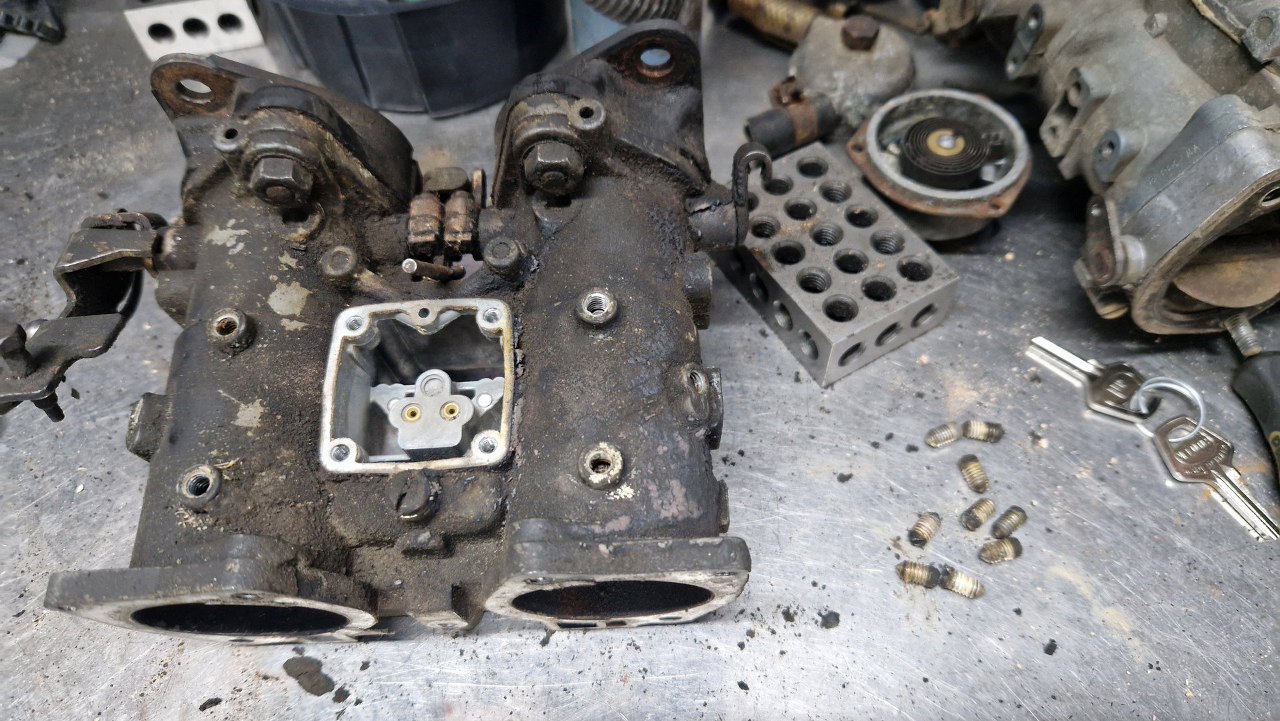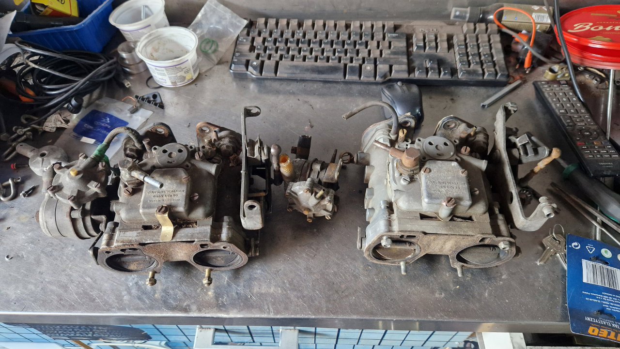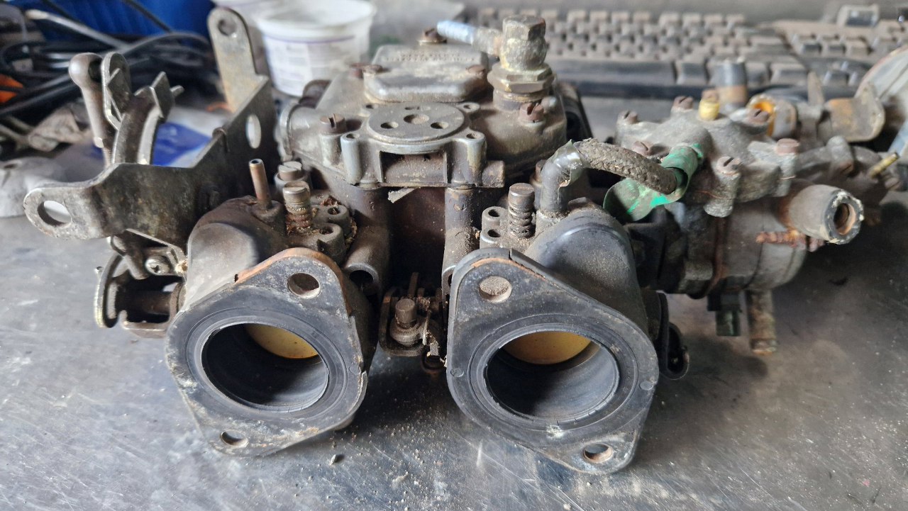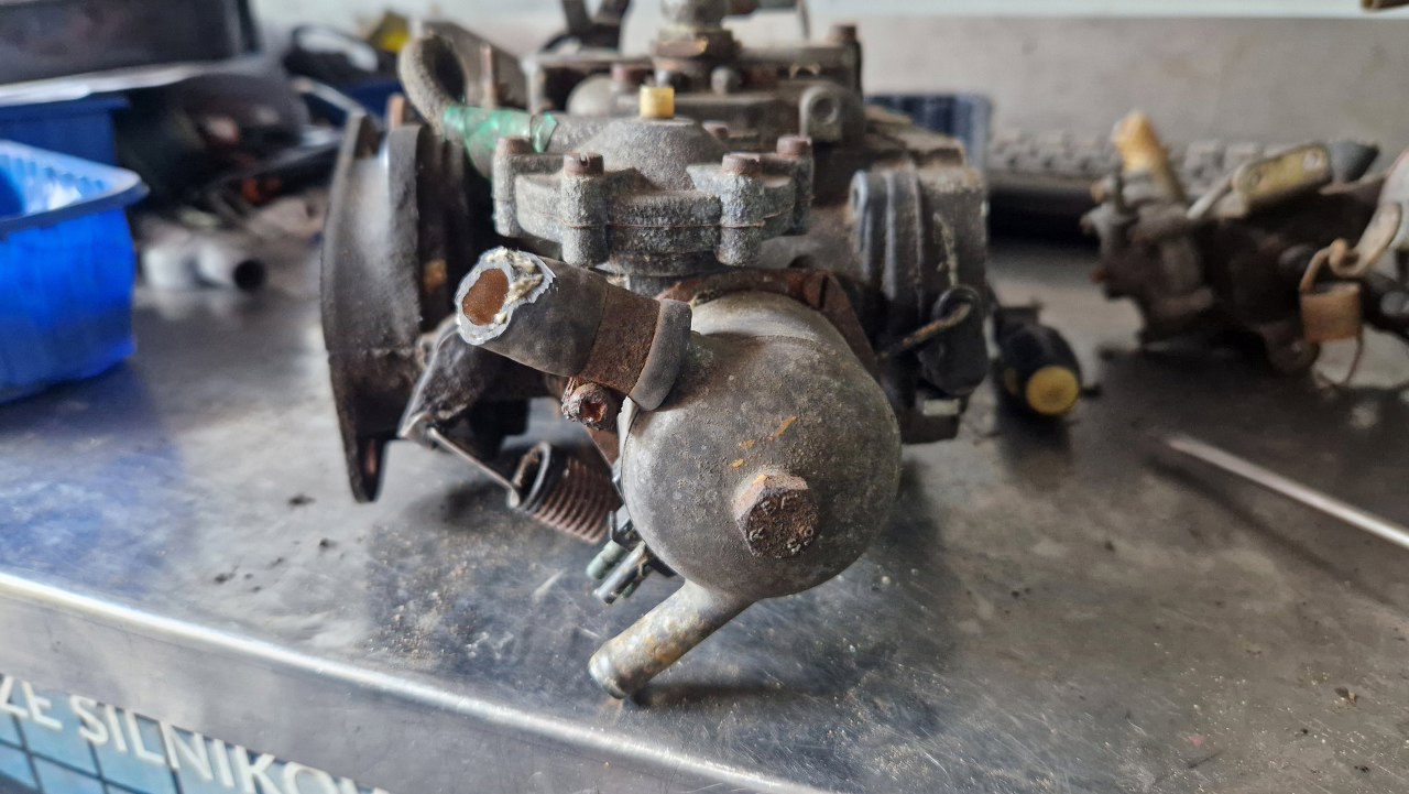Zajmę się traz gaźnikiem do tego silnika. Jest to poziomy, podwójny gaźnik Solex 40DDHT. Dostałem dwa takie, jeden z tego silnika 1.8, po lewej (i ten będę robił) i drugi na wszelki wypadek, z 1.6. Są między nimi różnice w dyszach, ale ogólnie są prawie identyczne.