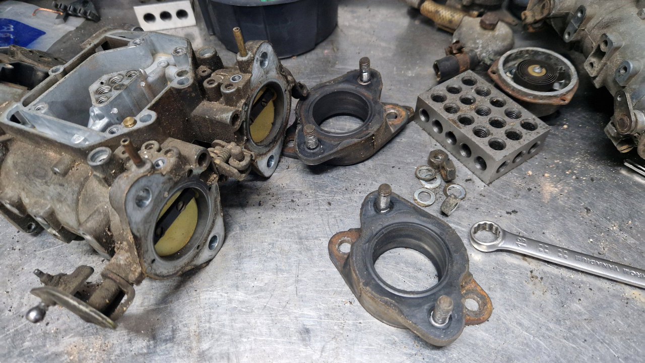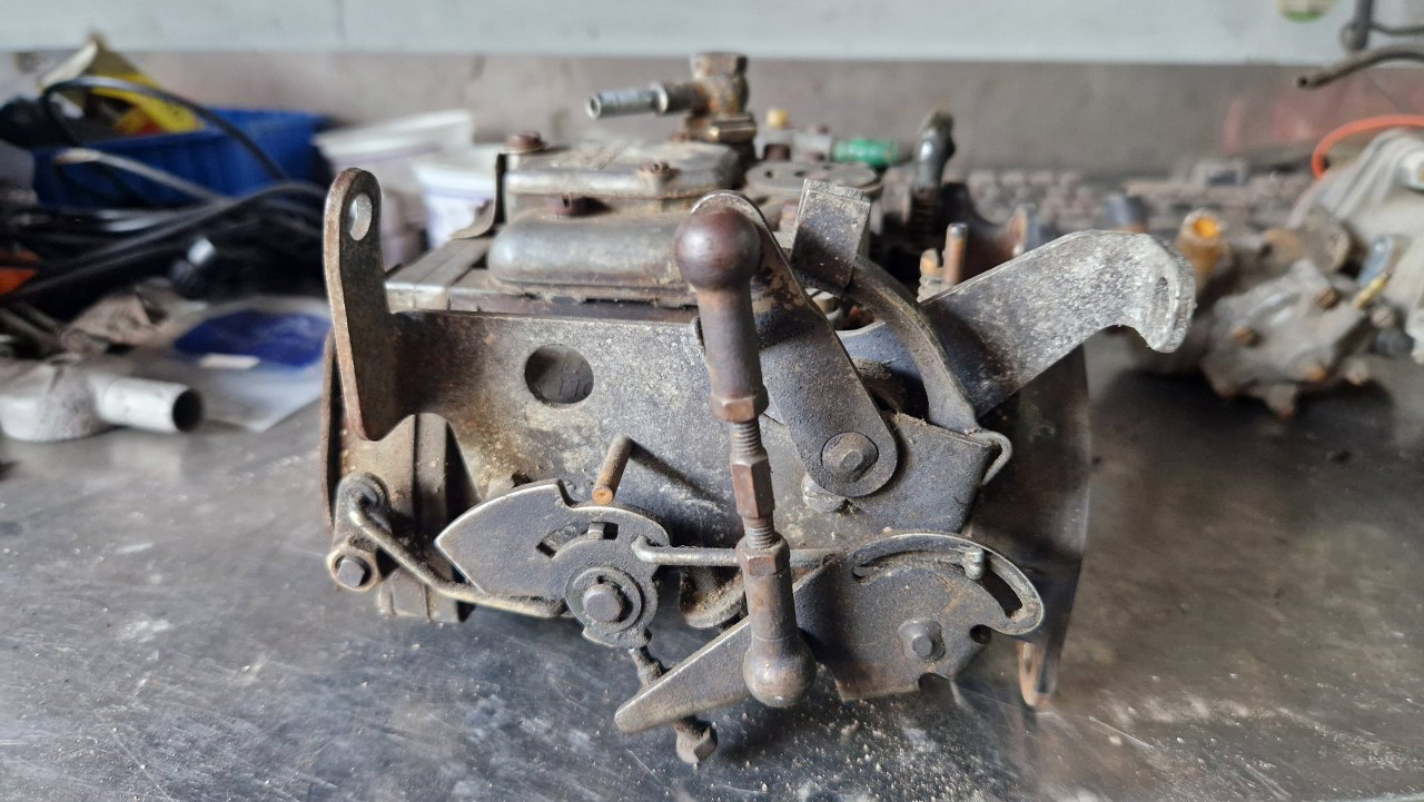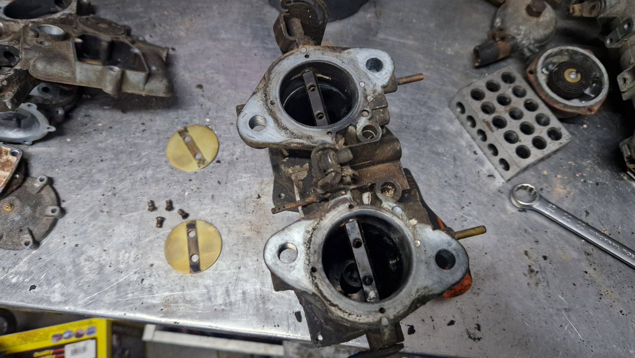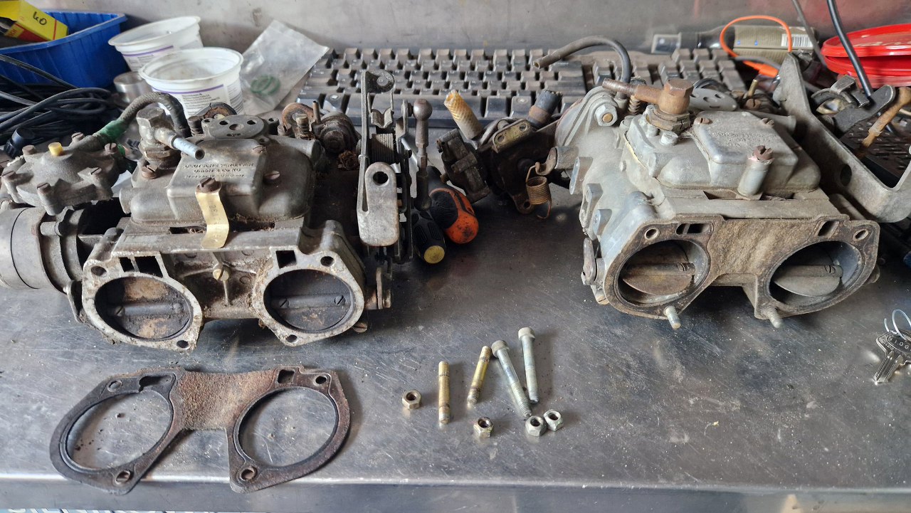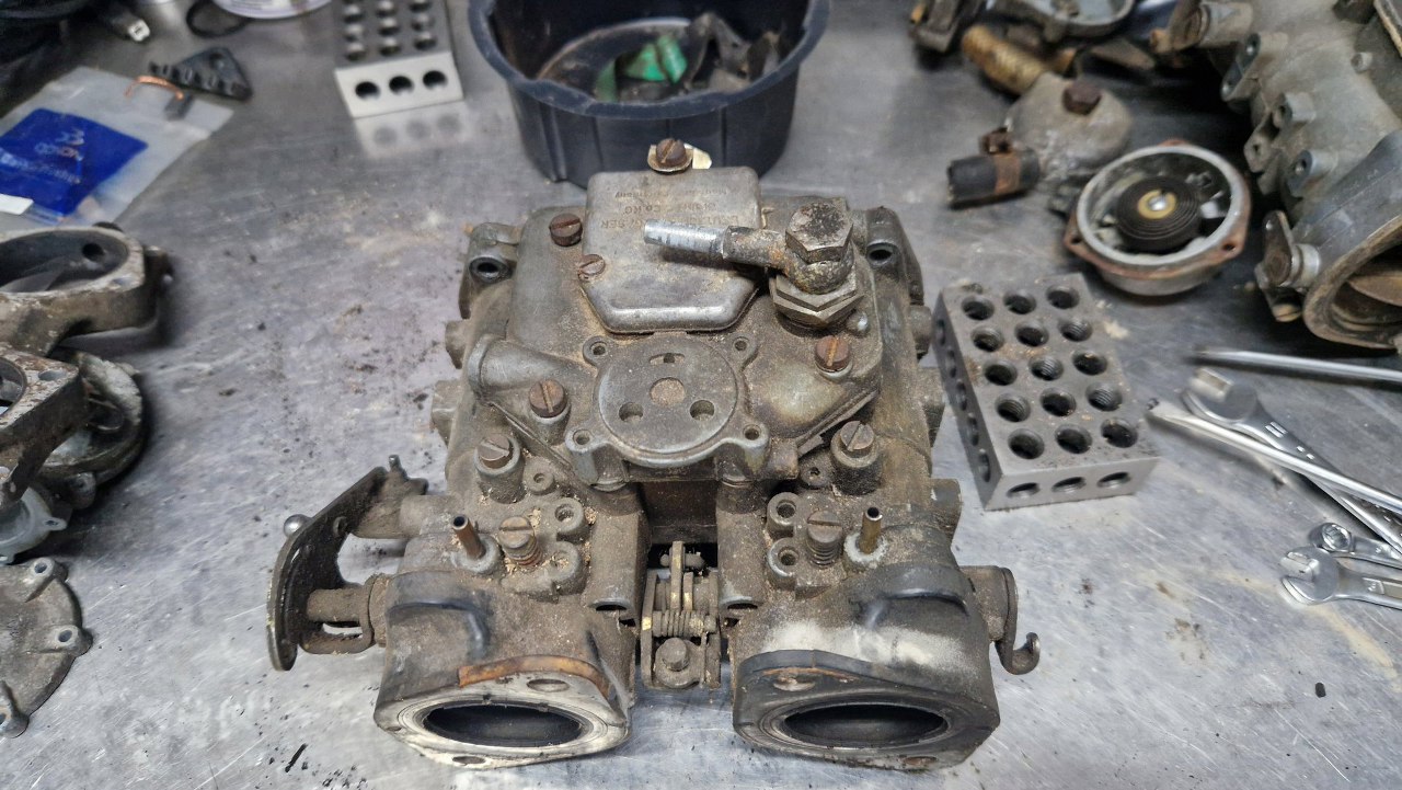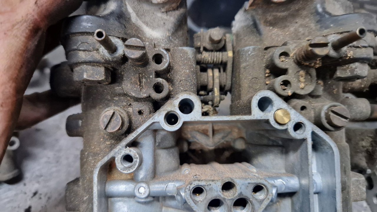 Zajmę się traz gaźnikiem do tego silnika. Jest to poziomy, podwójny gaźnik Solex 40DDHT. Dostałem dwa takie, jeden z tego silnika 1.8, po lewej (i ten będę robił) i drugi na wszelki wypadek, z 1.6. Są między nimi różnice w dyszach, ale ogólnie są prawie identyczne.