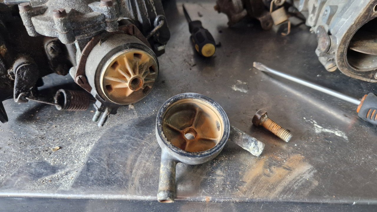 Oprócz grzania wodą jest też tu dodatkowe wejście na kabelki - grzałka ssania jest elektryczno - wodna, pierwszy raz widzę takie połączenie. Dalsza część mechanizmu, w tle, okazała się pęknięta.