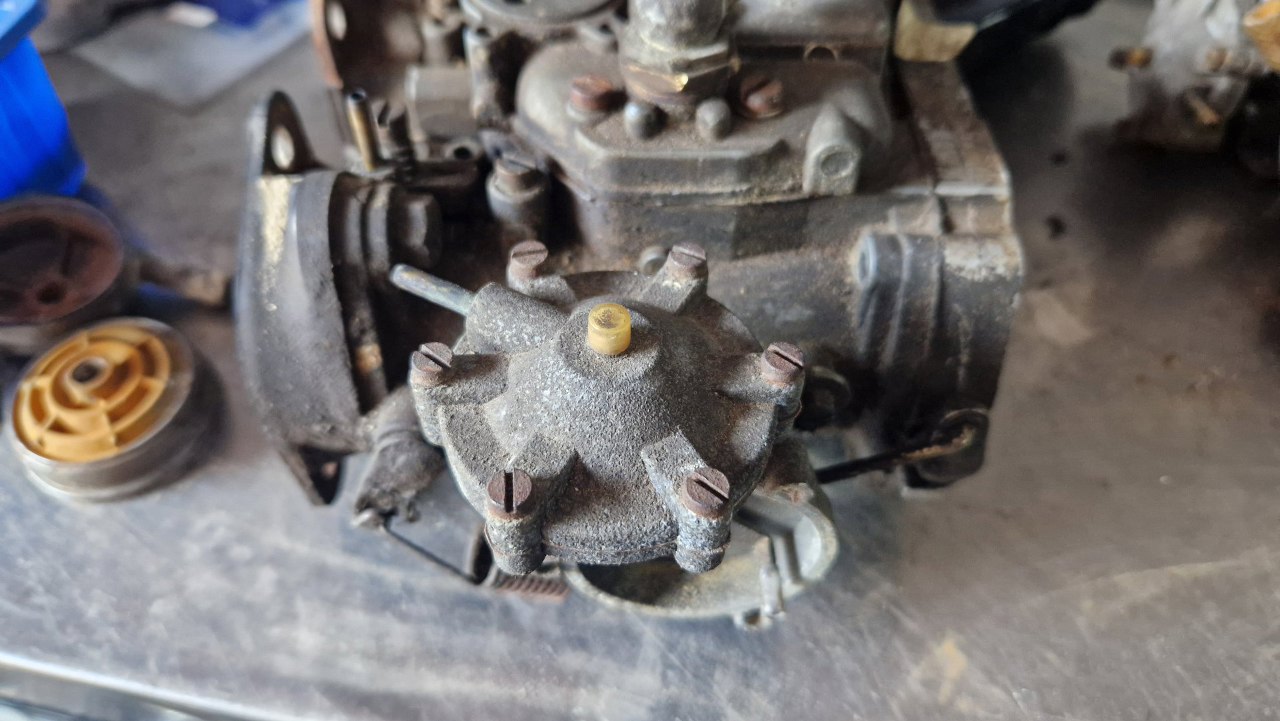 Dlatego pozyskam ją z drugiego gaźnika. Od góry mamy membrankę podciśnienia. Śruba regulacyjna ma jeszcze plastikowy kapturek zabezpieczający.