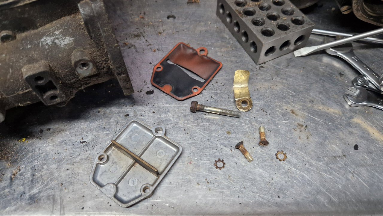 Po odwróceniu gaźnika mam dostęp do jego dolnej części. Tu jest membrana pompki przyśpieszacza.