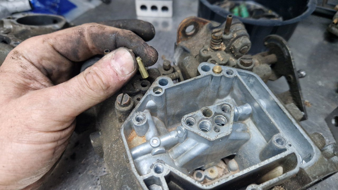 Są tu też zaworki zwrotne pompek przyśpieszacza, czyli ciężarek, który trzymam, i kulka na dnie kanaliku.