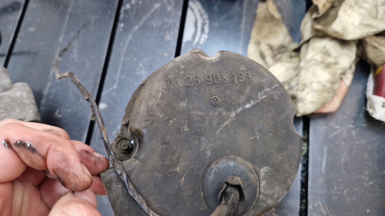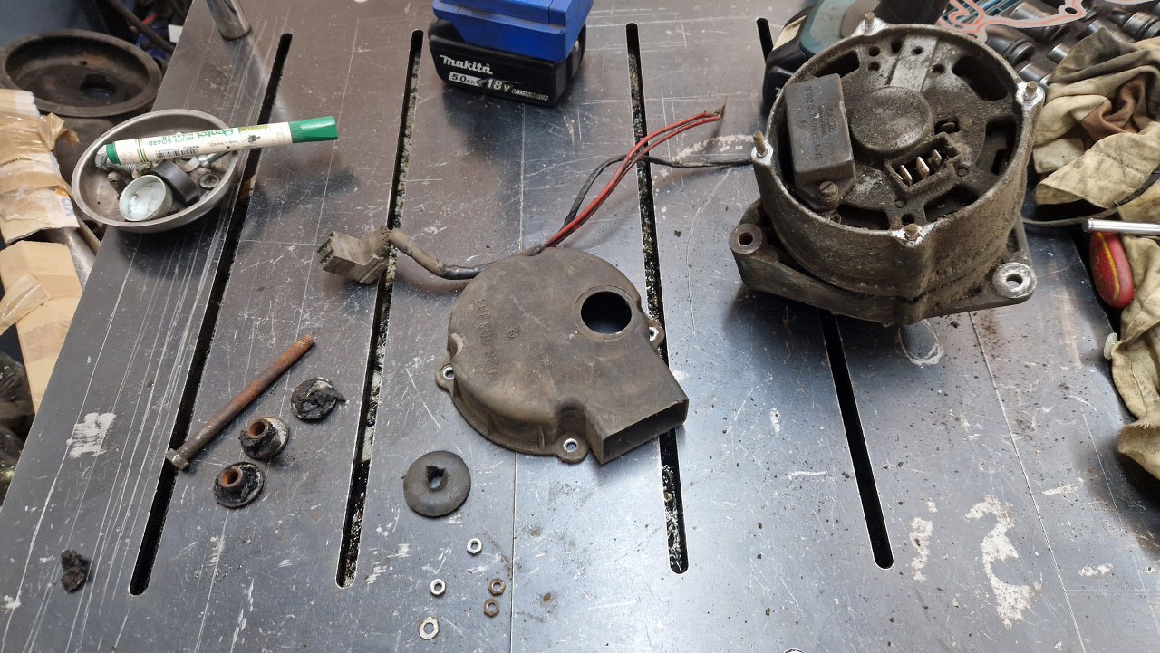 Obok, po lewej, widać śrubę mocującą. Trzy podkładki trzymają gumy izolujące alternator od mocowania. Są niestety tylko trzy z czeterch. Jedną trzeba będzie dorobić albo uzupełnić.