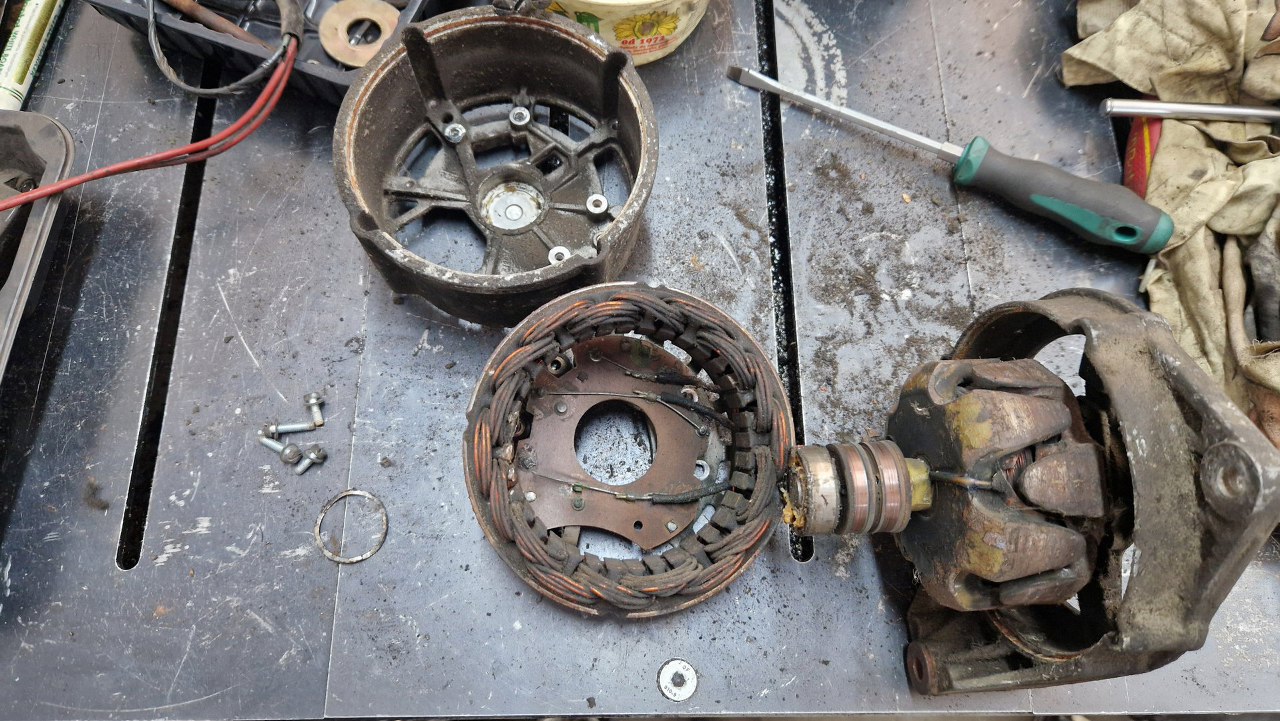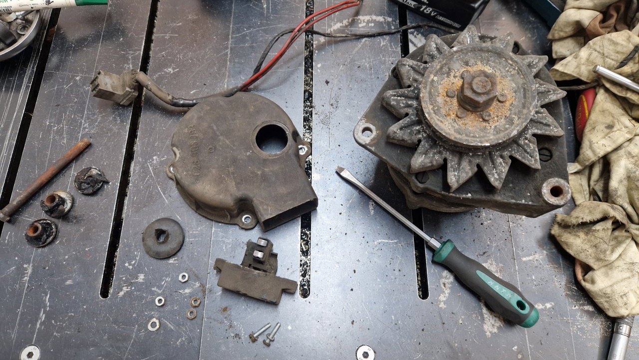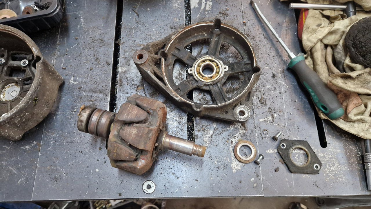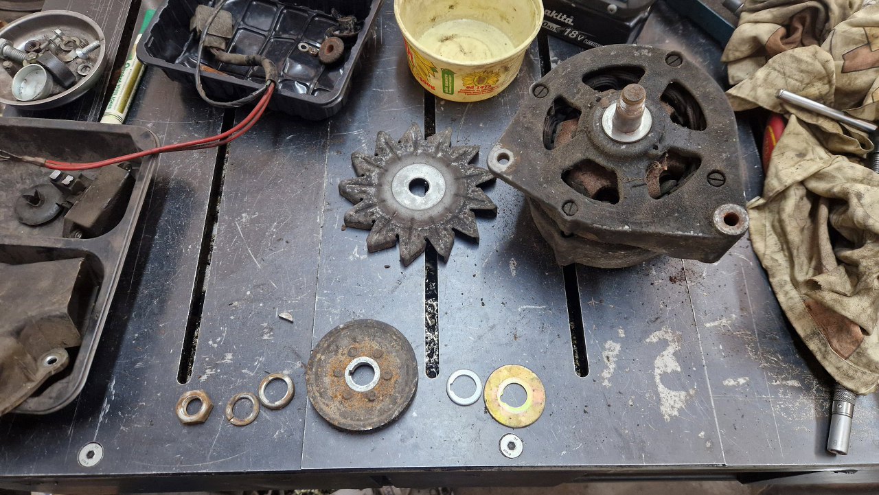 Po odkręceniu regulatora przewróciłem alternator na drugą stronę. Kółko pasowe jest bardzo podobne do tego z alternatora od Fordowskiej V4.