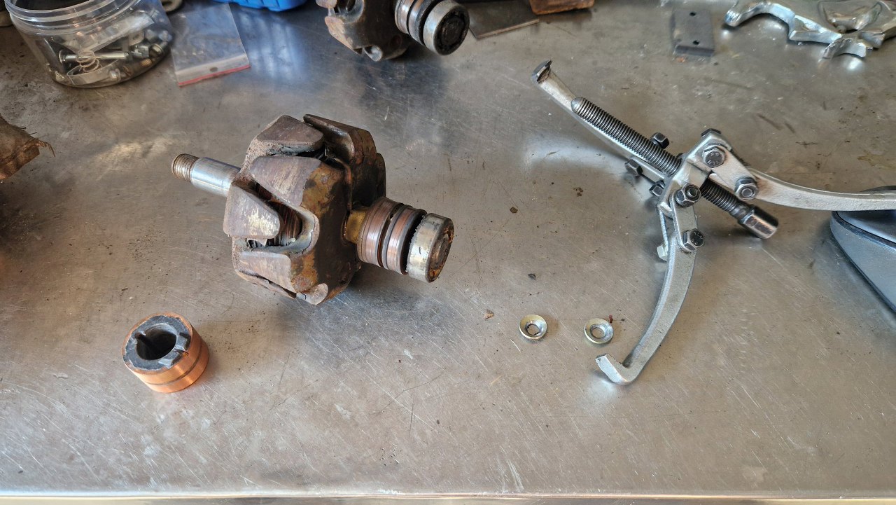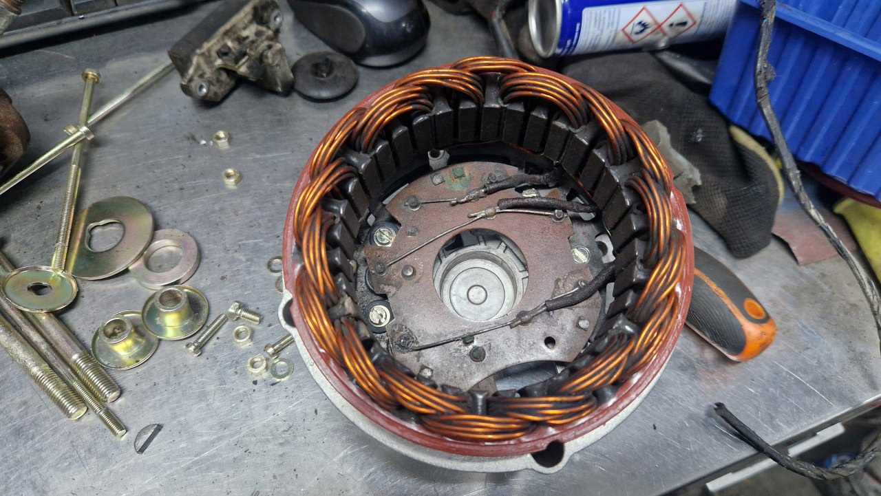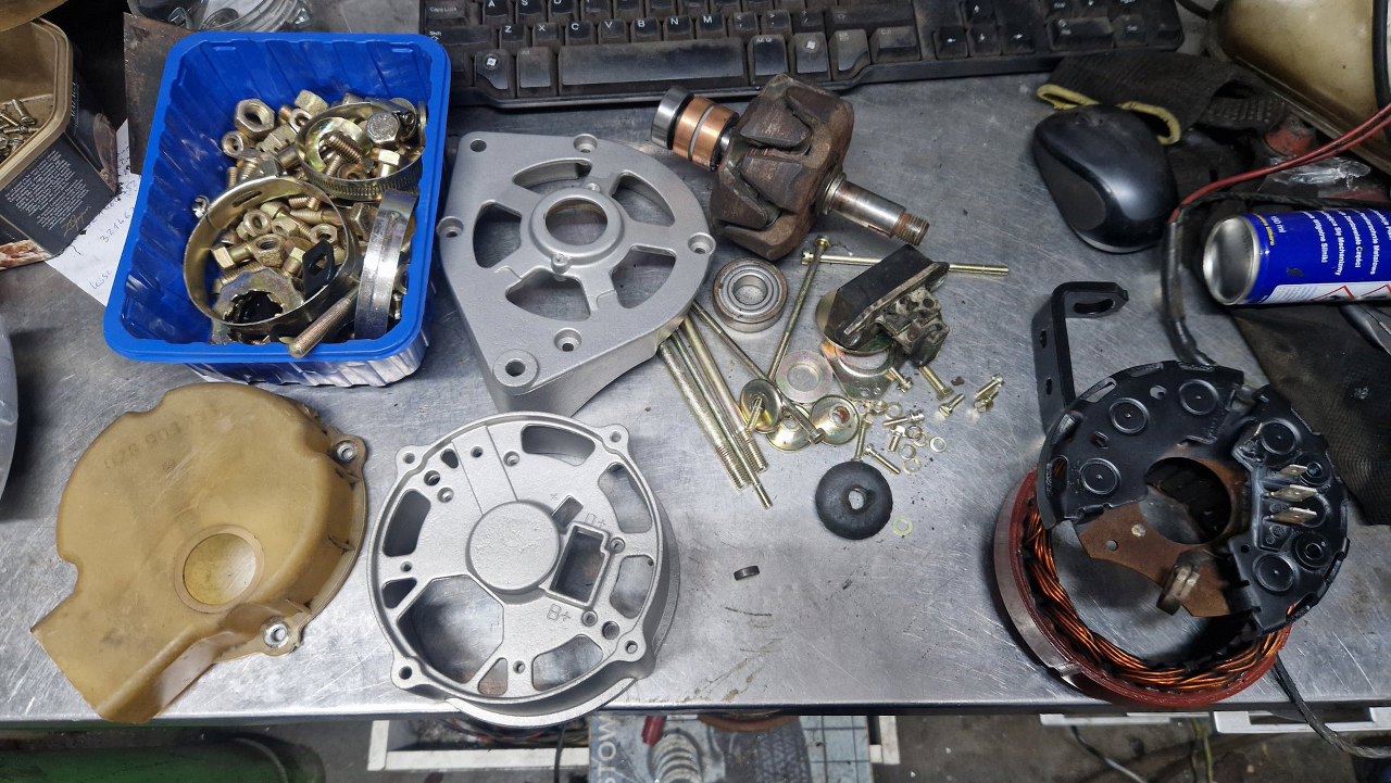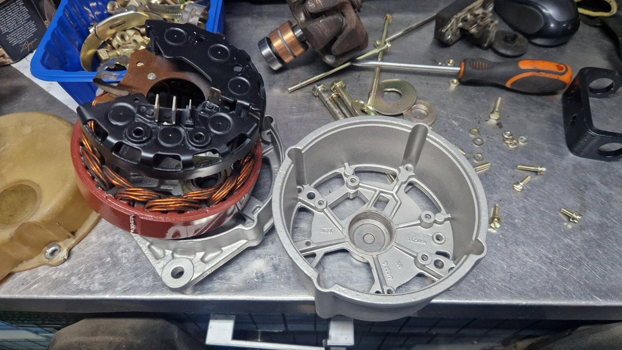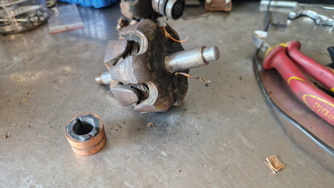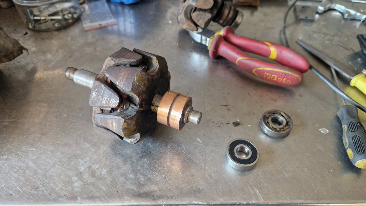 Wróćmy jednak do alternatora. Ślizgi szczotek na wirniku są już dość mocno zużyte. Kiedyś nie chciało mi się tego robić i oddałem alternator do regeneracji do renomowanej i znanej firmy... Dostałem go z przetoczonym ślizgiem na mniejszą średnicę. Pewnie, wyglądał dobrze, ale zużycie jakie było, takie zostało. Szczotki nadal musiały mocniej wystawać, żeby w ogóle dotknąć do ślizgu. Od tamtej pory już nie oddaję alternatorów i robię je sam, chociaż wymiany tego ślizgu to naprawdę nie lubię.