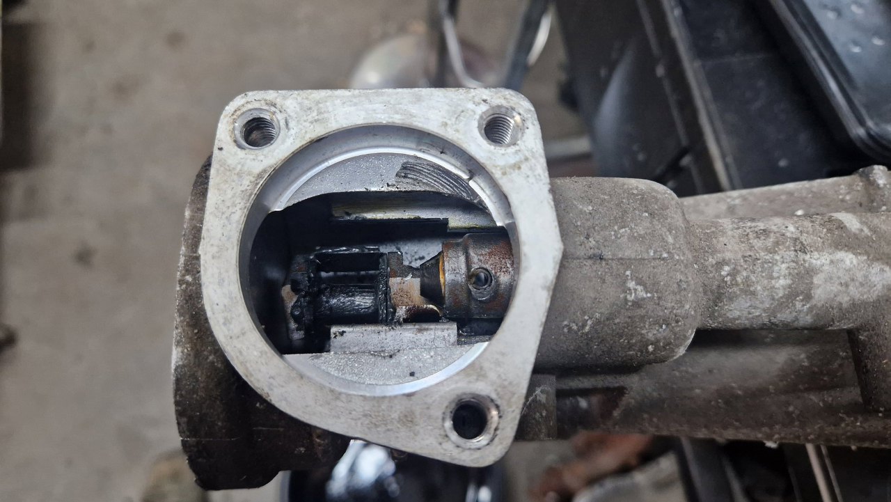 Wybiłem też zaślepkę napędu prędkościomierza i wyjąłem zębatkę. Zaślepki są w dwóch różnych kształtach - z przetłoczeniami, któe da się wybić bez ich niszczenia; oraz płaskie, jak tu, które niestety przy próbie wyjęcia są już do wyrzucenia.