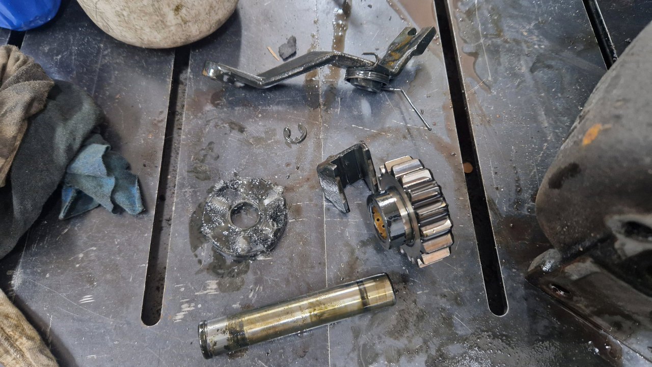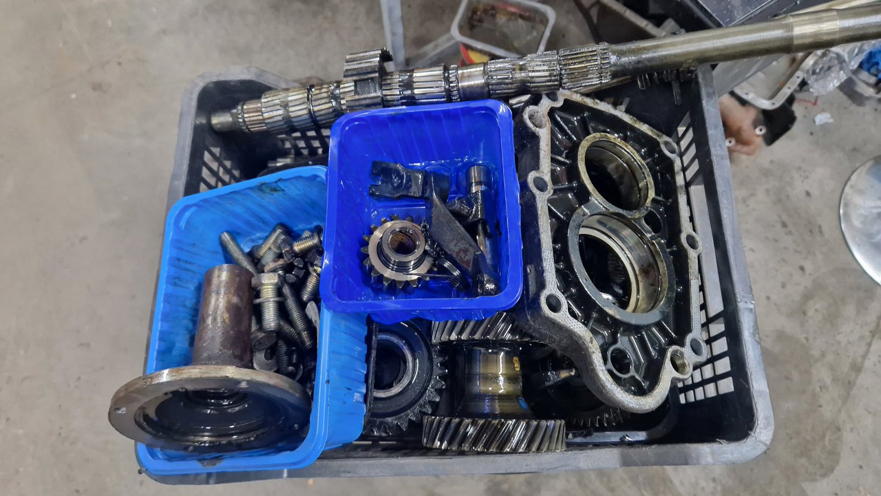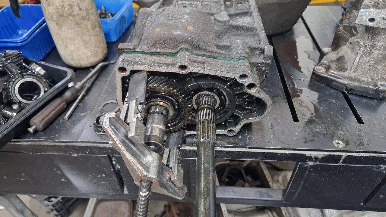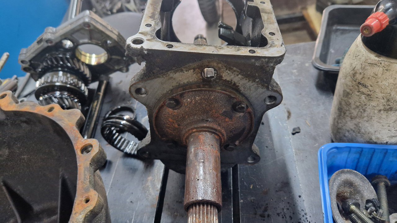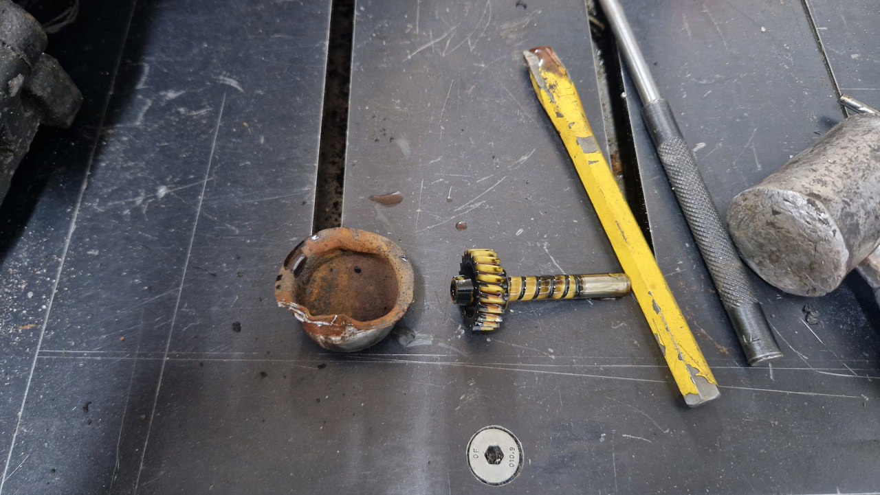 Żeby zdjąć zębatkę pierwszego biegu, trzeba wycisnąć na prasie wałek z łożyska tylnego.