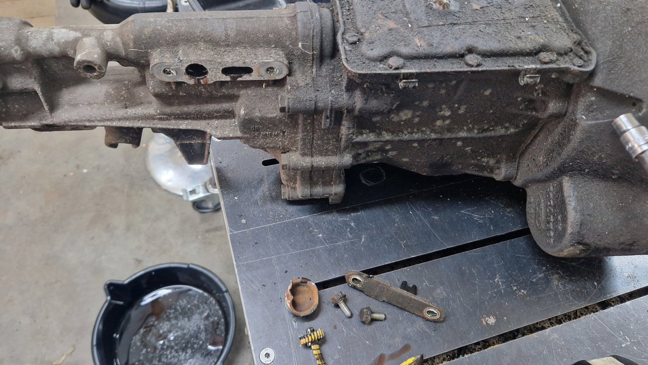 Najpierw odkręciłem części, któymi zajmę się później - dźwignię zmiany biegów i łapę skrzyni. Łapa pewnie będzie wymagać przespawania przy montażu w karoserii Escorta, więc na razie jej nie odnawiam.