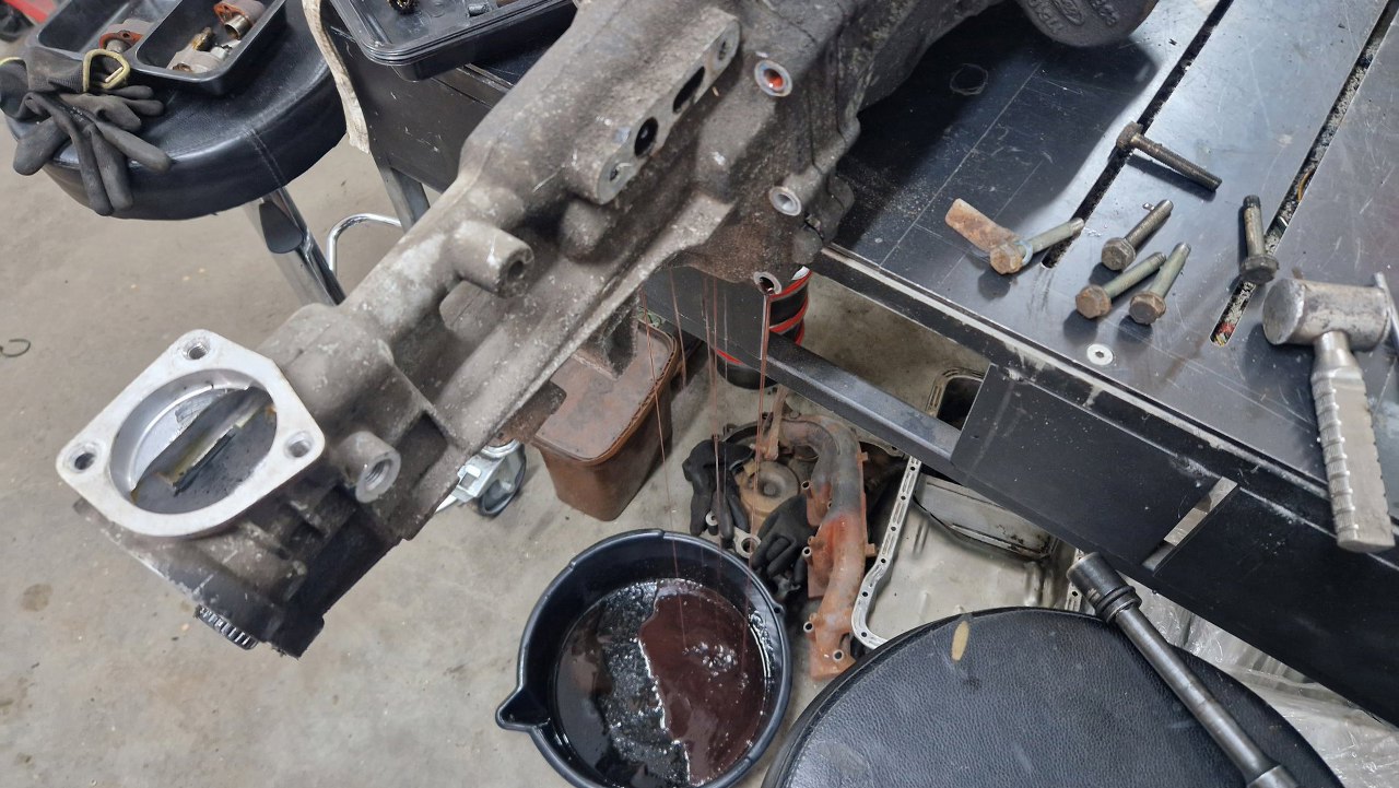 Po odkręceniu śrub trzymających ogon skrzyni do korpusu mogłem odchylić nieco ogon i zlać olej ze skrzyni.