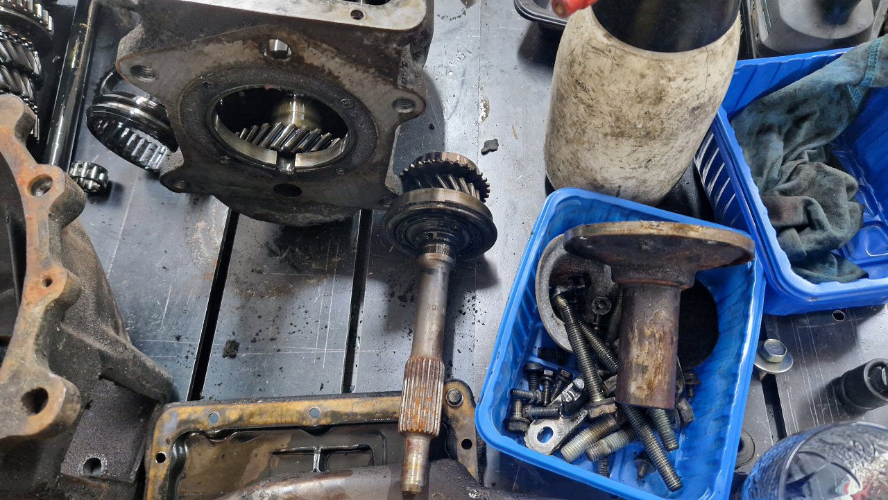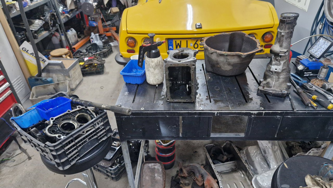 Po zdjęciu piętego biegu mogę już rozłożyć skrzynię. Na bok trafia płytka pośrednia razem z wałkiem wyjściowym. Choinka opada na dno skrzyni.