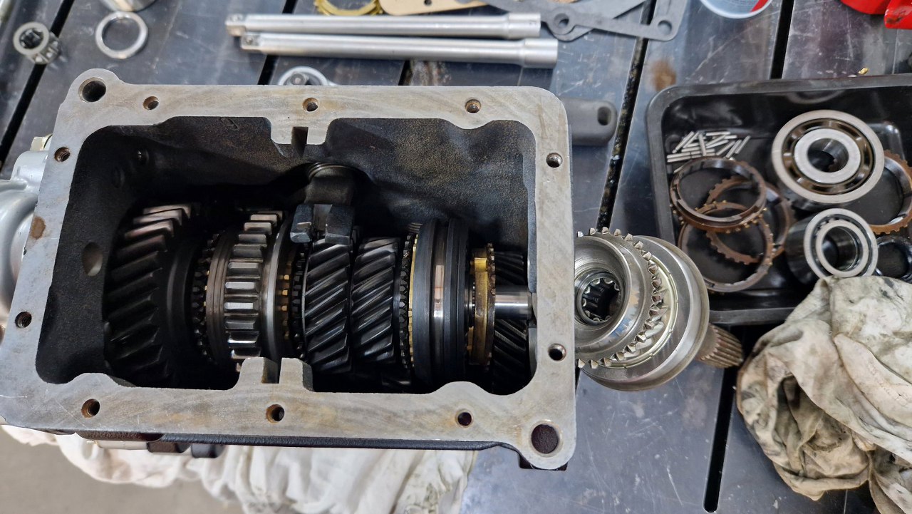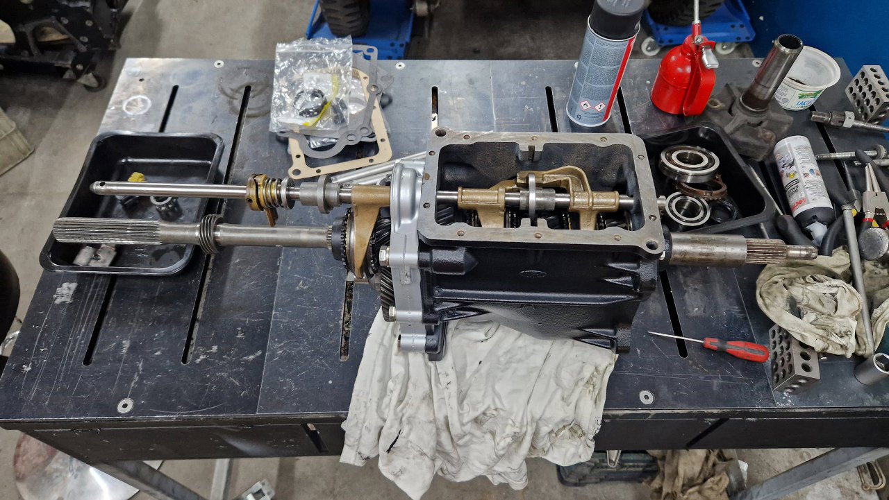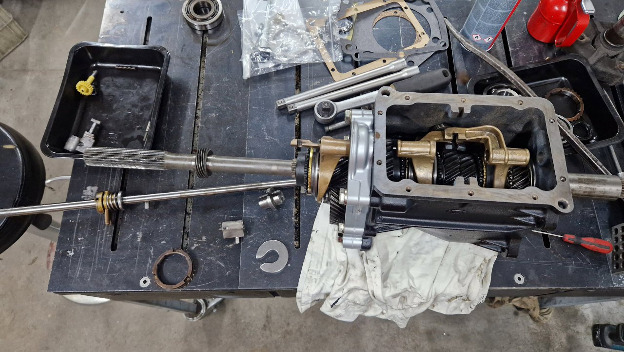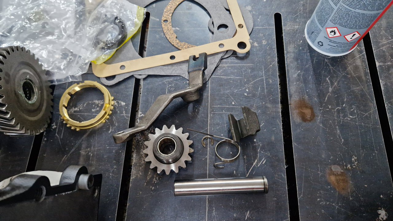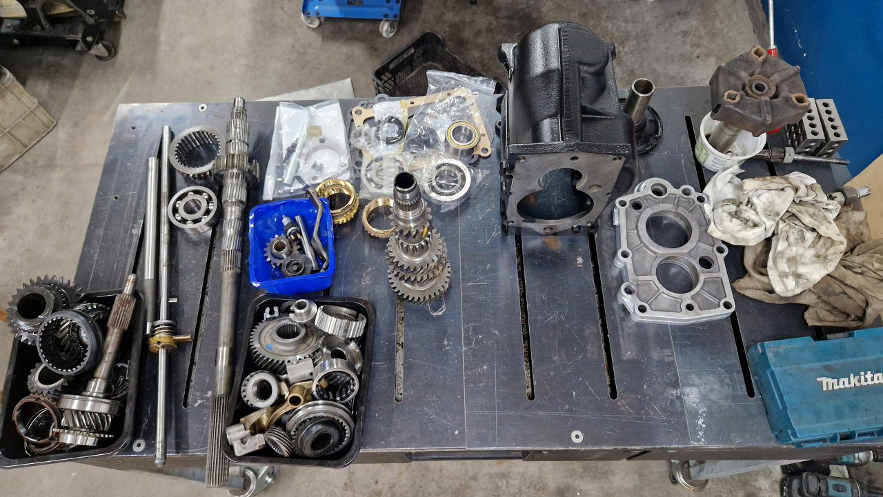 Po czyszczeniu części dzwon pojechał do malowania proszkowego, śrubki do ocynku, a ja pomalowałem obudowę i przygotowałem części. Po otwarciu pudełka, któe dostałem od Jarka, bardzo miło się zdziwiłem - był tam komplet nowych łożysk, uszczelek i synchronizatorów. Tak to ja mogę pracować :).