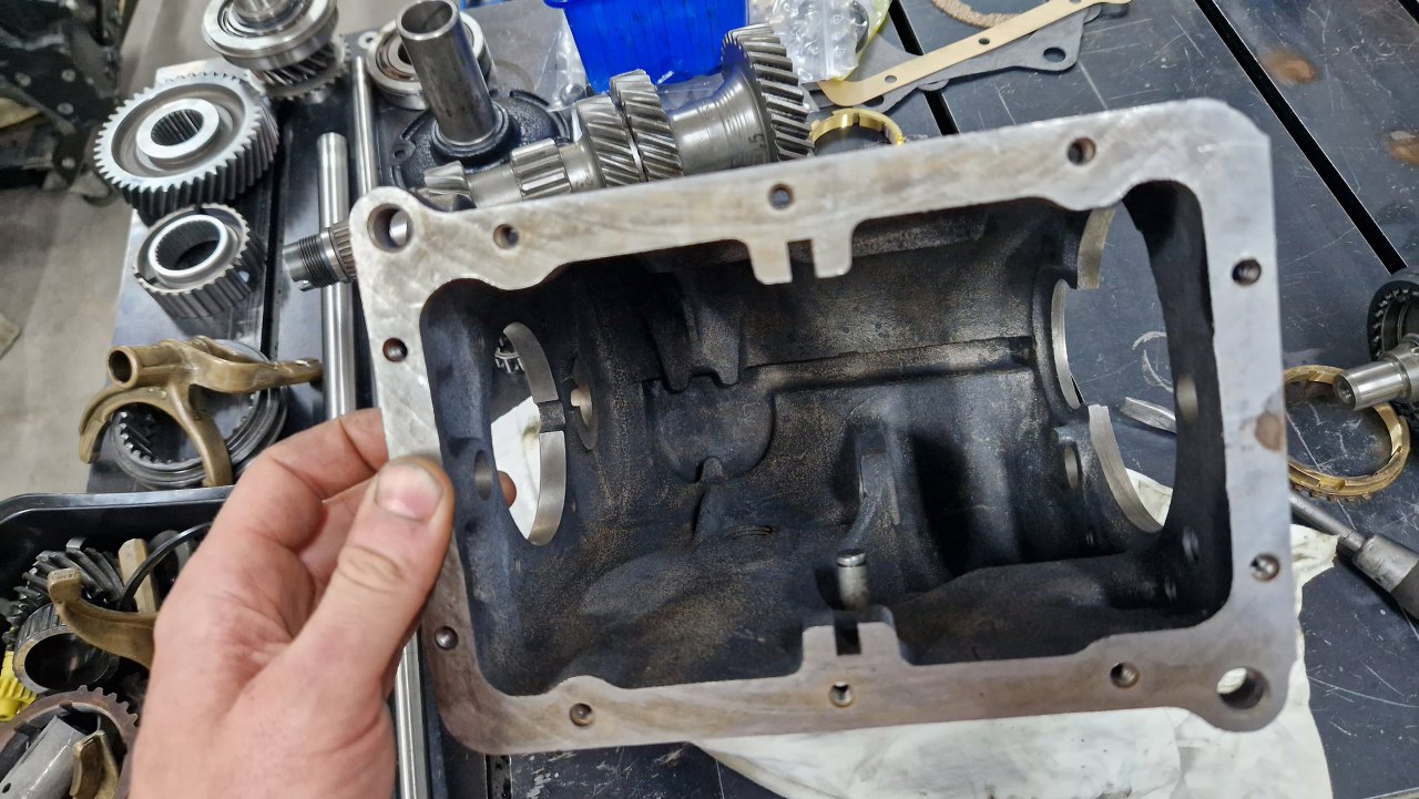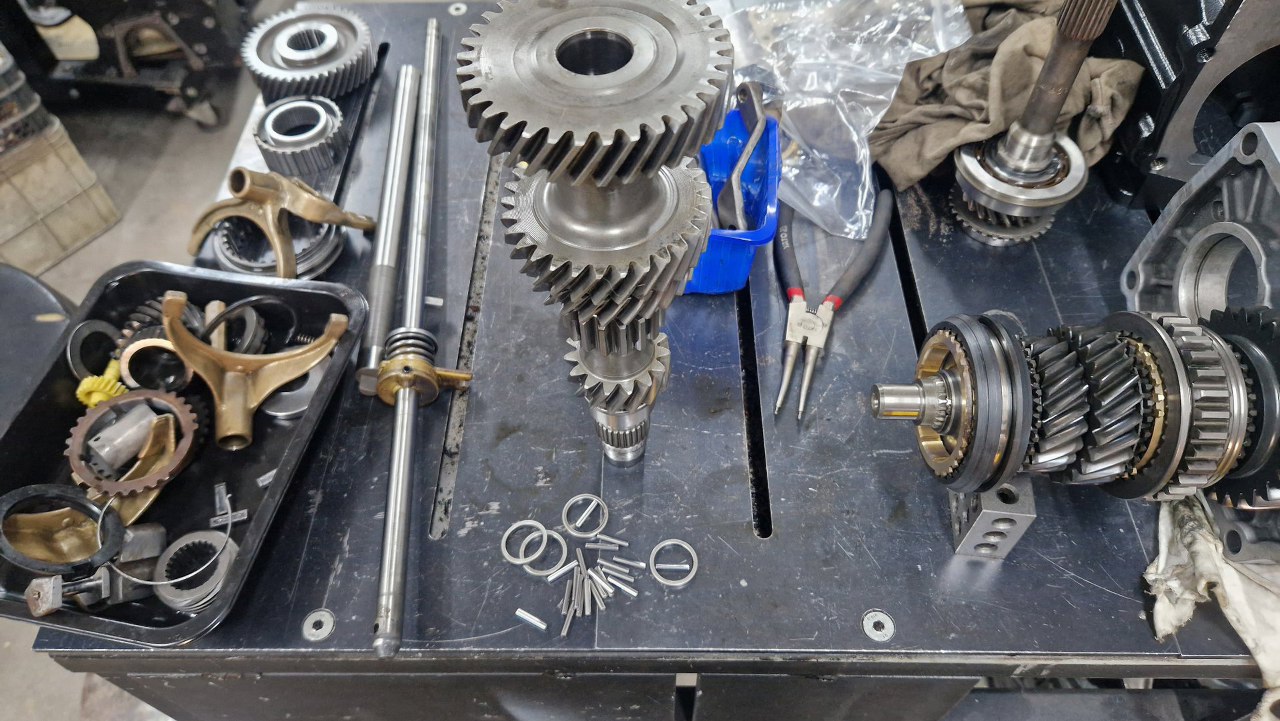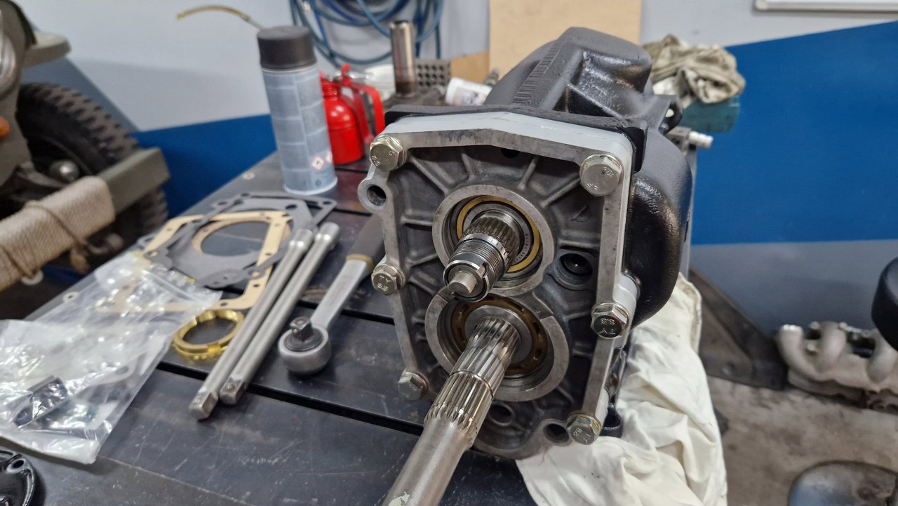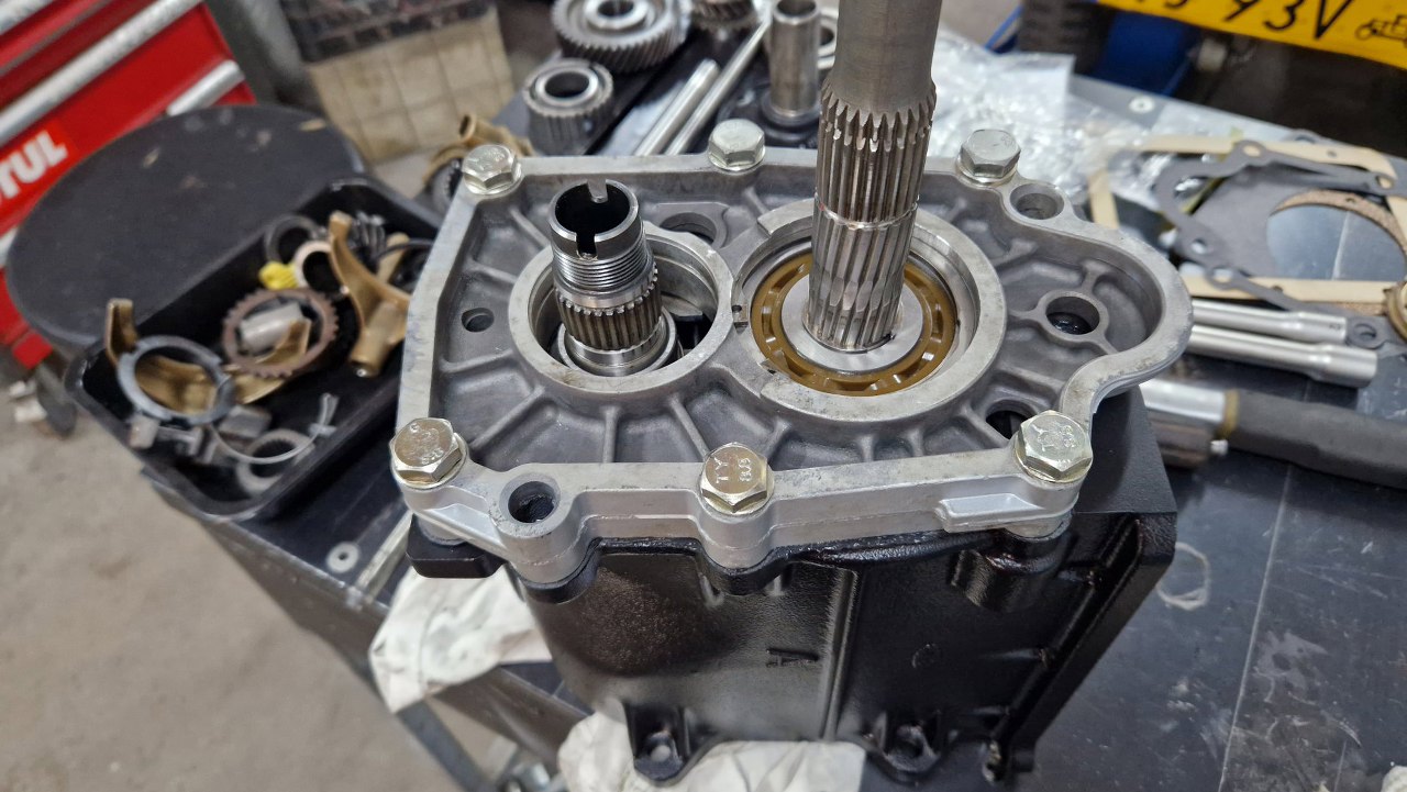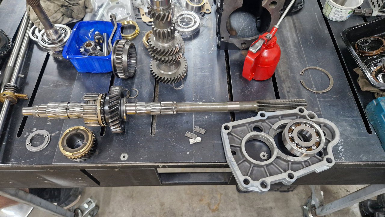 Po czyszczeniu części dzwon pojechał do malowania proszkowego, śrubki do ocynku, a ja pomalowałem obudowę i przygotowałem części. Po otwarciu pudełka, któe dostałem od Jarka, bardzo miło się zdziwiłem - był tam komplet nowych łożysk, uszczelek i synchronizatorów. Tak to ja mogę pracować :).