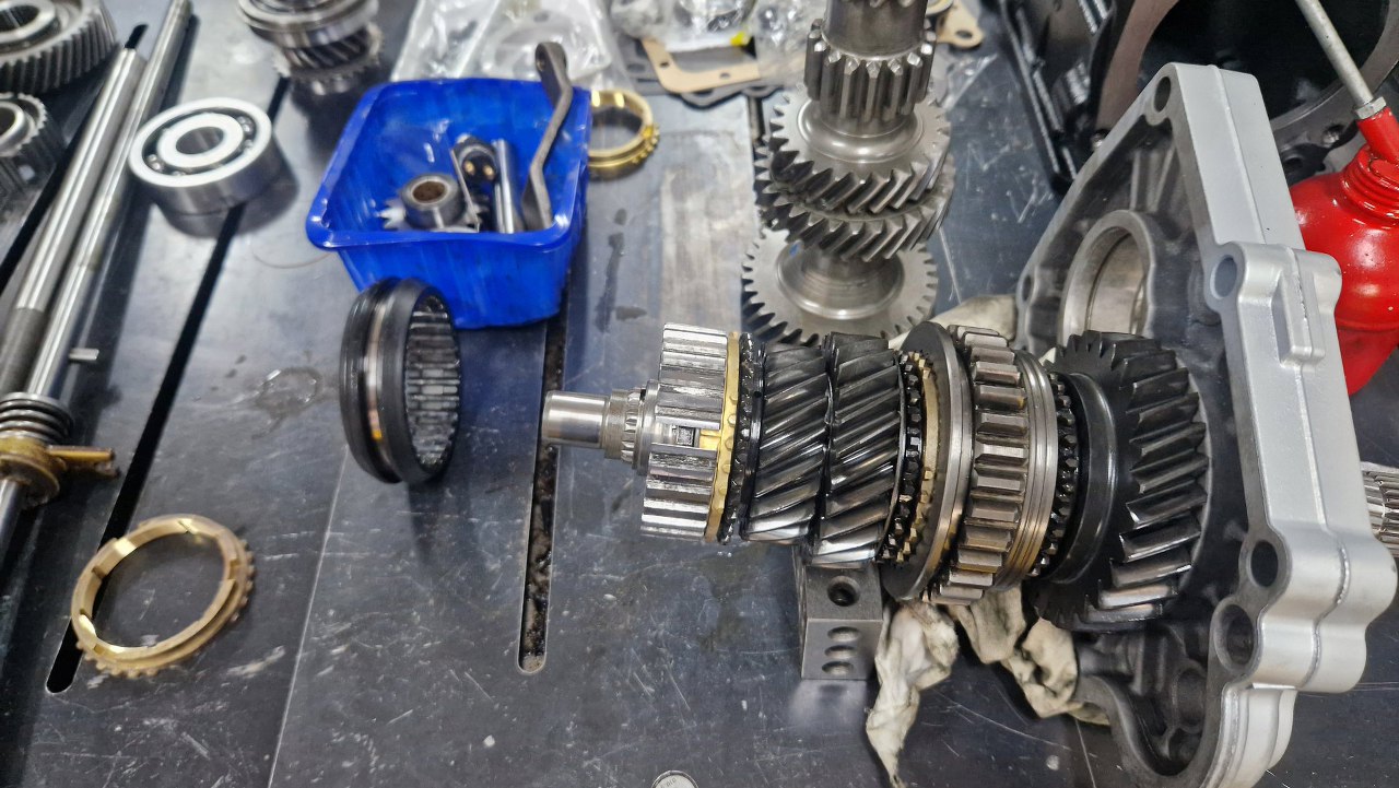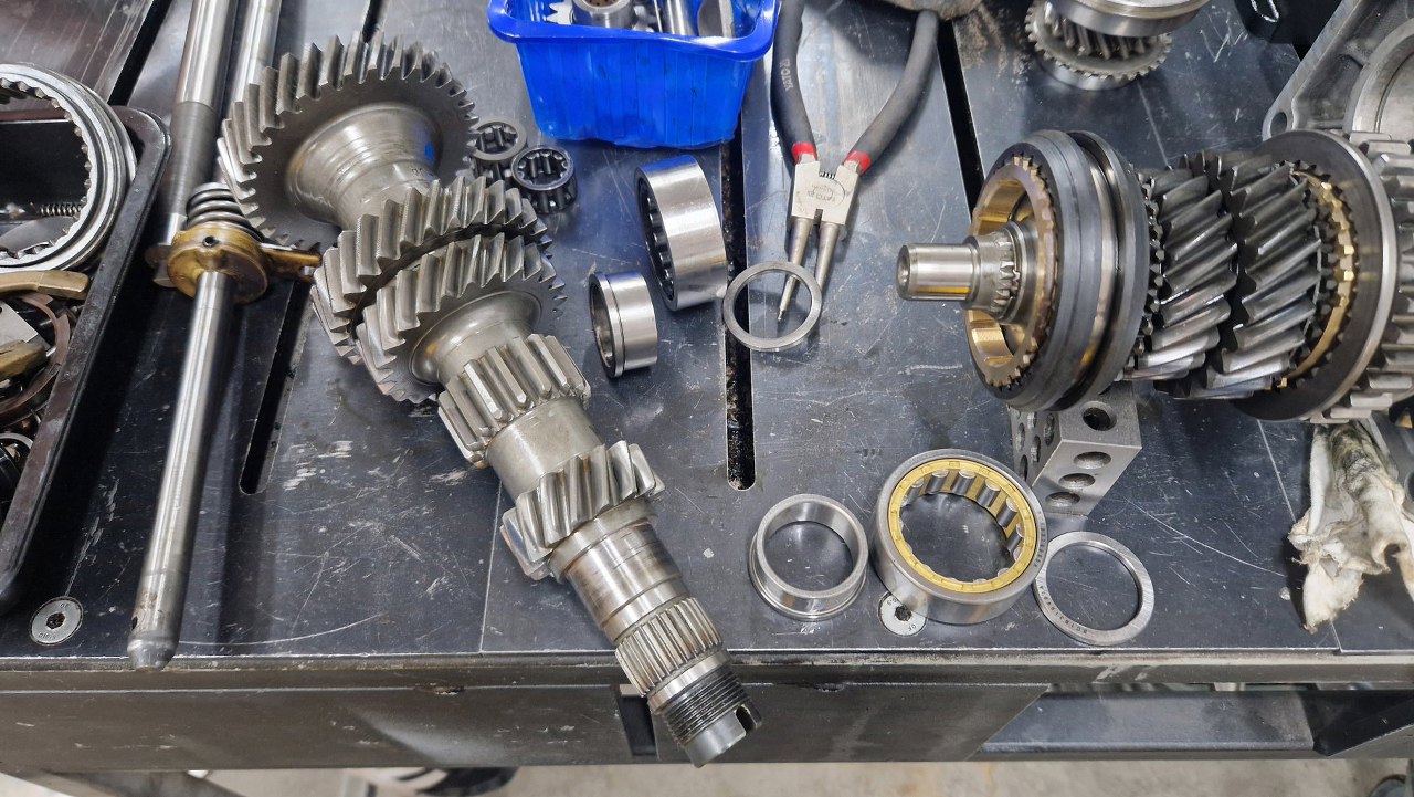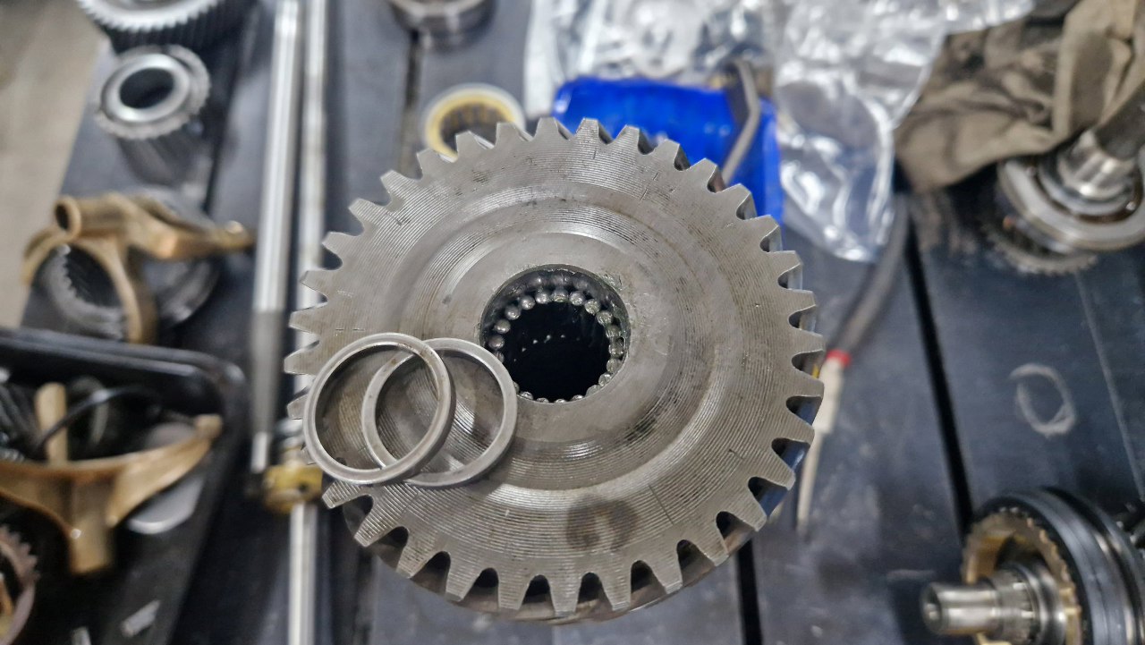 Dalej zębatka trzeciego biegu. Wszędzie oczywiście już nowe synchronizatory.