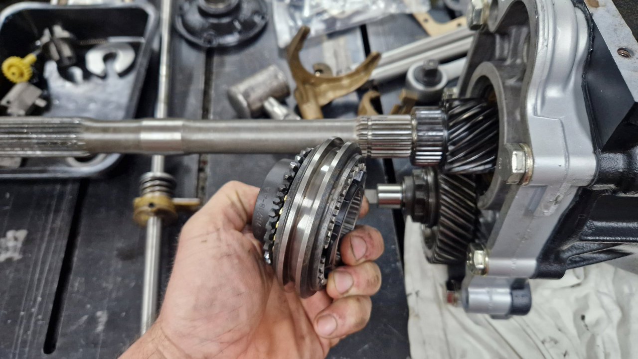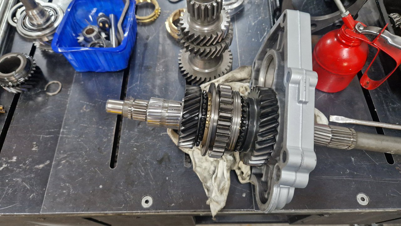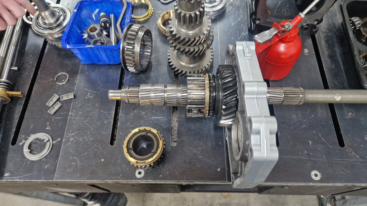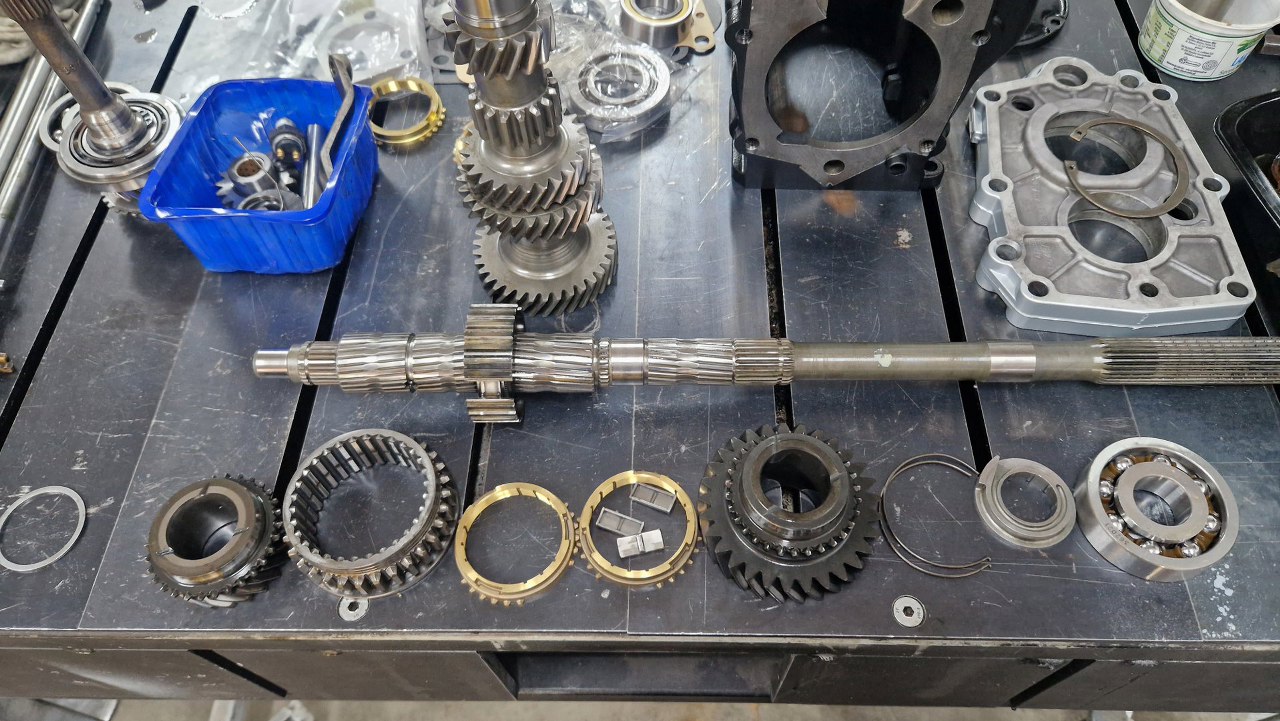 Dalej zębatka trzeciego biegu. Wszędzie oczywiście już nowe synchronizatory.