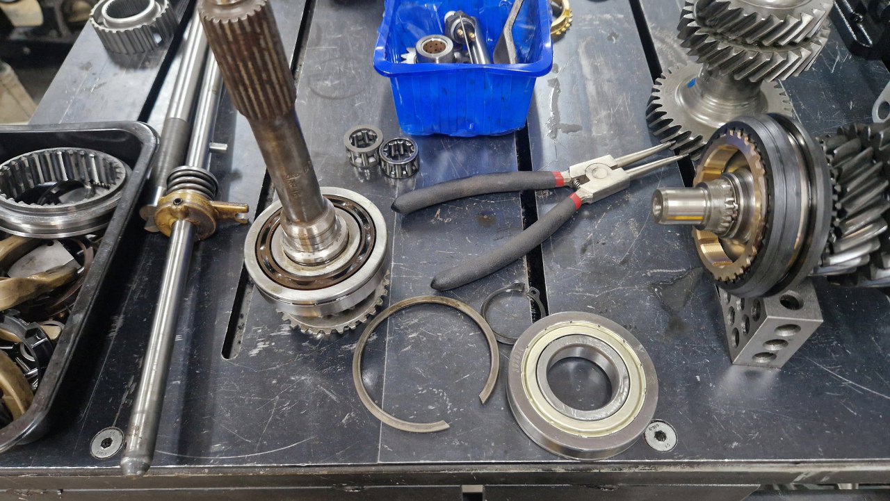 Włożyłem z przodu synchronizator czwartego biegu i spróbowałem włożyć łożysko wewnętrzne wałków sprzęgłowego i wyjściowego. Niestety okazało się, że nie pasuje - jest ciut za dużej średnicy. Oryginalne, wyciągnięte ze skrzyni, było dobre, więc docelowo użyję jego.