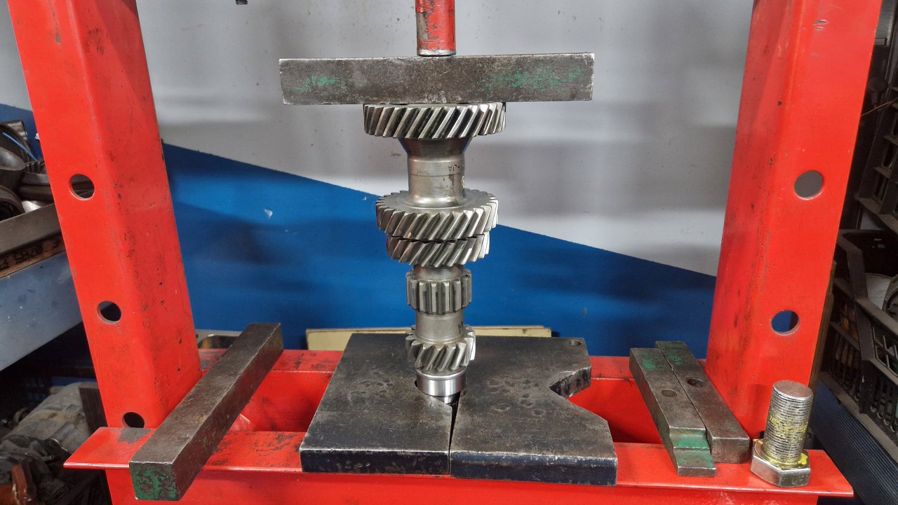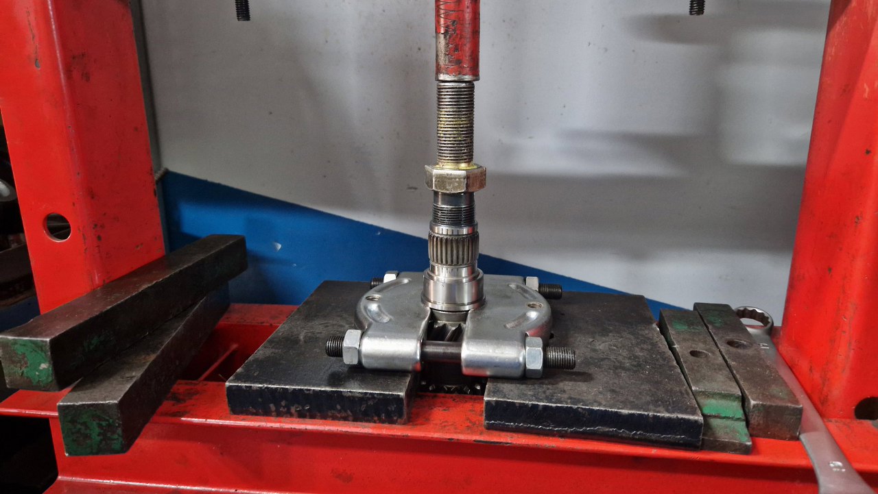 Następnie zająłem się łożyskiem tylnym choinki. Łożysko jest trzyczęściowe, po rozłożeniu skrzyni na choince zostake sama bieżnia wewnętrzna. Ją też ściągam na prasie.