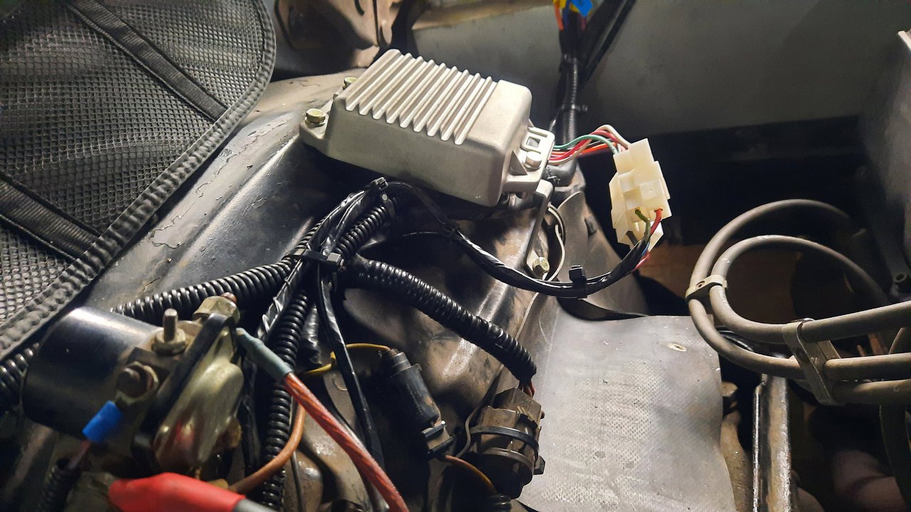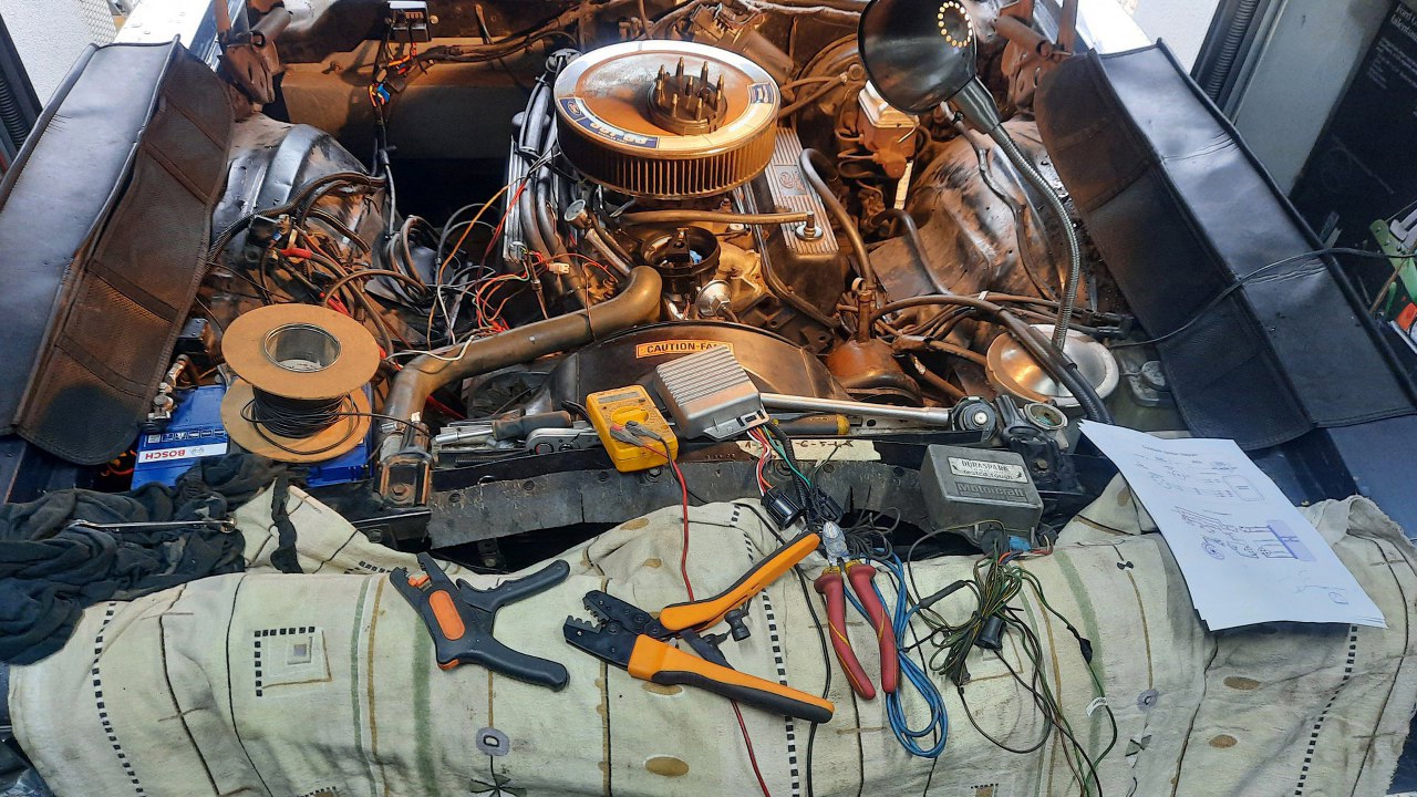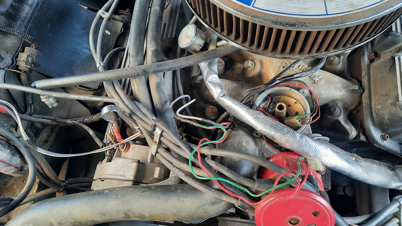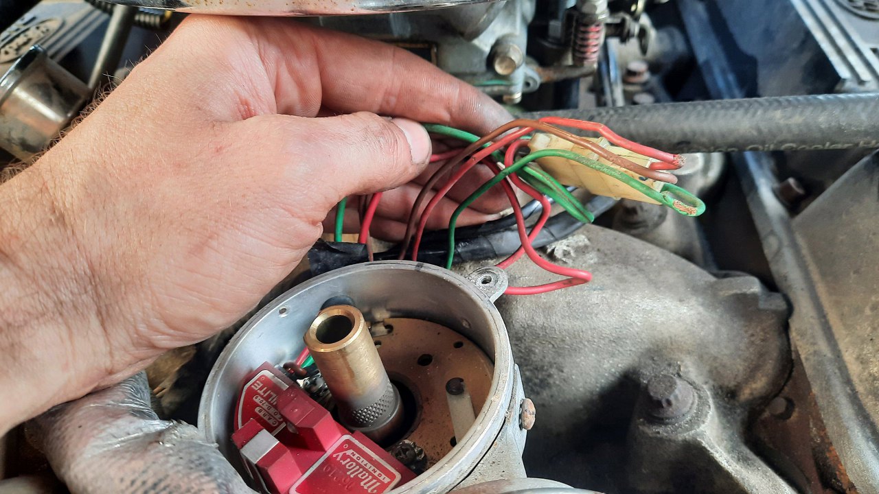 Diagnozowałem to zatem dalej. I im więcej diagnozowałem, tym bardziej nie działało. A potem działało. A potem znowu nie. W sumie przy okazji znalazłem taki kwiatek, jak zasilanie na układ zapłonowy wzięte z grzałki ssania w gaźniku. W końcu jednak zacząłem głębiej grzebać w kabelkach. Układ zapłonowy w ogóle jest tu nieoryginalny, tylko Mallory. Znalazłem takie coś na kabelkach idących do aparatu zapłonowego.