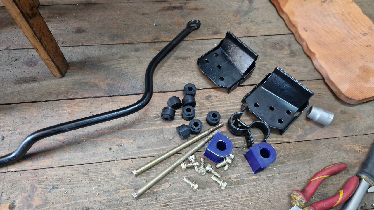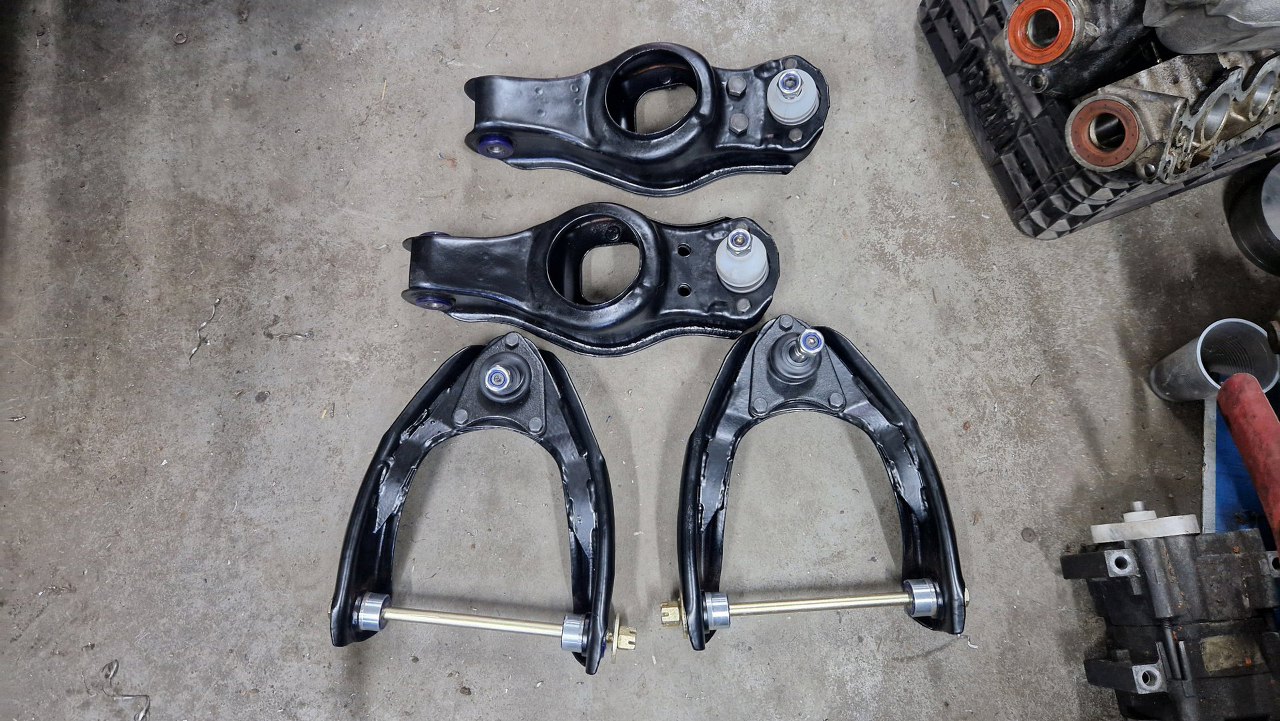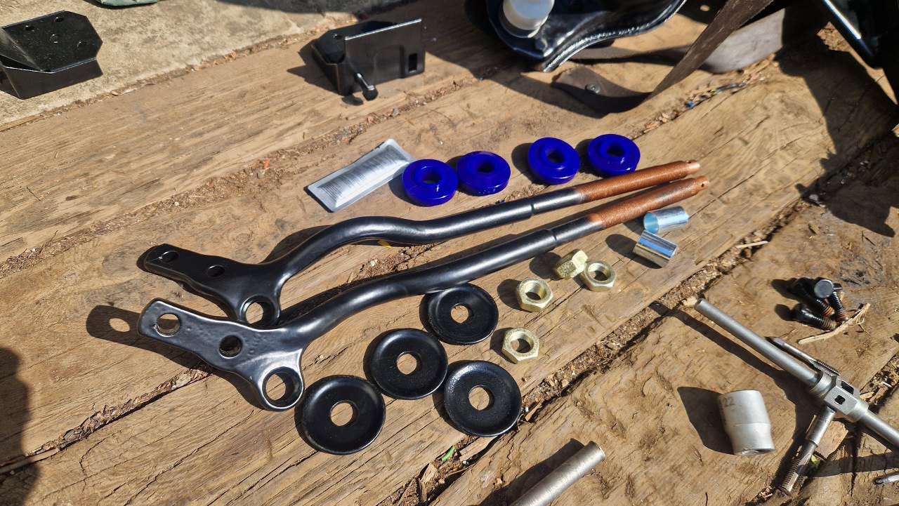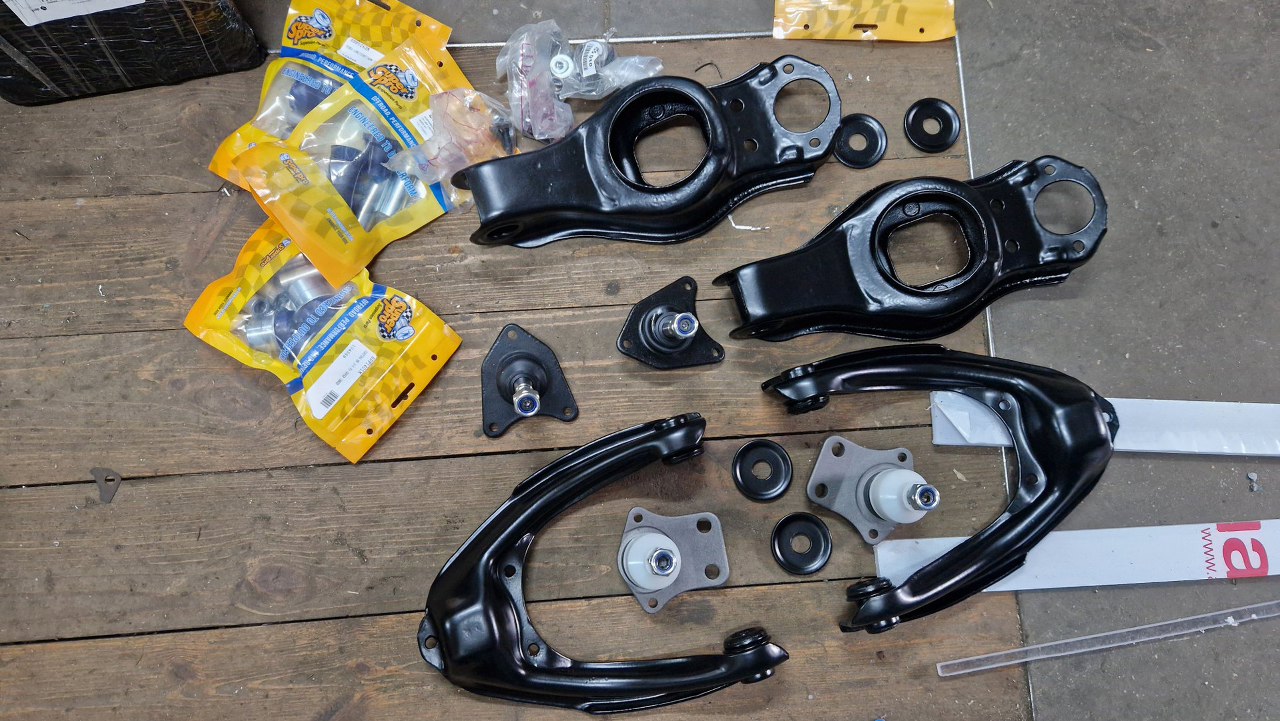 Po powrocie części z malowania proszkowego chwilę poczekałem na dostawę części. Jak już je dostałem, można to było poskładać. Zaczniemy od wahaczy i ich tulei.