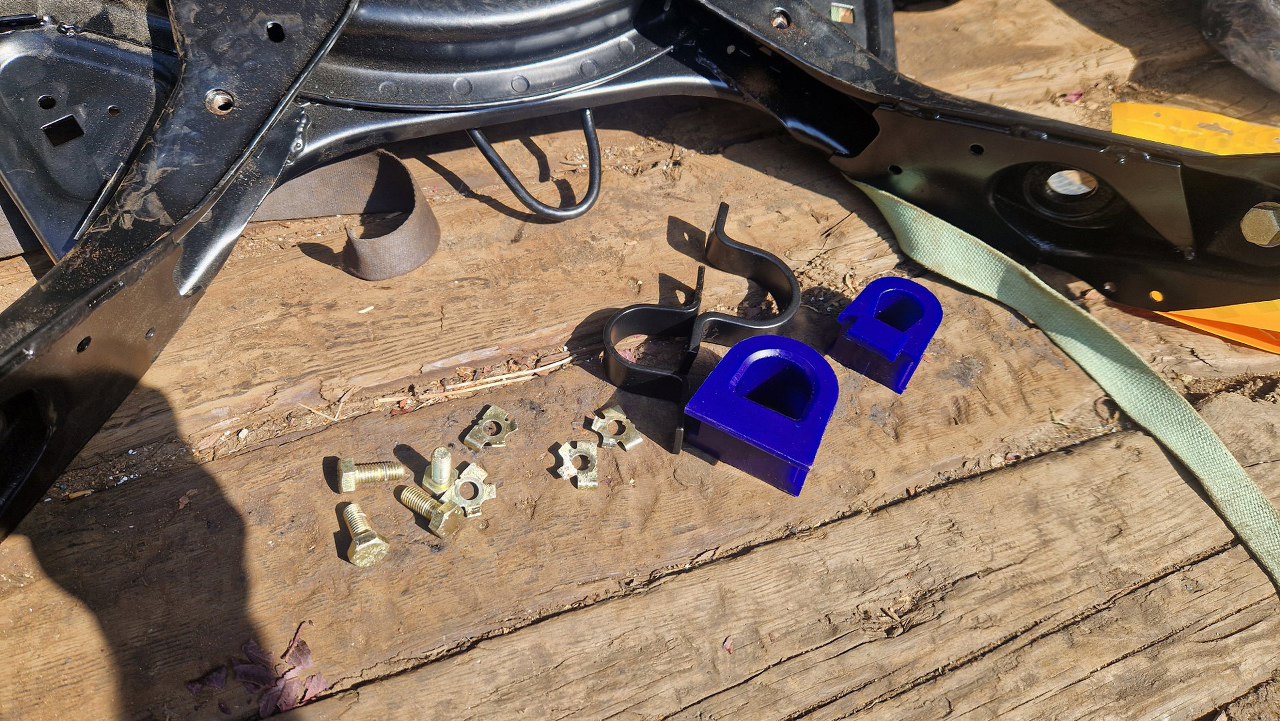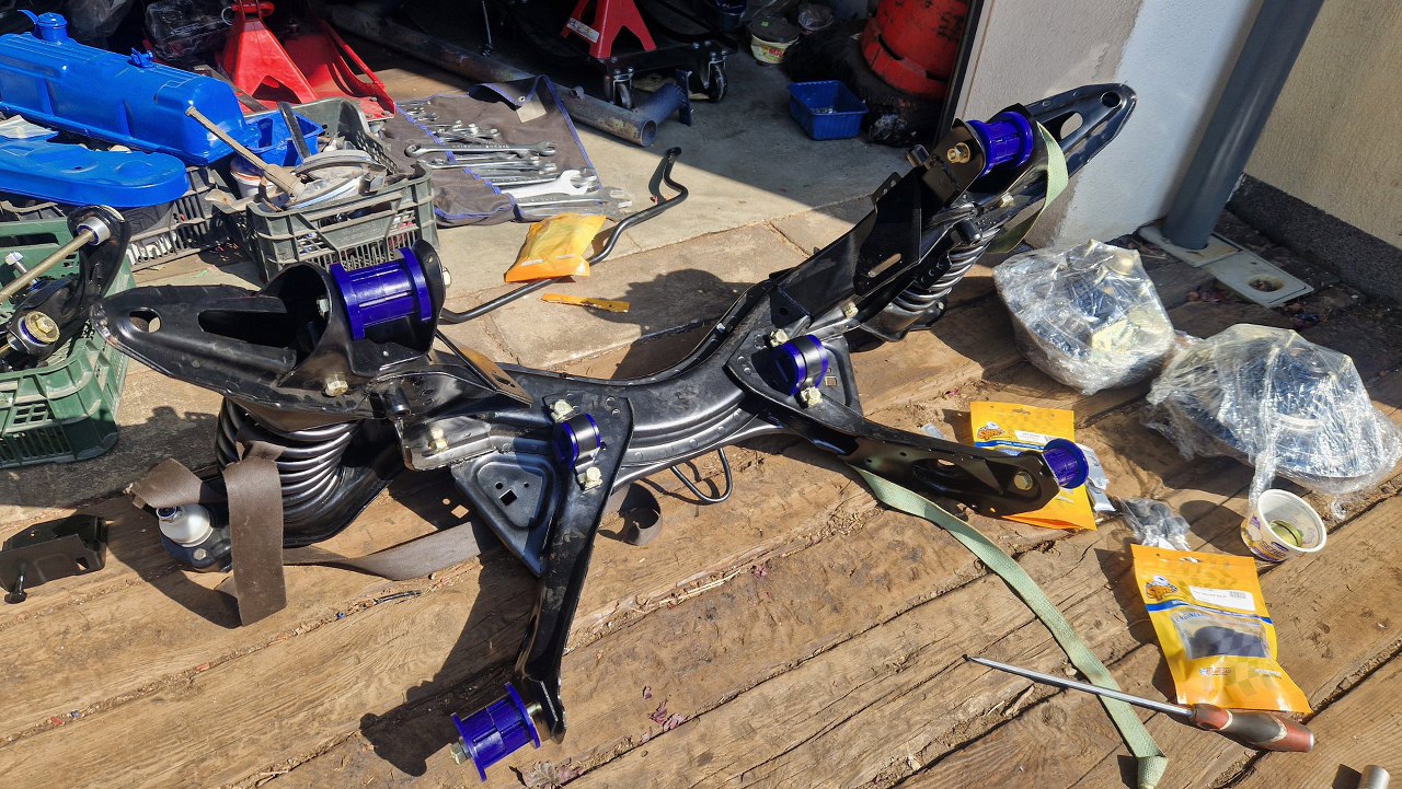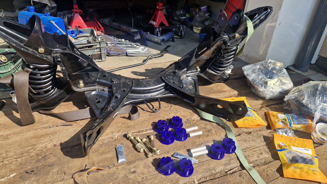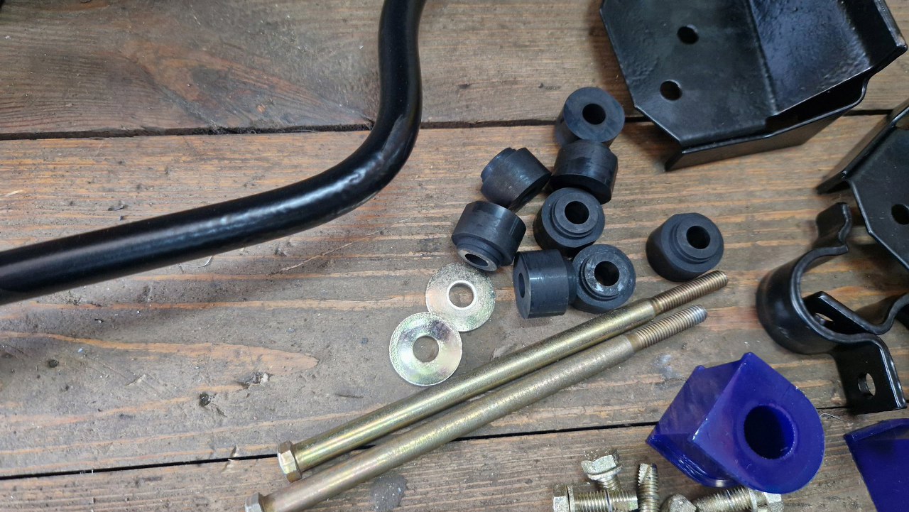 Po powrocie części z malowania proszkowego chwilę poczekałem na dostawę części. Jak już je dostałem, można to było poskładać. Zaczniemy od wahaczy i ich tulei.
