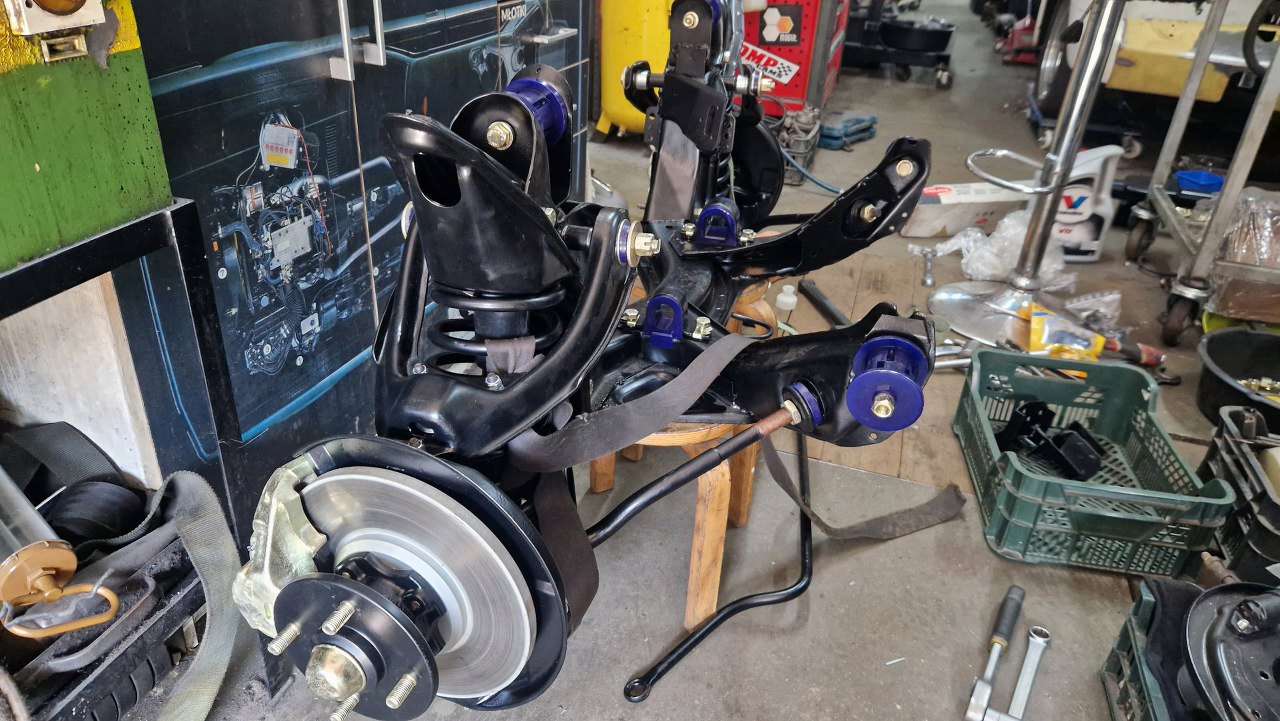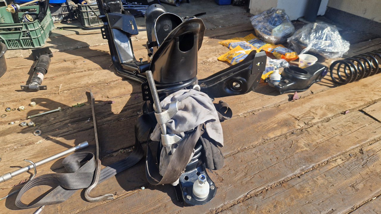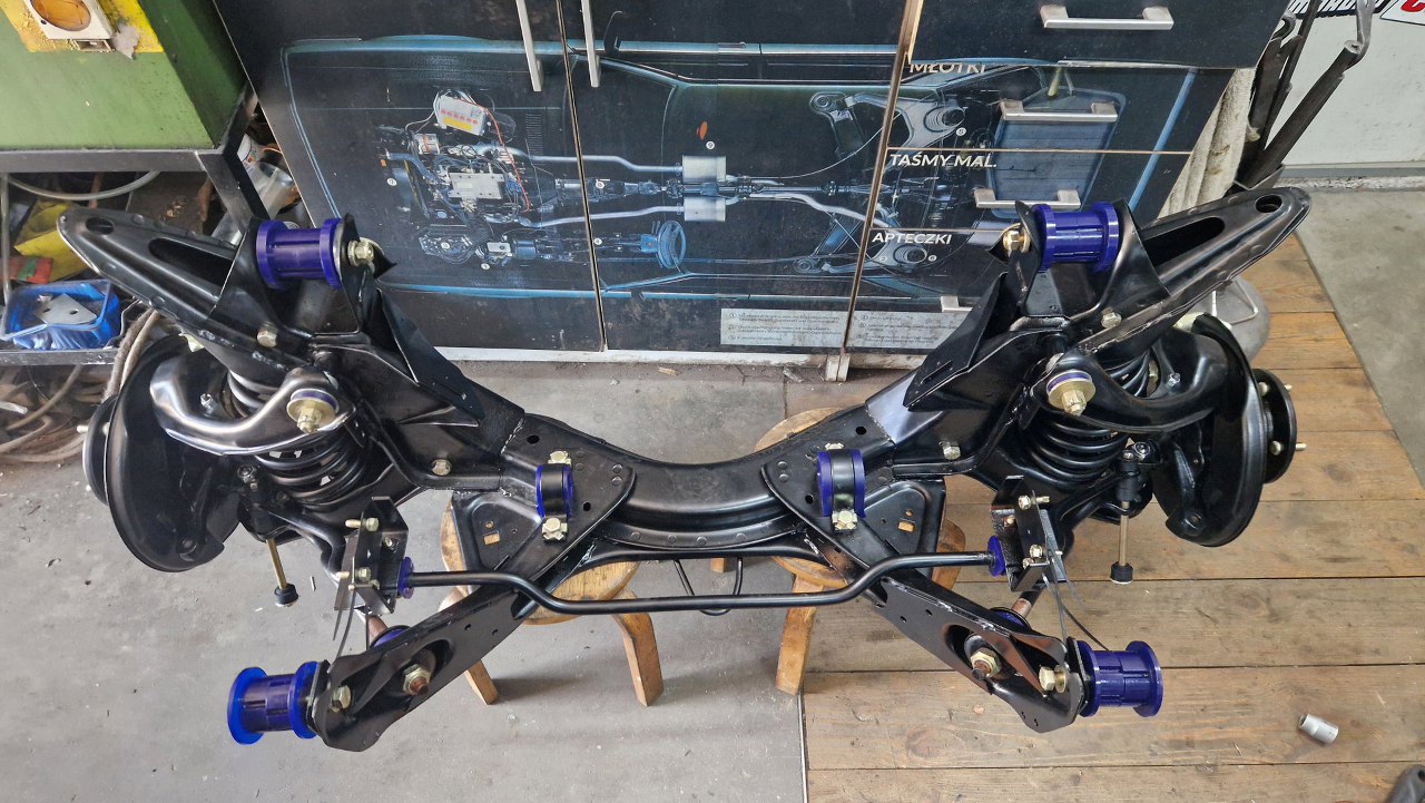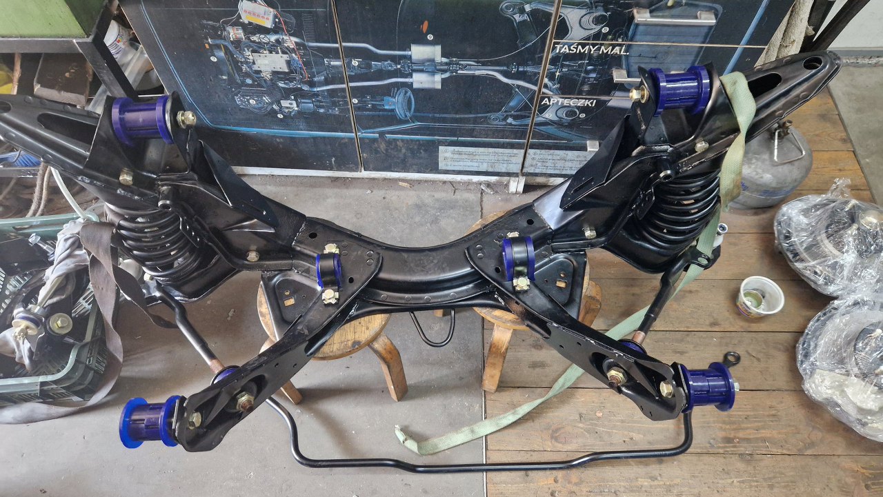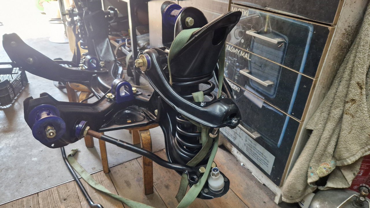 Po ściśnięciu sprężyn wkręciłem śruby dolnych wahaczy i przykręciłem amortyzatory. To amortyzatory trzymają sprężyny, żeby nie rozciągnęły się bardziej. Zewnętrzne części sprężyn zostawiłem ściągnięte pasami, żeby nie wygięły się za bardzo na zewnątrz. Obok leżą przygotowane tuleje mocujące belkę w karoserii.