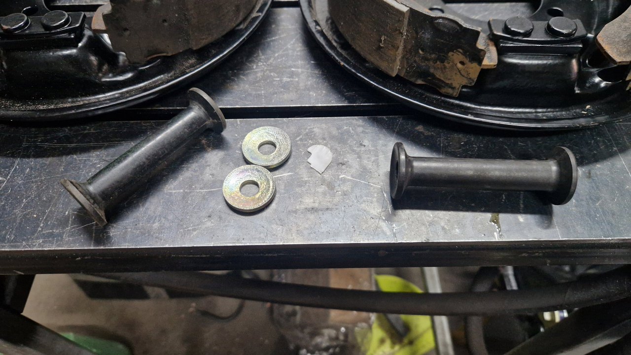 Pora na skołowanie kilku części. Oryginalne łączniki stabilizatora mają metalową tulejkę. Tu były zupełnie skorodowane. Miałem tylko jedną taką tulejkę w zapasie, ale miałem też jedną plasikową, z Taunusa z okolic '79-'81. No przecież nie założę dwóch różnych, nie? Zamówiłem tulejki u znajomego, ale zadzwonił do mnie, że ma tylko jedną, plastikową... Czyli jednak uzbieram komplet :).