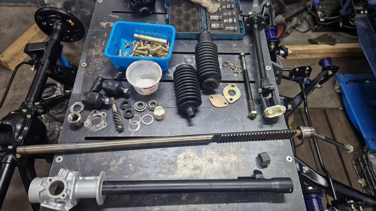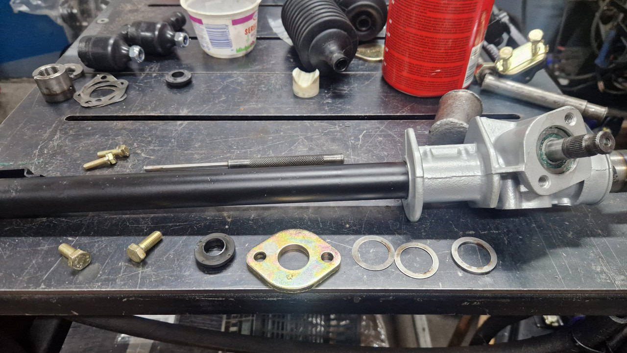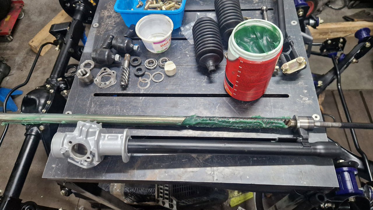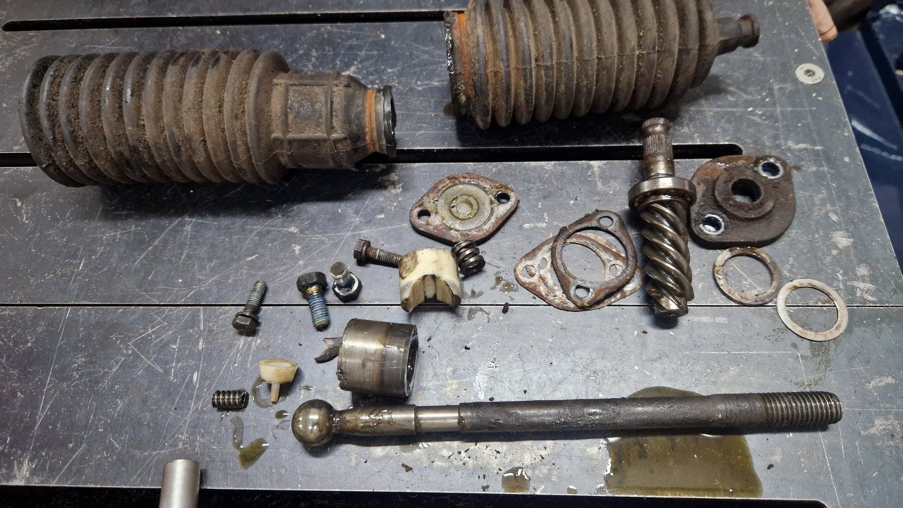 Zdemontowałem jeden z drążków kierowniczych, żeby wyjąć listwę zębatą z obudowy, rozłożone zostały wszystkie pozostałe części.