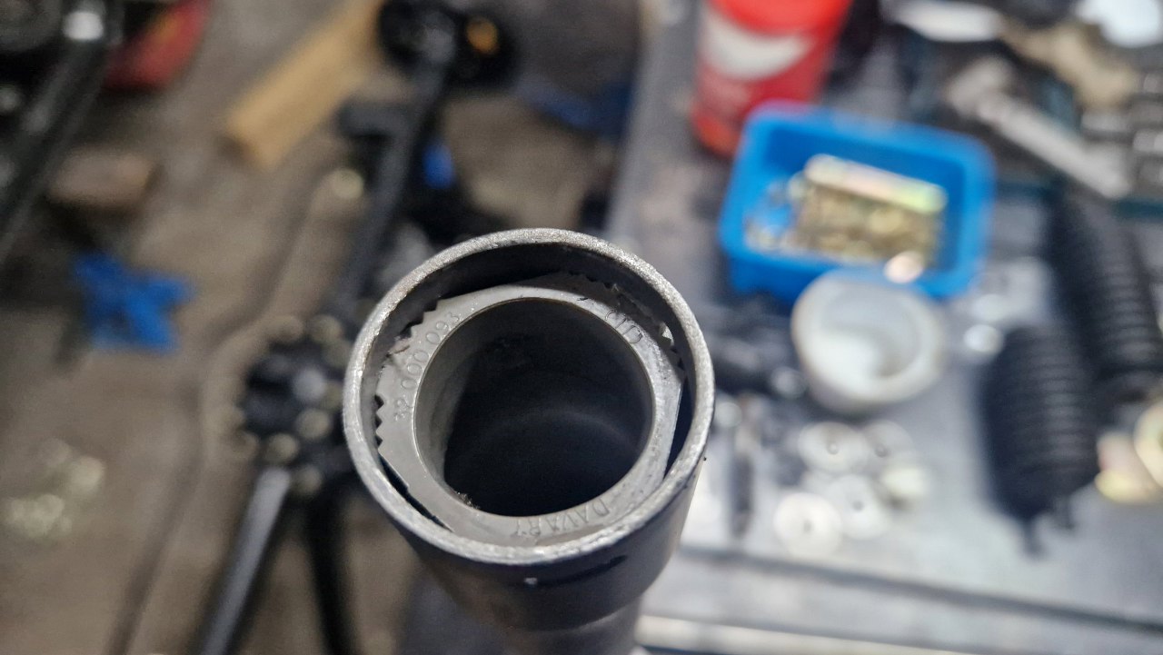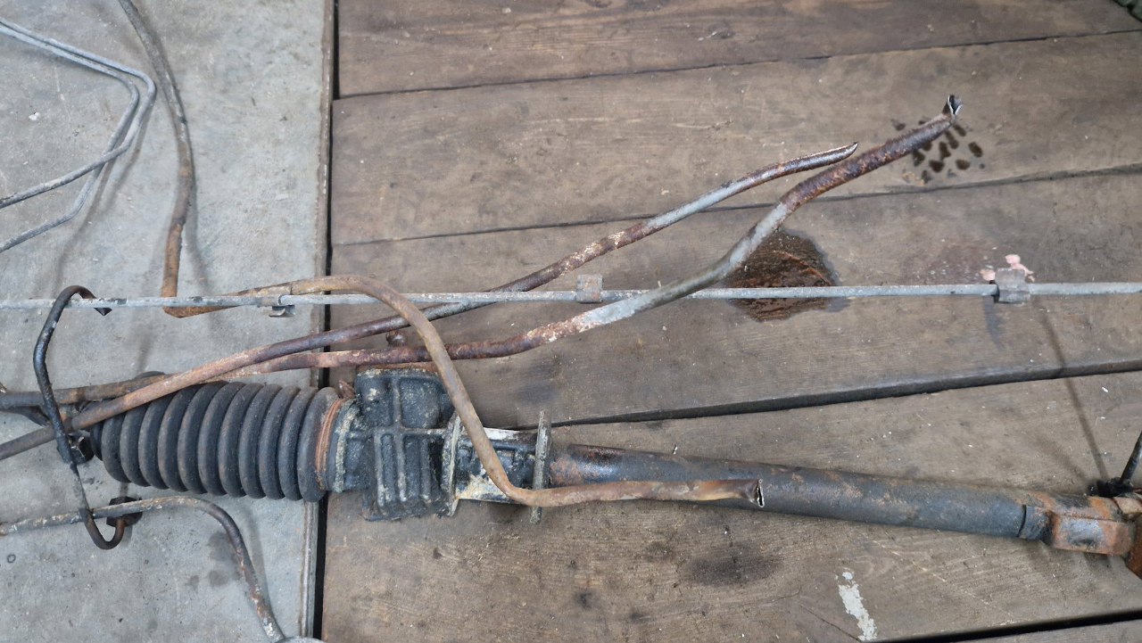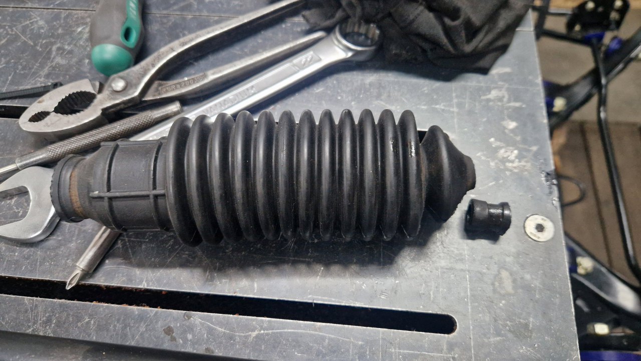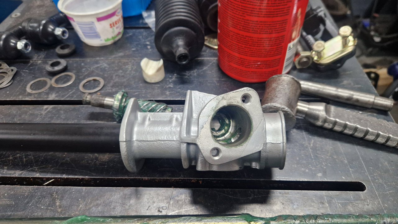 Zdemontowałem jeden z drążków kierowniczych, żeby wyjąć listwę zębatą z obudowy, rozłożone zostały wszystkie pozostałe części.