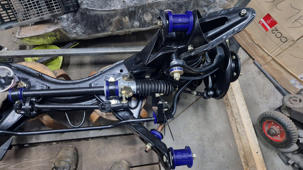 A tu już zamontowana do belki i z jednej strony do zwrotnicy. Na belce leży też odnowiony łącznik kolumny kierowniczej.