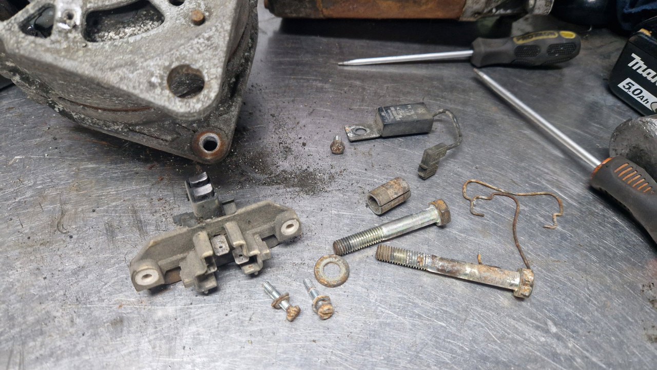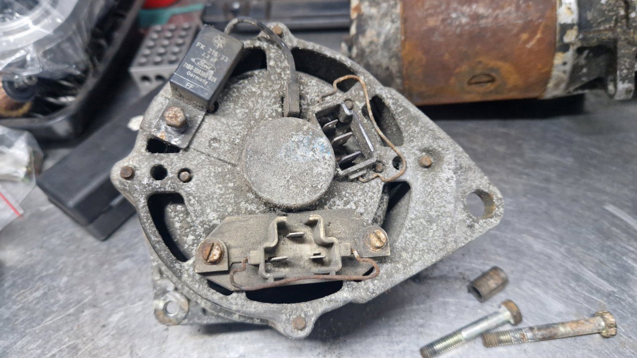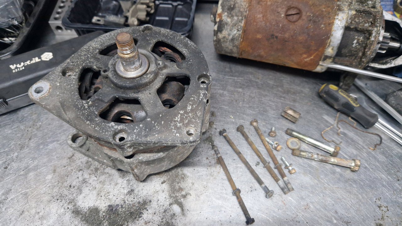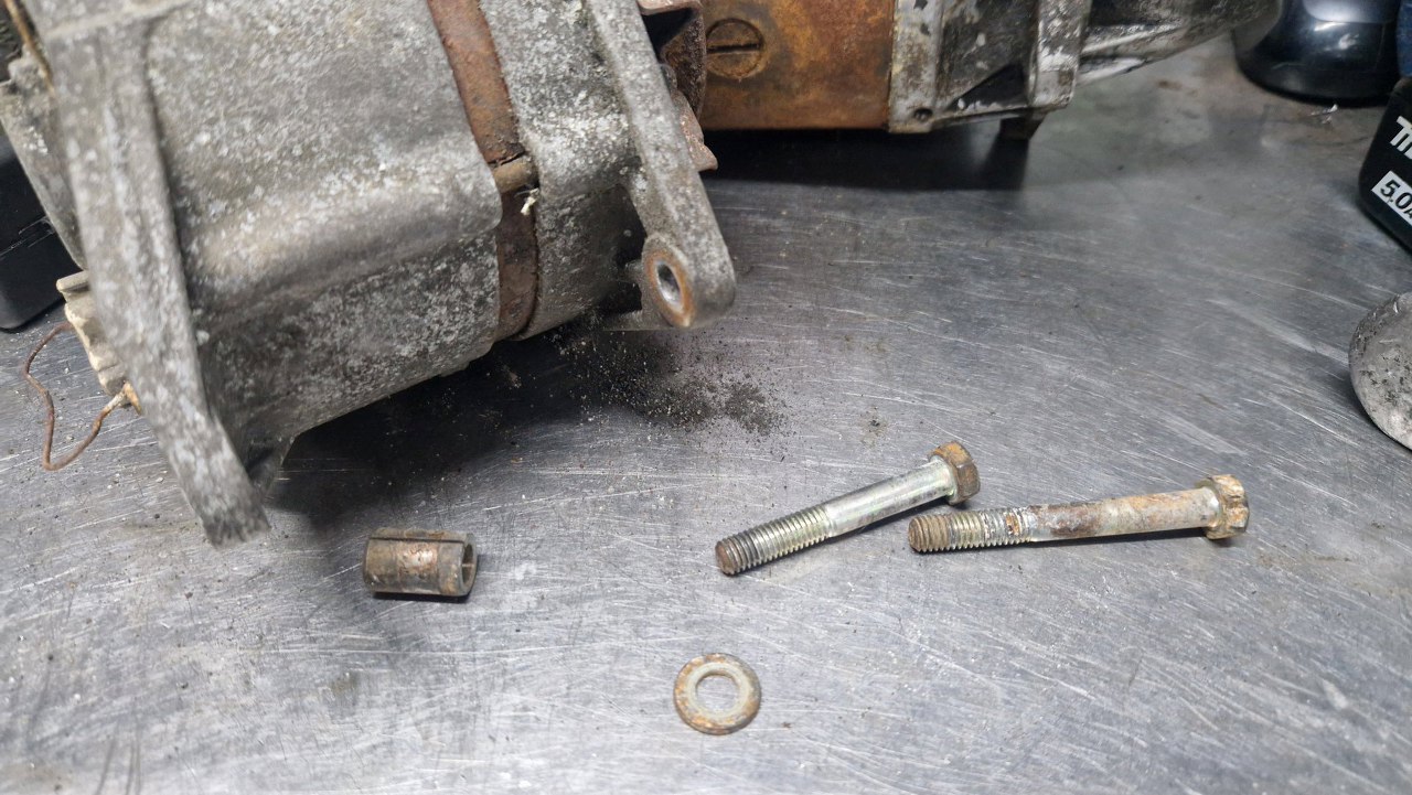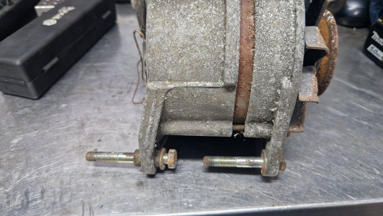 Równolegle z rozkładaniem silnika zająłem się również osprzętem, żeby wszystkie części wysłać do odnowienia (szkiełkowania, czynkowania i co tam jeszcze) w jednym pakiecie. Zacząłem od alternatora. Tu mamy widok na jego śruby mocujące.