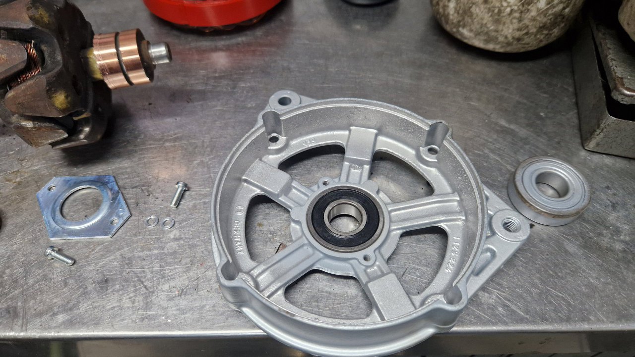 Na koniec ściągnąłem z wirnika przednią część obudowy, a z niej zdemontowałem blaszkę trzymającą łożysko. Z wirnika ściągnąłem tylne łożysko. Łożyska i tak są do wymiany, więc zostaną w swoich miejscach w obudowie na czas jej szkiełkowania, jako zabezpieczenie płaszczyzn.