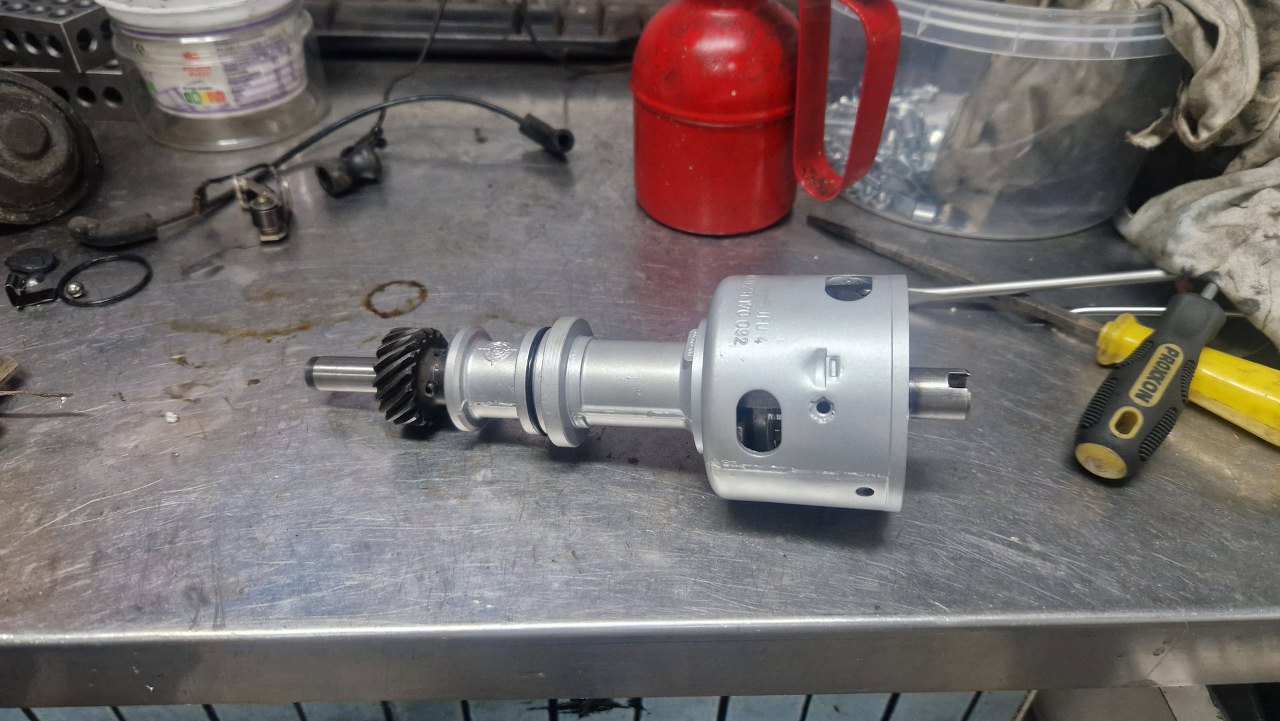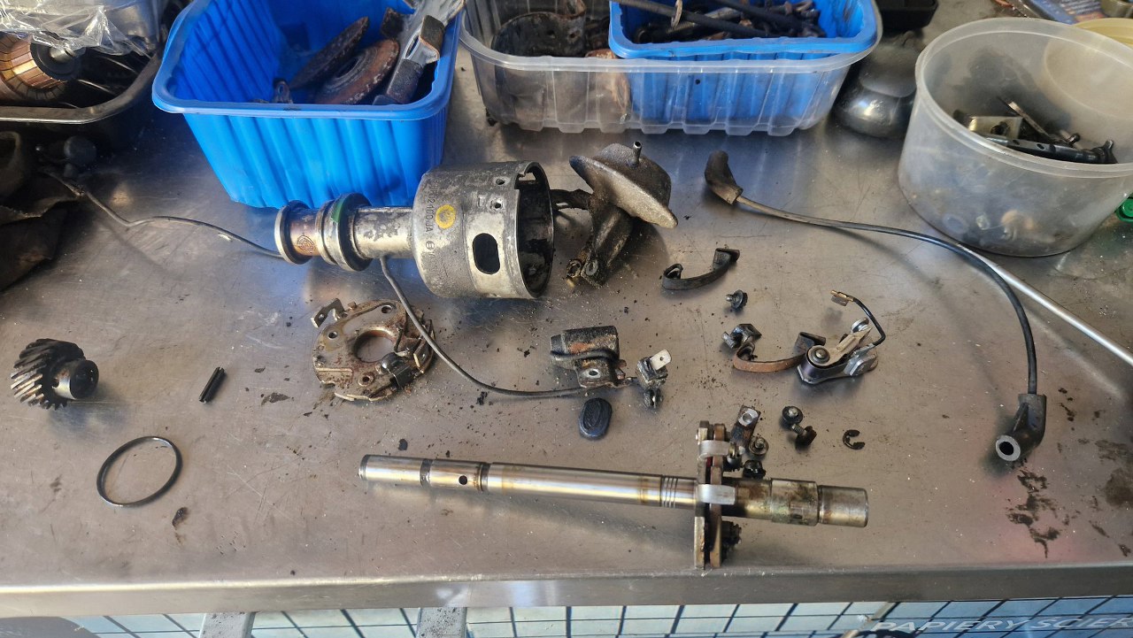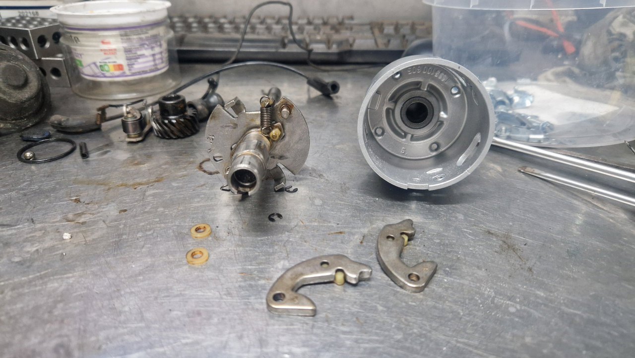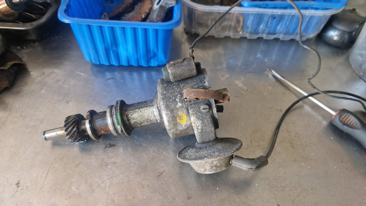 I ostatni z drobnych osprzętów - aparat zapłonowy. Dość mocno zapyziały, jak cały silnik.