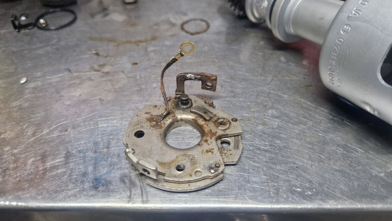 Płytka od podciśnieniowej zmiany kąta zapłonu ma zgrzaną plecionkę pomiędzy płytkami. To masa dla przerywacza zamontowanego na płytce górnej. Masa jest na płytce dolnej, poprzez śrubki mocujące ją do obudowy. Ale płytki się wobec siebie poruszają, więc masa nie jest w 100% pewna, stąd plecionka. Tu była urwana, a zgrzać nie mam jak, więc zacisnąłem na niej oczko.