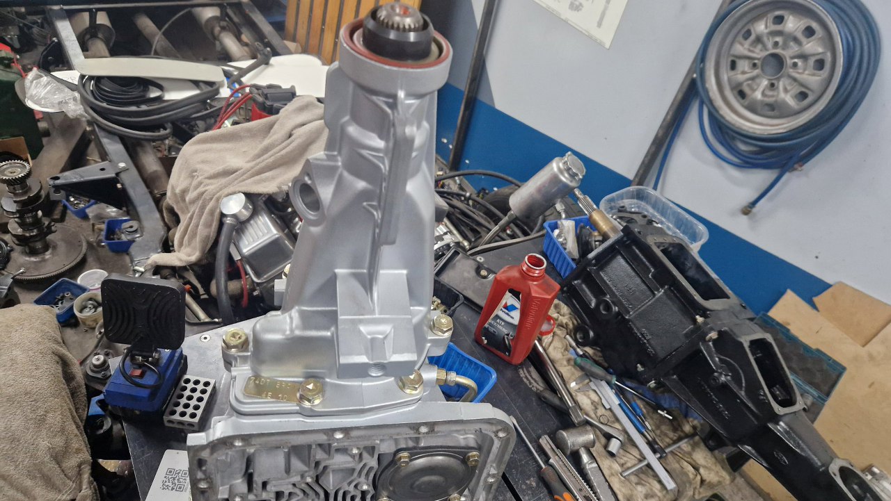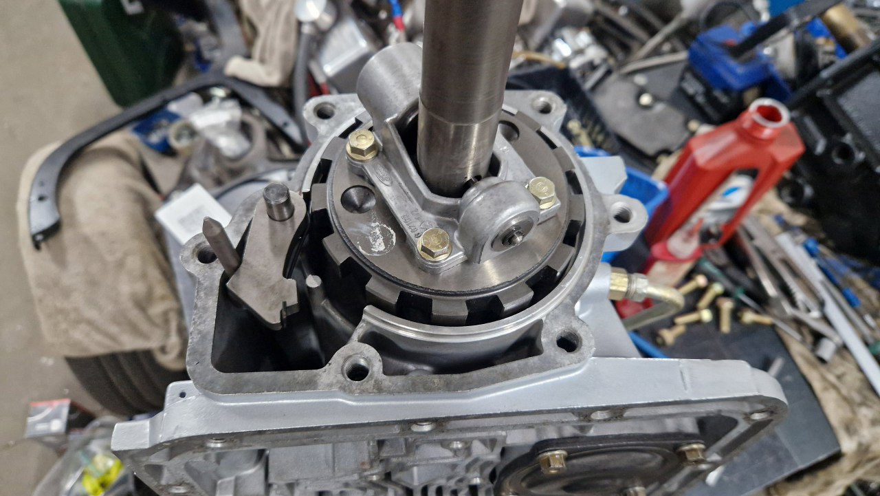 Nieco później miałem już kilka części więcej i mogłem dokończyć skrzynię. Żeby założyć ogon, trzeba jeszcze zamontować ząbek mechanizmu park. Blokuje on się o zęby na wałku wyjściowym.