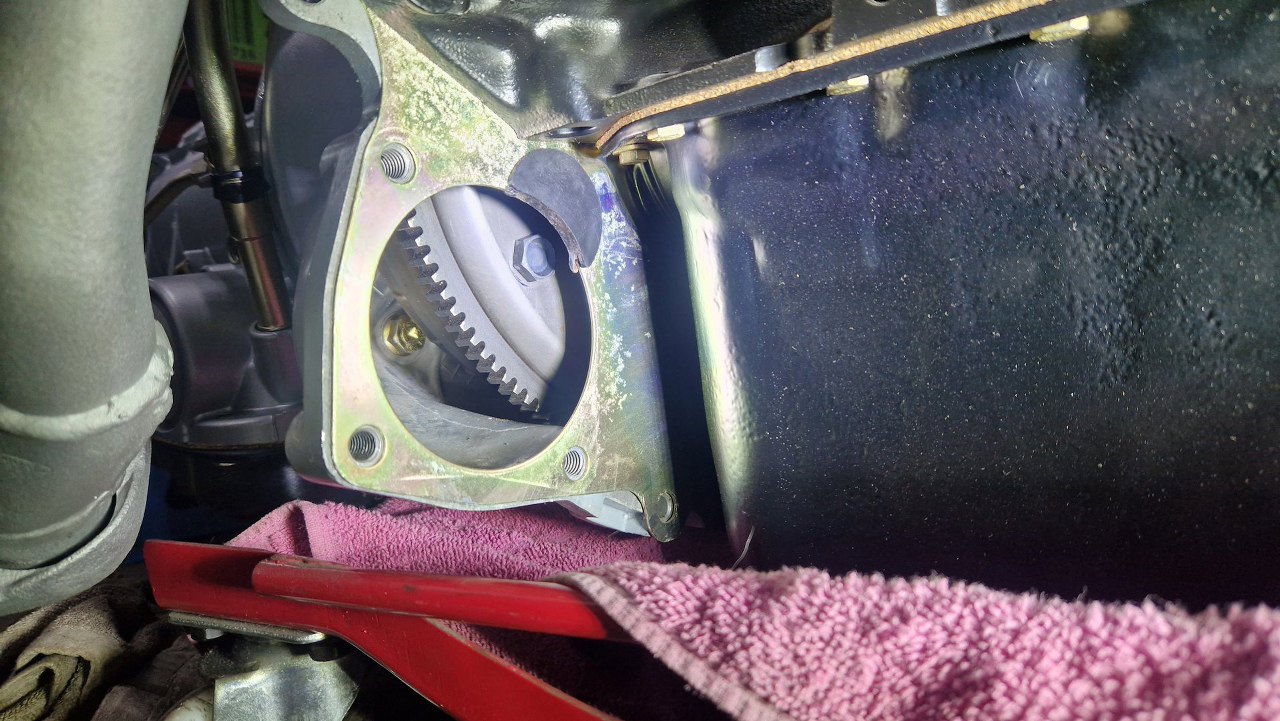 Przez otwór na rozrusznik widać otwory na śruby konwertera. Wycelowałem konwerterem w te otwory.