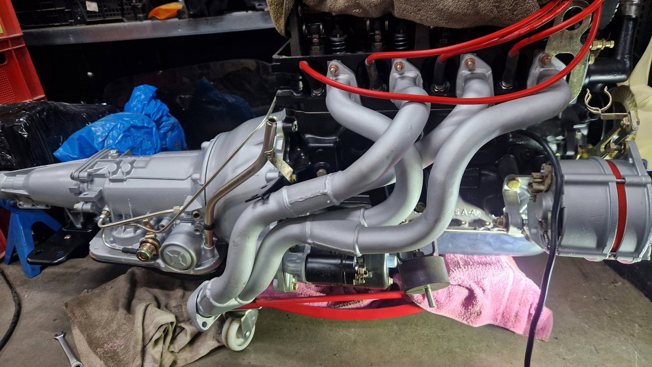 Po dźwignięciu skrzyni przykręciłem ją do bloku. Z tej strony pod śruby skrzyni przykręca się jeszcze uchwyt trzymający jedną z rur kolektora wydechowego.