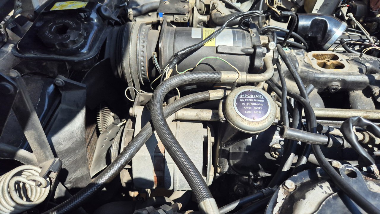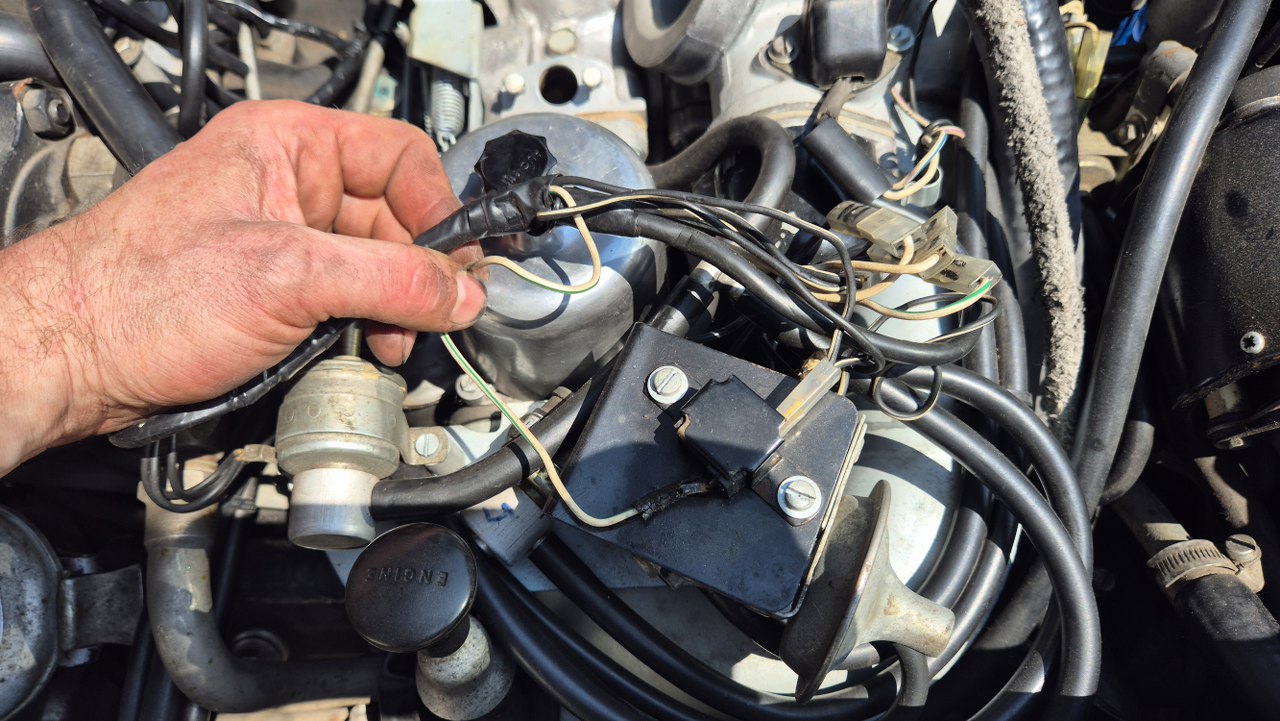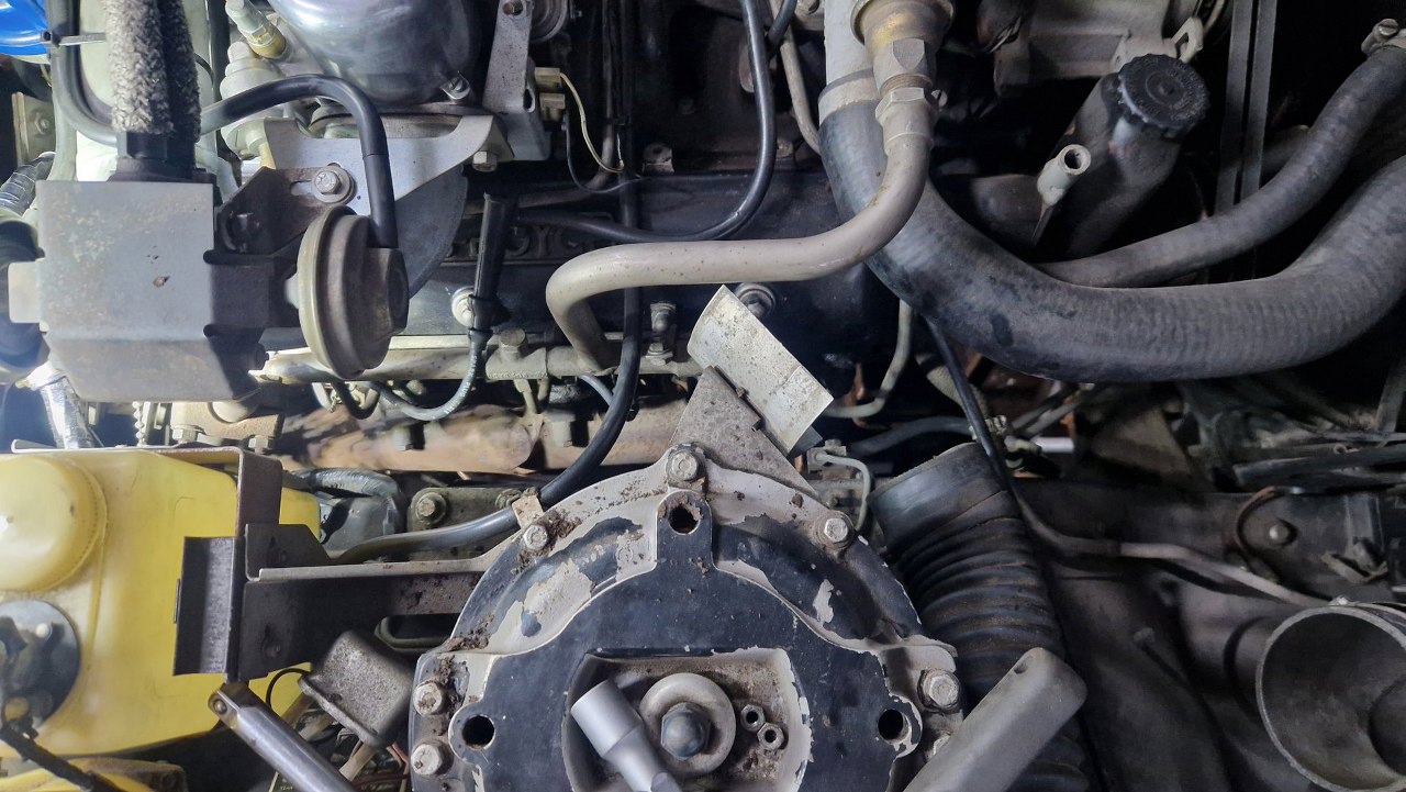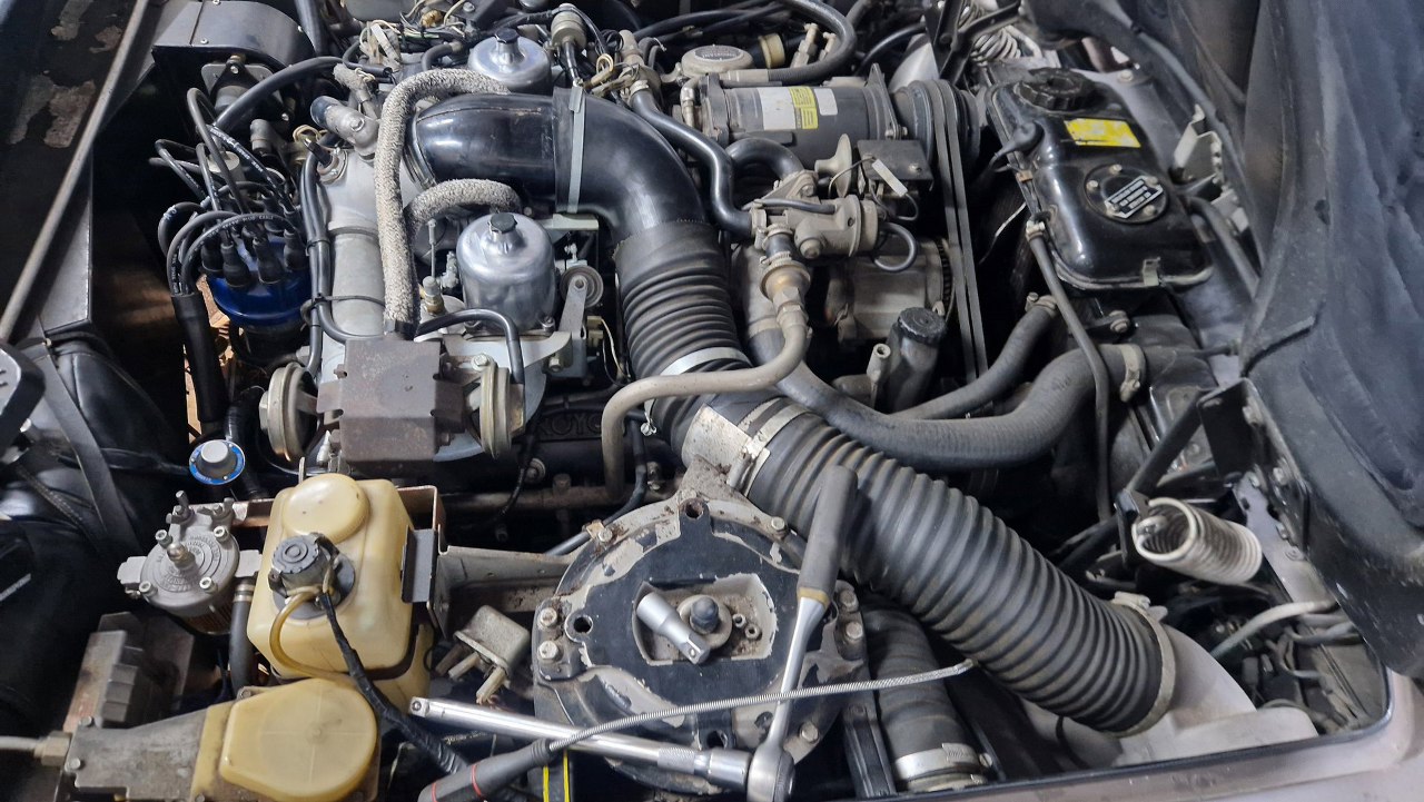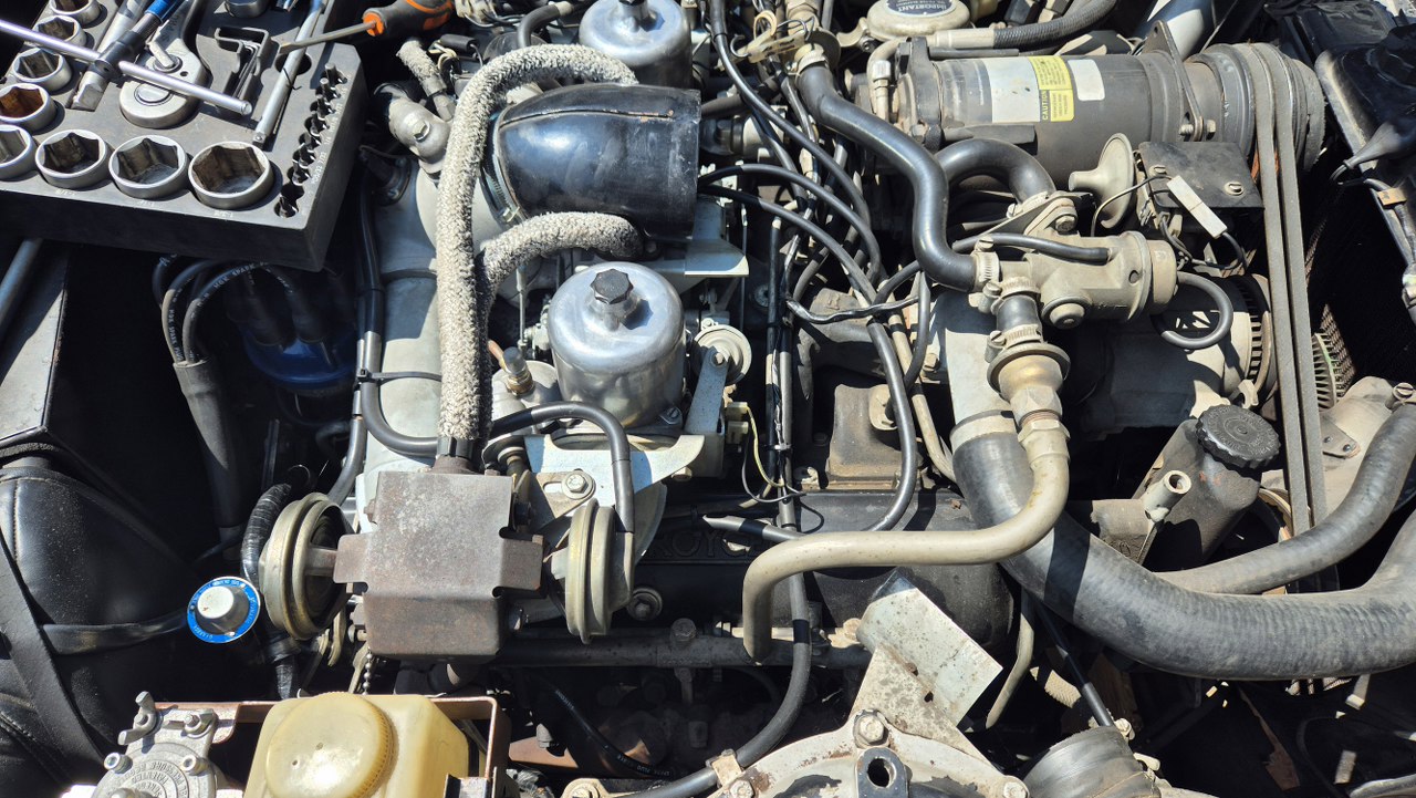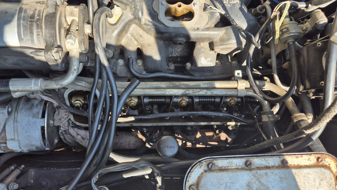 No dobra, to teraz to trudne, czyli dostanie się do pokryw zaworów. Nie ma do nich żadnego dostępu. Muszę zdemontować wszystko to, co jest na górze silnika. Dolot swoją drogą, ale jest to wersja amerykańska, więc ma dowaloną ekologię, która i tak nie działała. Demontowałem to już z amerykanców, nawet widziałem naklejki z epoki, że zdemontowanie instalacji nie powoduje przekroczenia norm emisji spalin, nawet w Kaliforni. Ekologia składa się z układu EGR, to te dwie rurki w oplocie po lewej, podłączone do zaworów sterujących i do wydechu; następnie z pompy powietrza napędzanej paskiem klinowym i dmuchającej te powietrze w kolektory wydechowe w celu rozrzadzenia spalin. To też jest sterowane zaworkami. Zaworki potrzebują podciśnienia, a sygnały strujące biorą z czujników temperatury, których przez to jest całe stado.
